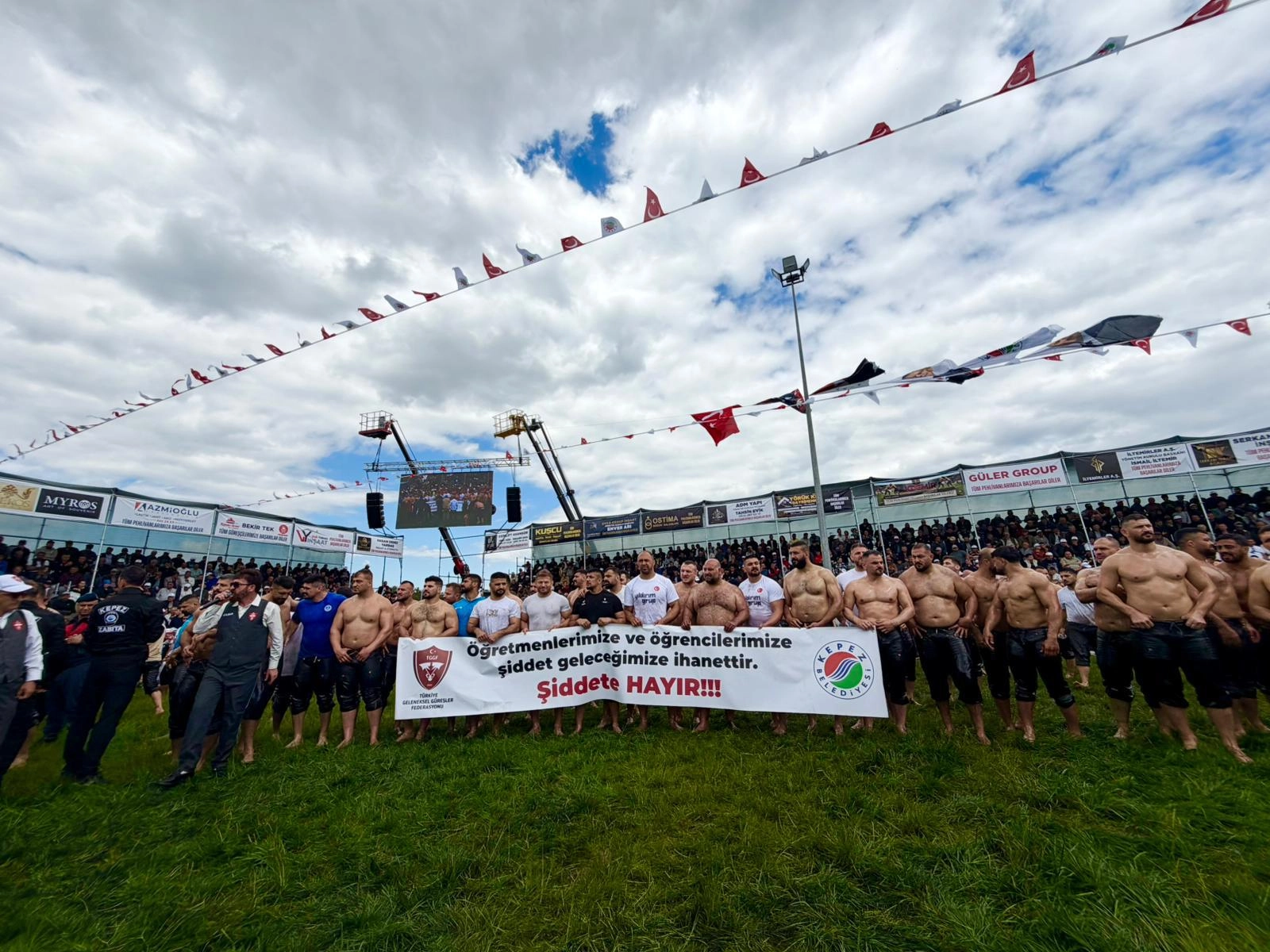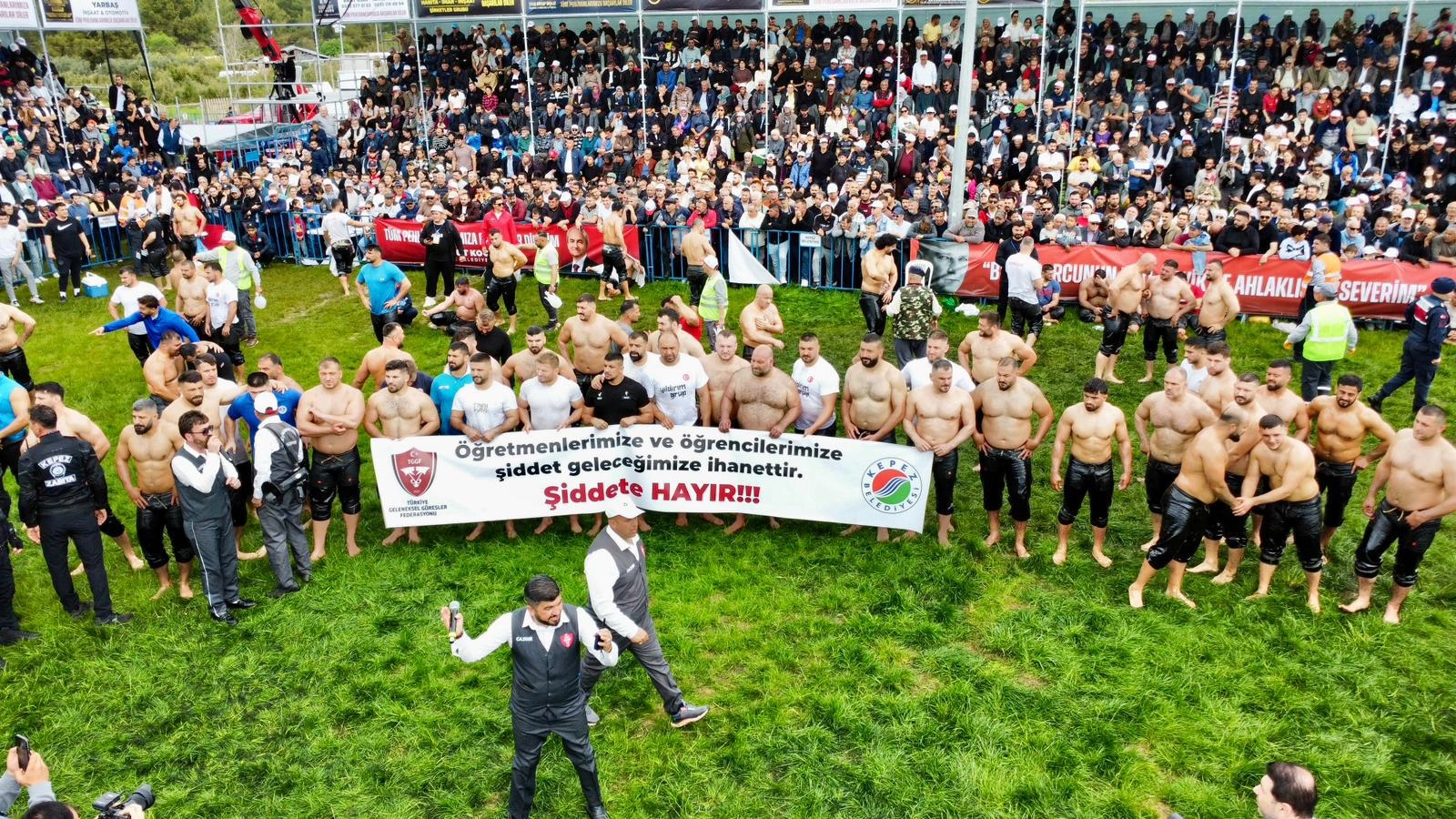 Kepez'de 12 yıl aradan sonra yeniden düzenlenen güreşlere katılan pehlivanlar, dualı çayıra "Öğretmenlerimize ve öğrencilerimize yönelik şiddet, geleceğimize ihanettir" pankartıyla çıktı.