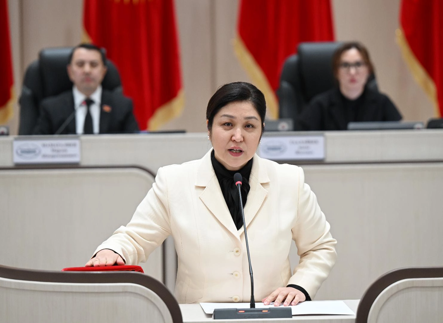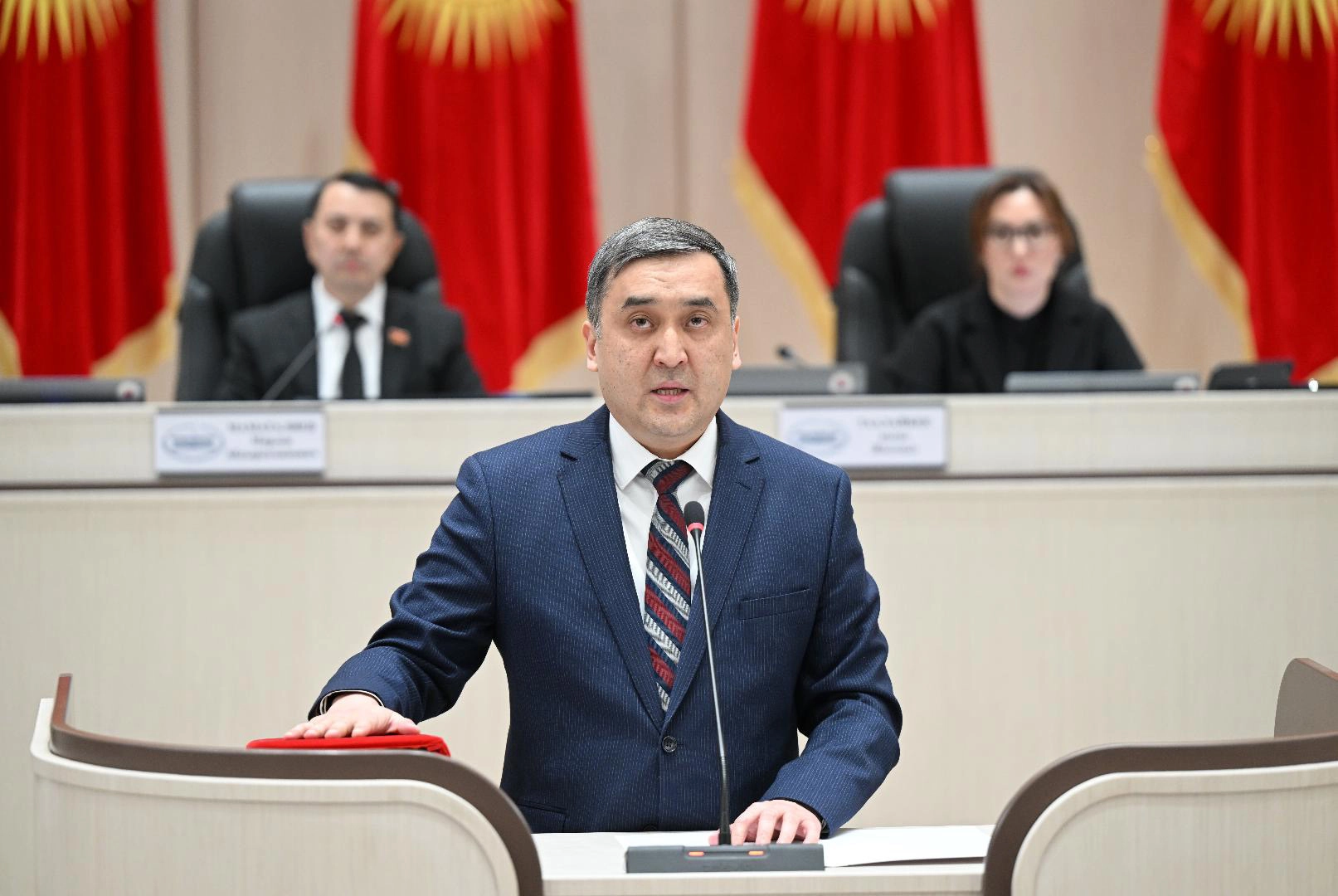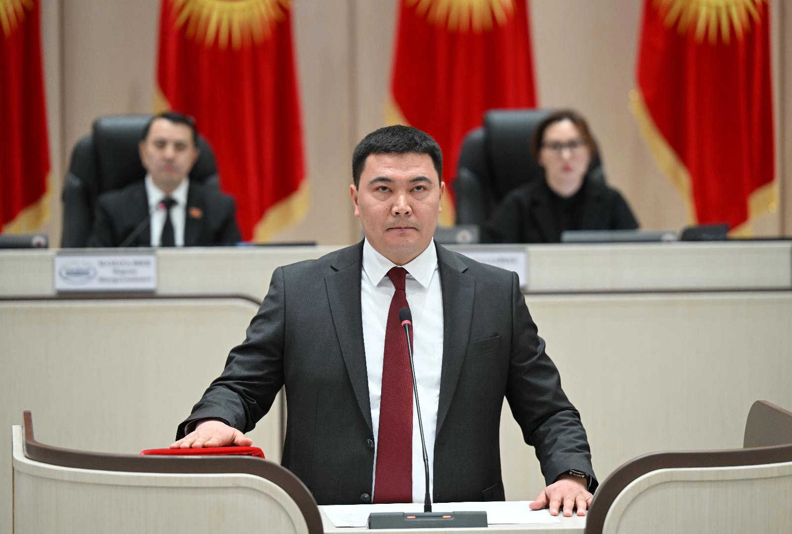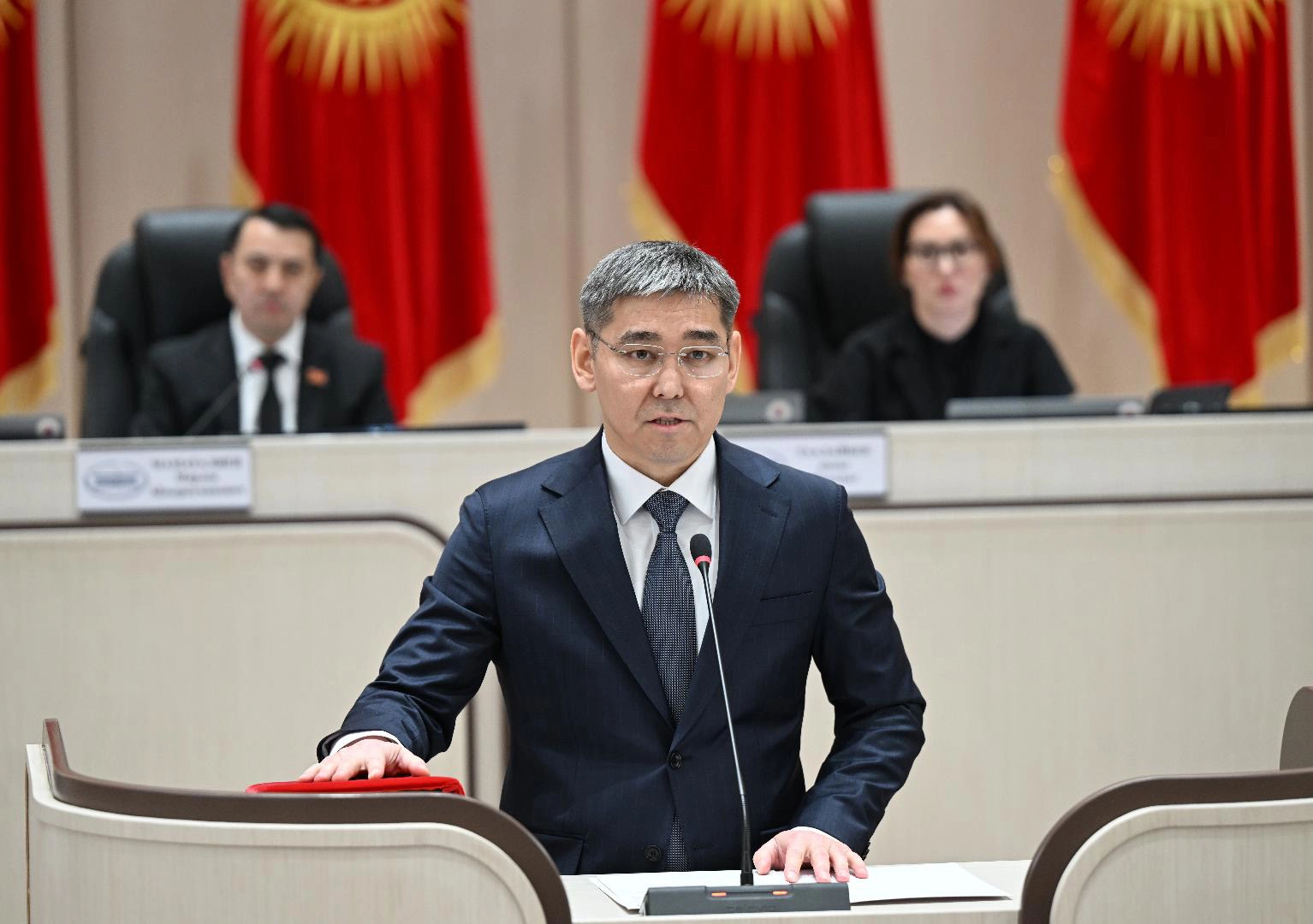 Meclis Başkanı Marlen Mamataliyev'in başkanlığında toplanan Genel Kurulda, Cumhurbaşkanı Caparov tarafından atanan yeni kabine üyeleri için yemin töreni düzenlendi.