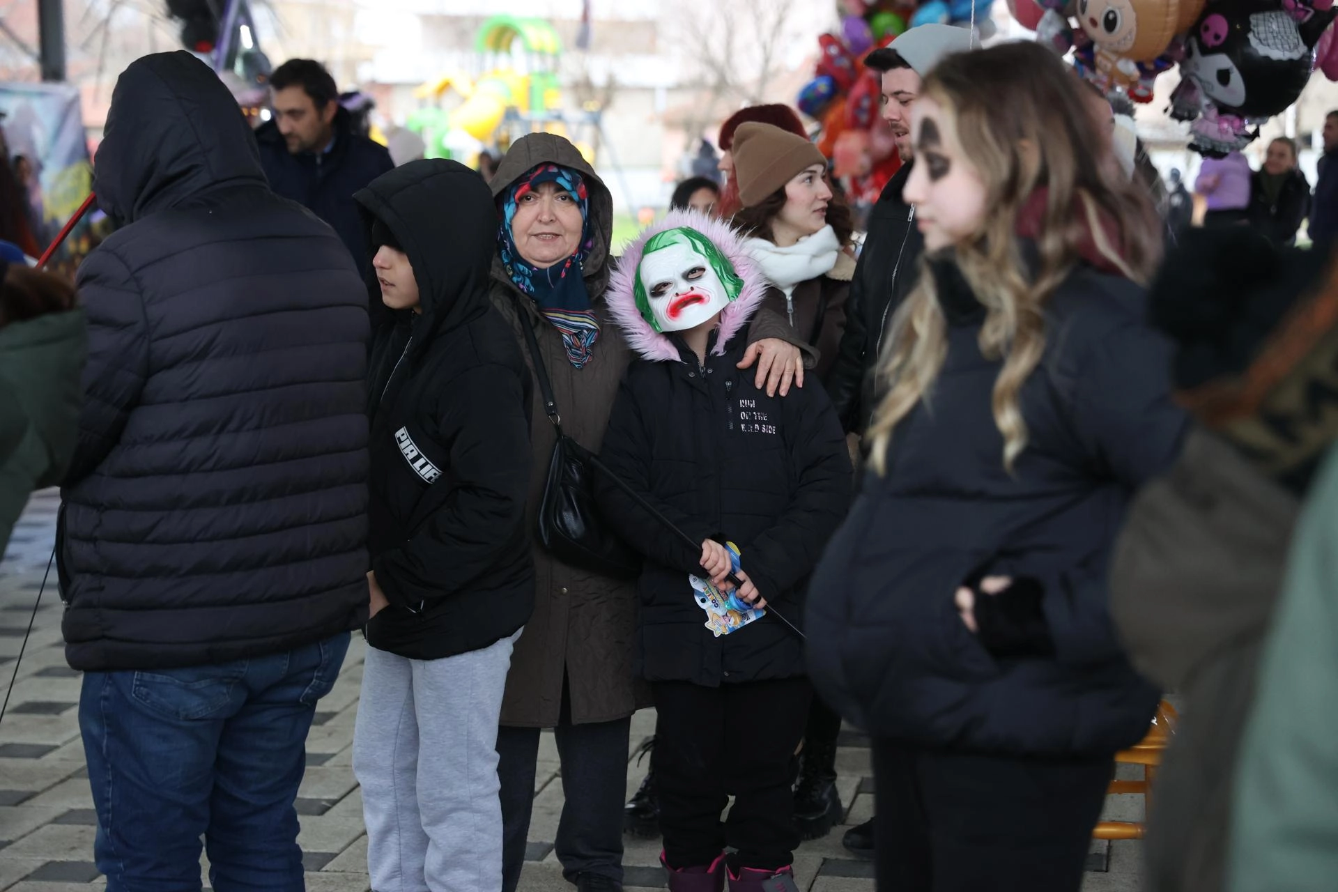 Kurulan stantlarda yüzlerini boyayan katılımcılar maskeyle beyaz ve kırmızı pelerin taktı.