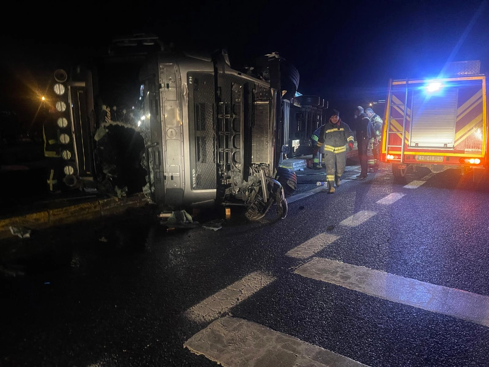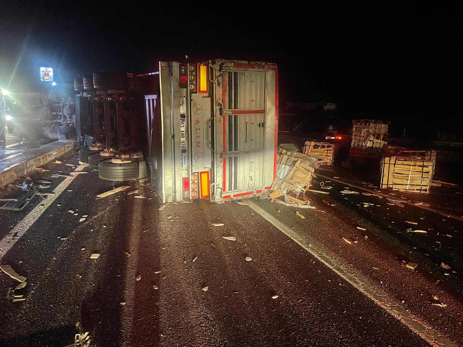 Kazanın etkisiyle tır yol ortasına devrildi. İhbar üzerine bölgeye sağlık, itfaiye, polis ve jandarma ekipleri sevk edildi.