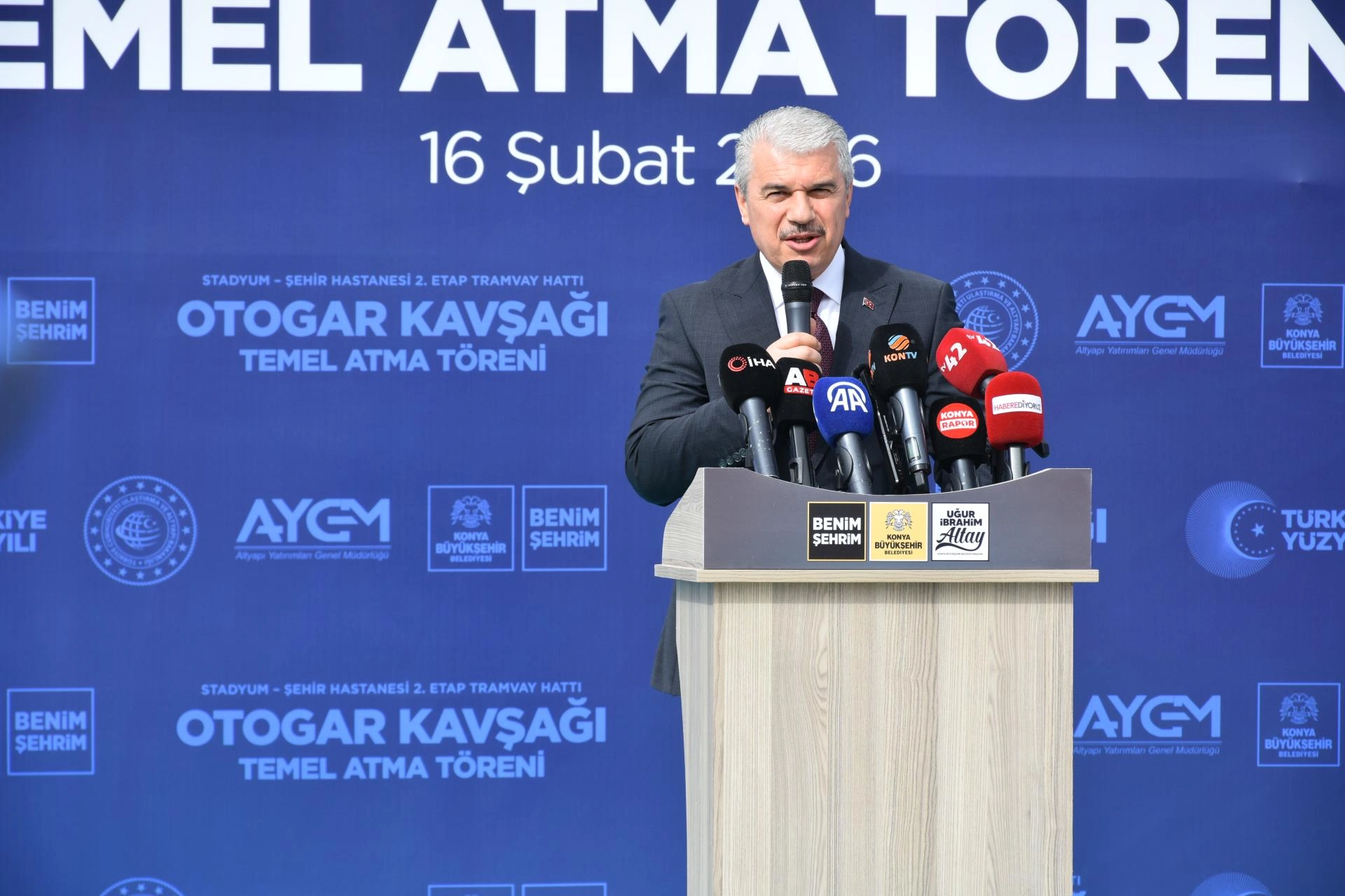 KONYA (AA) - Konya Büyükşehir Belediyesi ile Ulaştırma ve Altyapı Bakanlığı Altyapı Yatırımları Genel Müdürlüğü işbirliğinde, Şehir Hastanesi-Stadyum Tramvay Hattı'nın 2. etap Otogar Kavşağı temeli atıldı.