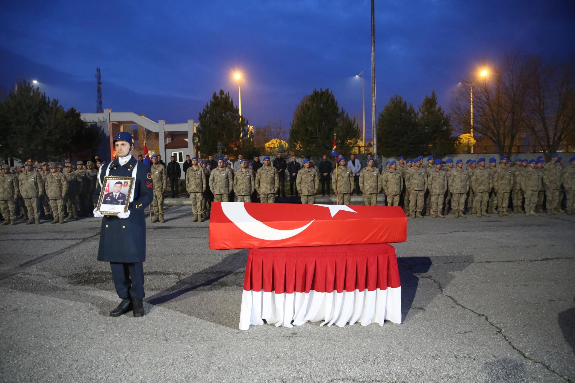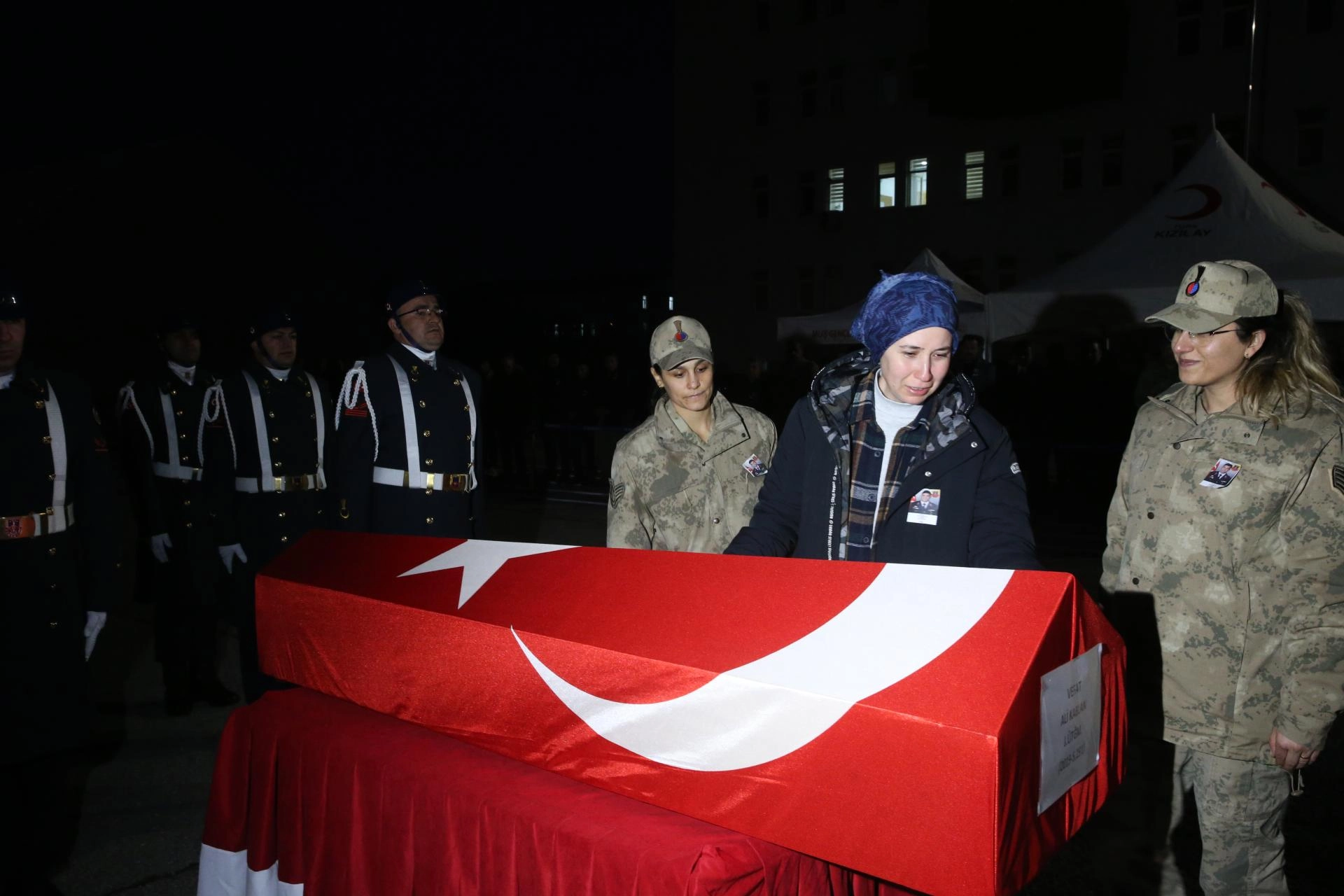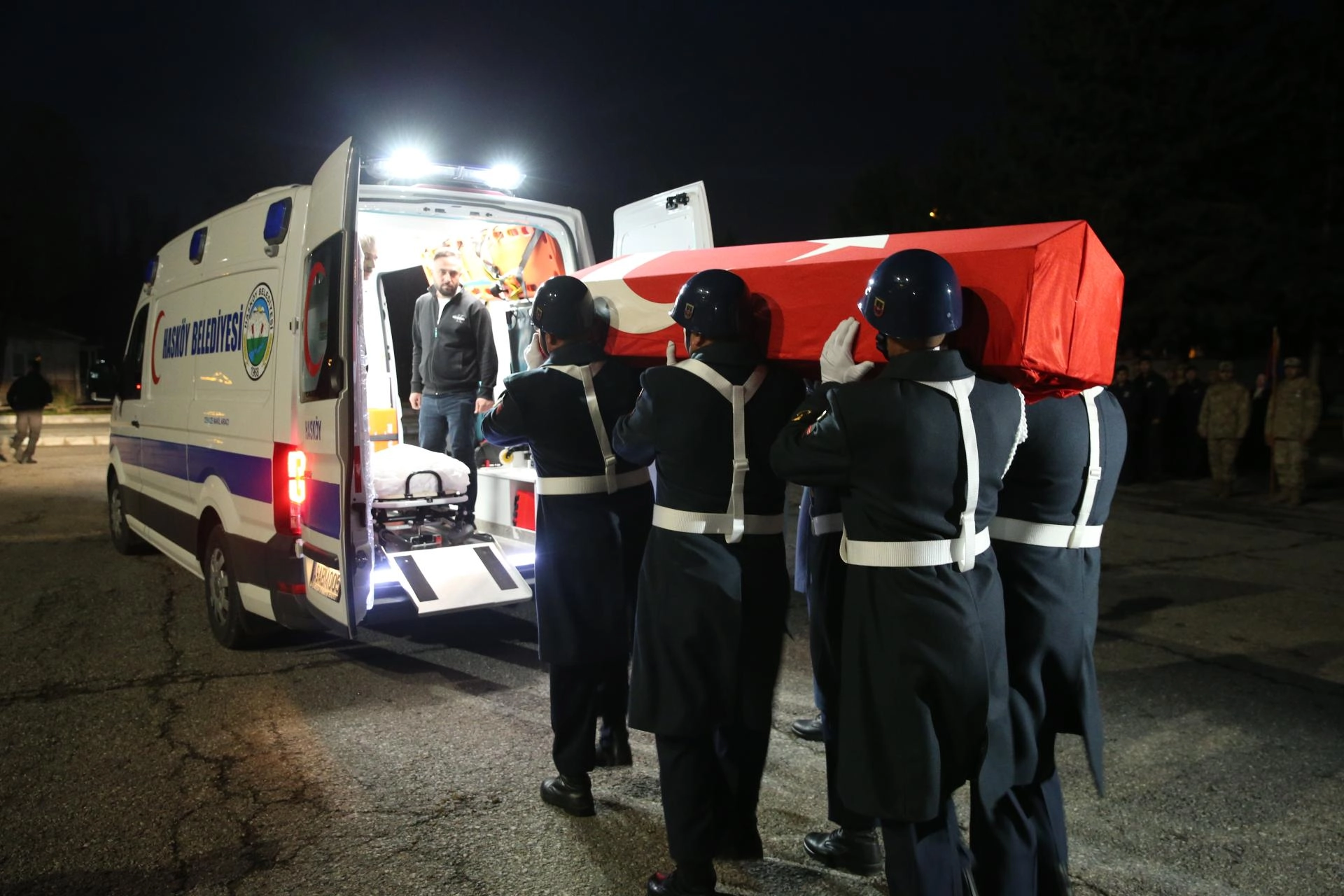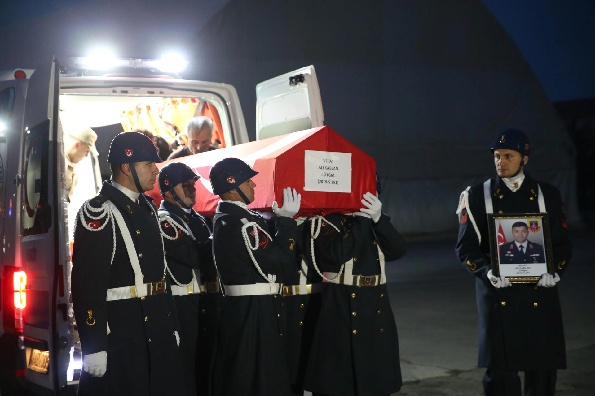 Muş Devlet Hastanesi'nde otopsi işlemleri tamamlanan Kablan'ın Türk bayrağına sarılı naaşı, İl Jandarma Komutanlığına getirildi.