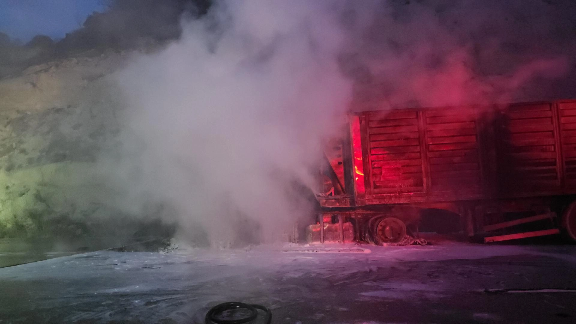 KÜTAHYA (AA) - Kütahya'da seyir halindeyken yanan silis kumu yüklü tır, itfaiye ekiplerince söndürüldü.