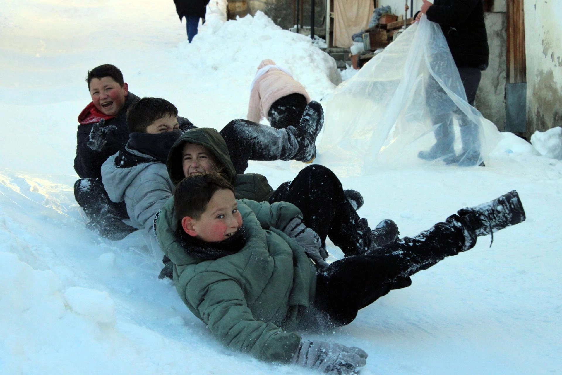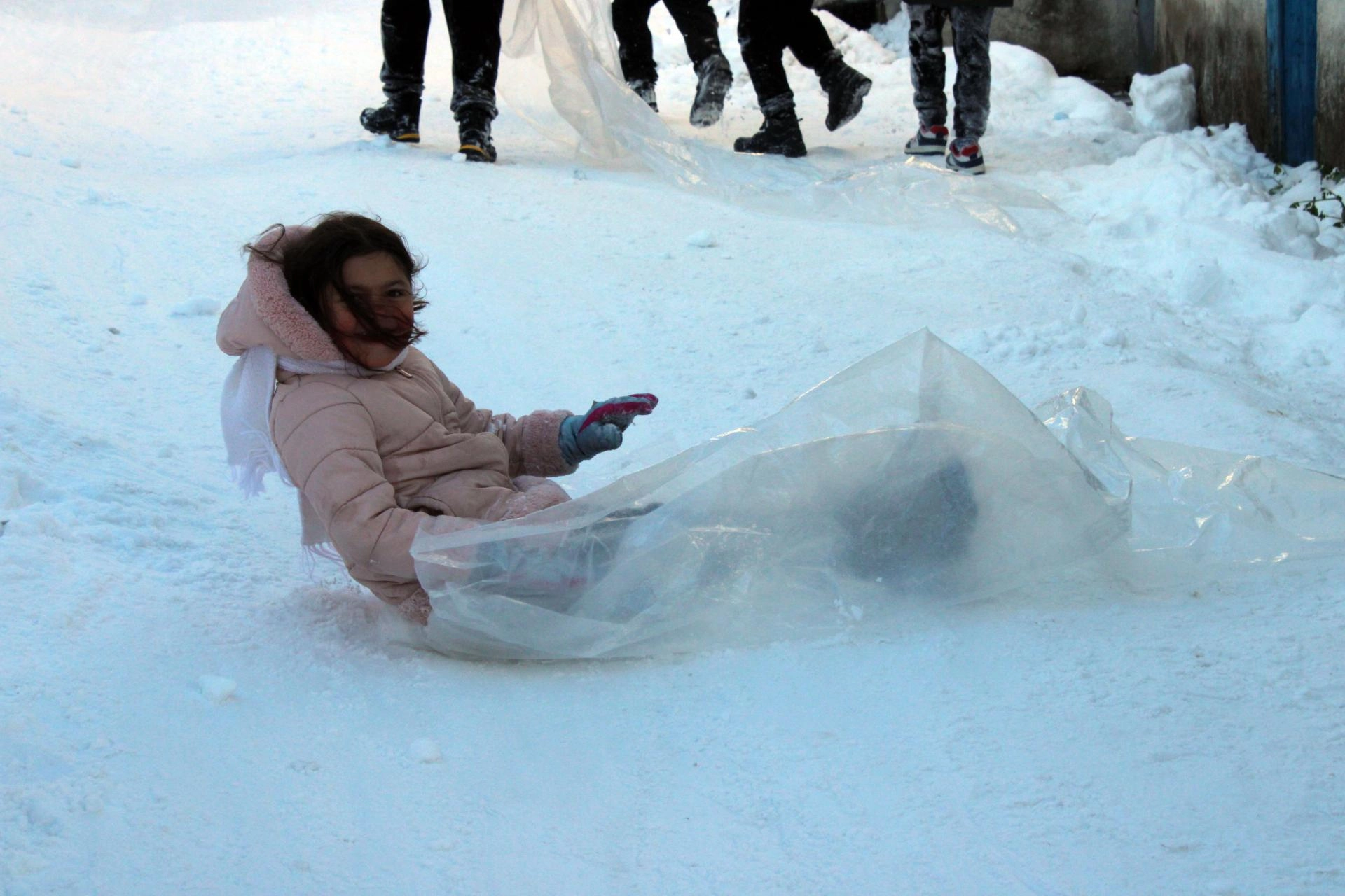 Zaman zaman aynı poşetin üzerine oturarak birlikte kayan çocuklar, büyük mutluluk yaşadı.