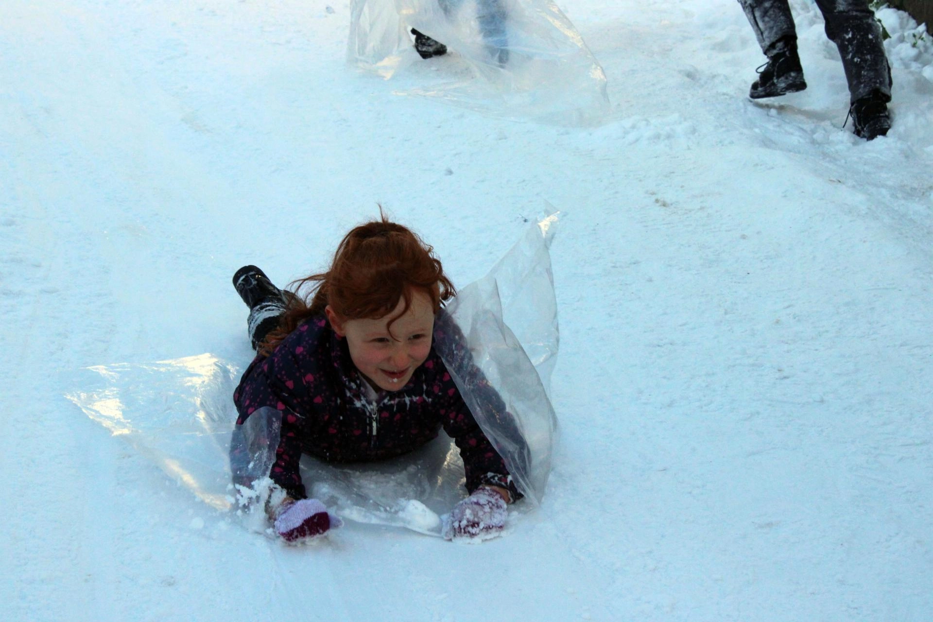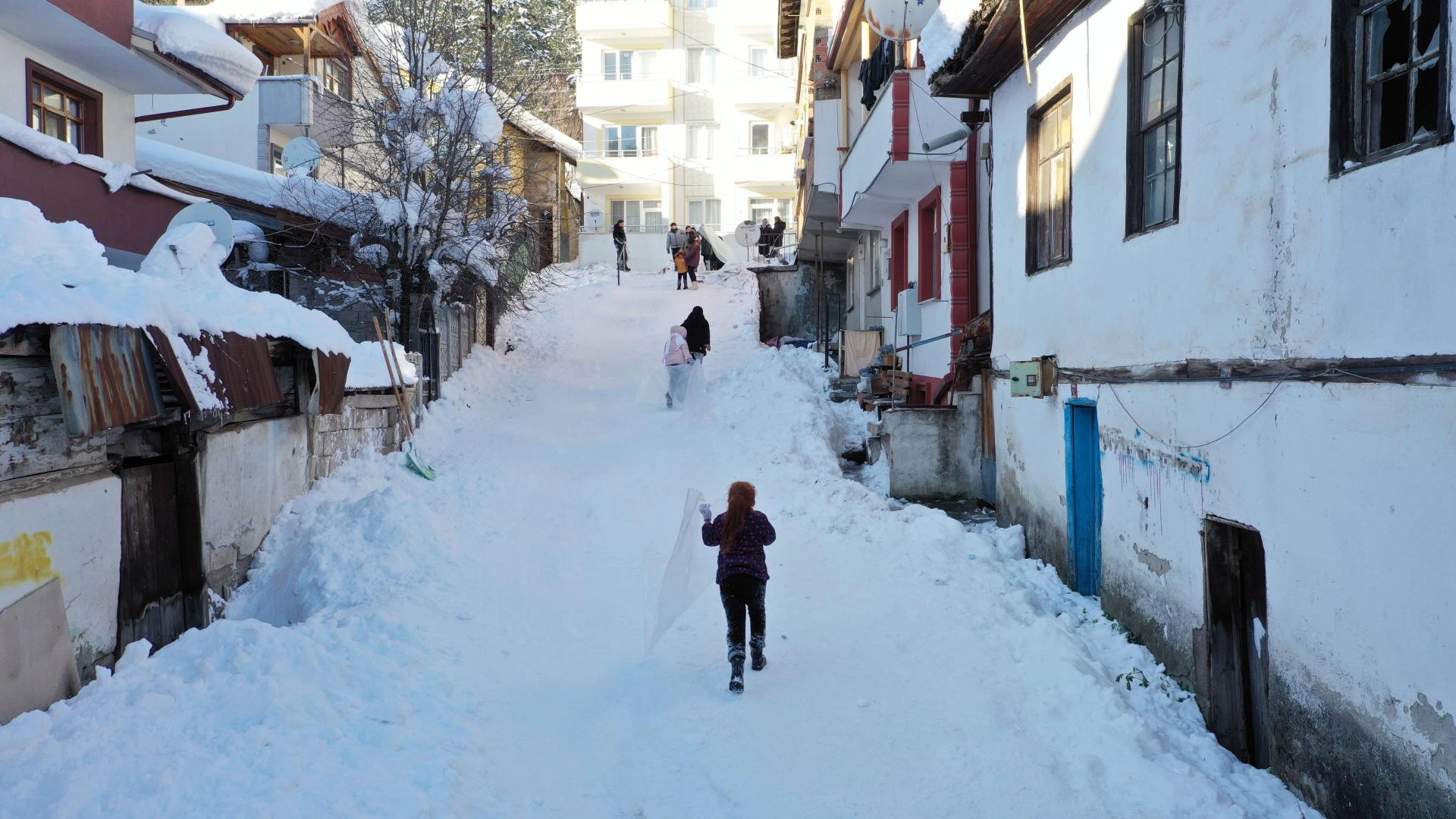 Şehitler Gaziler Parkı'nın yanındaki Karanfil Sokağı'nın dik yollarını kendi imkanları ile düzelterek kızak pistine çeviren mahallenin çocukları, poşet ve naylonlarla kayarak keyifli anlar yaşadı.