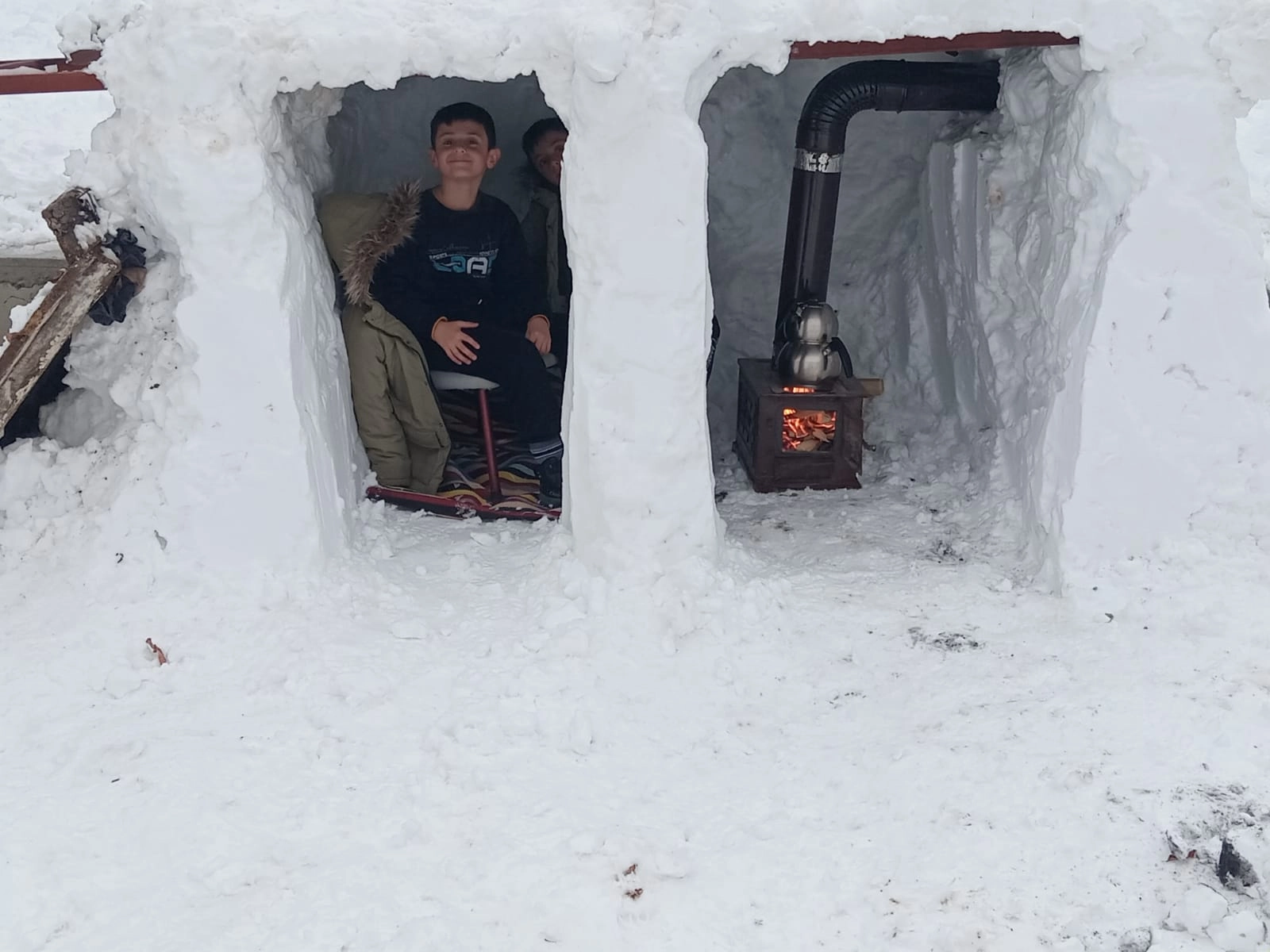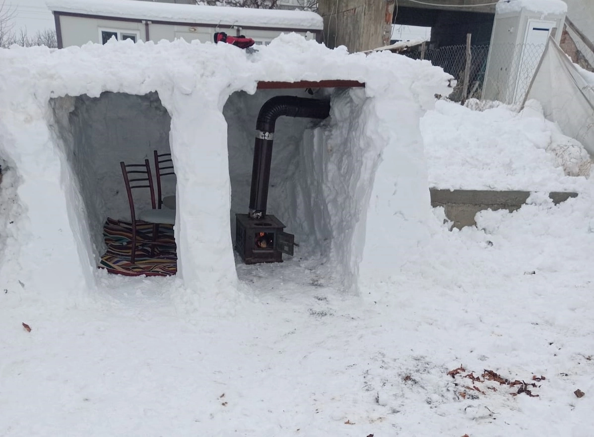 İlçe merkezindeki yağışın ardından Mesut Yaman, yarıyıl tatilindeki çocukları Yasir Faruk ve Muhammed Fatih için kardan ev yapmaya karar verdi. Yaman, yaptığı eve halı serip soba da kurdu.
