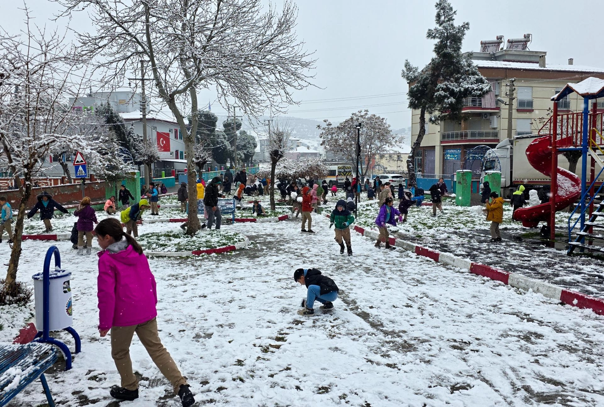 Yılın ilk kar yağışını sevinçle karşılayan Rafet Üçelli İlkokulu öğrencileri, teneffüste okul bahçesi ve yanındaki parkta karın tadını çıkardı. Öğretmenleriyle kar topu oynayan öğrenciler, kardan adam yaptı.