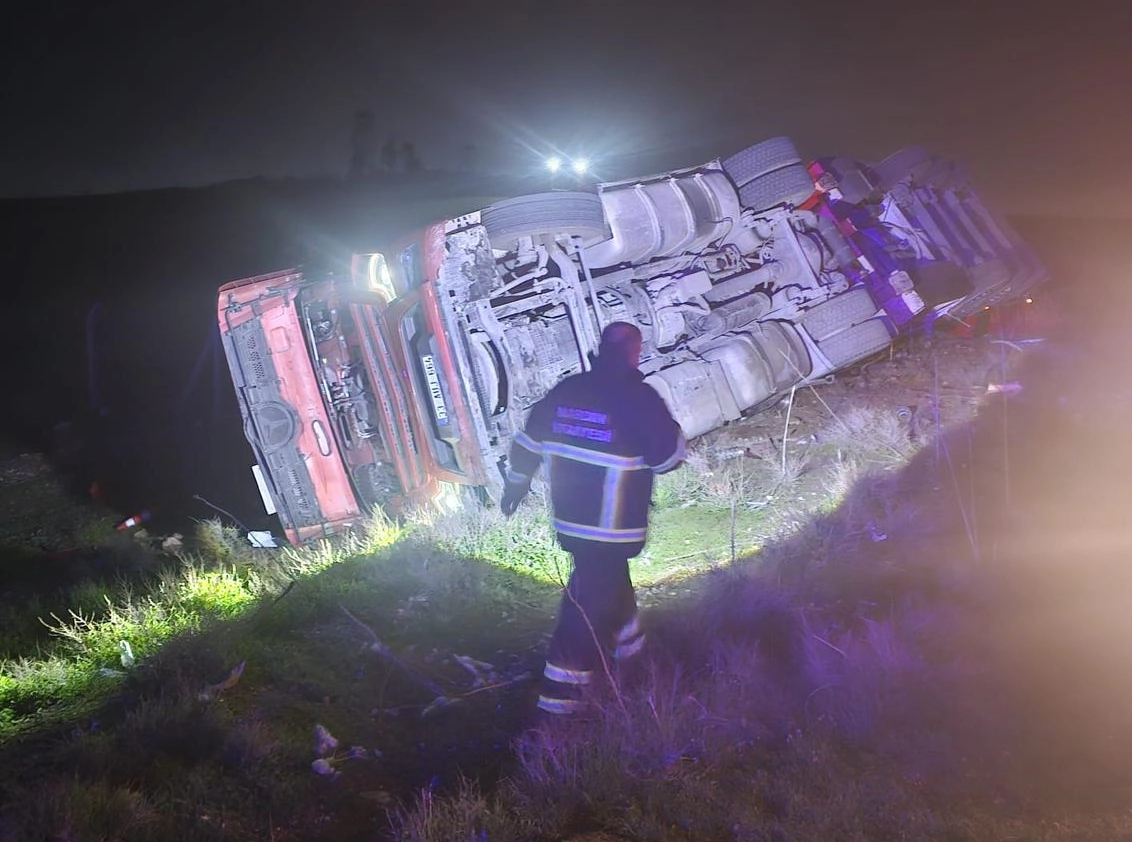 Sürücüsünün kimliği henüz öğrenilemeyen 33 AUJ 664 plakalı tır, Demirtepe Mahallesi'nde devrildi.