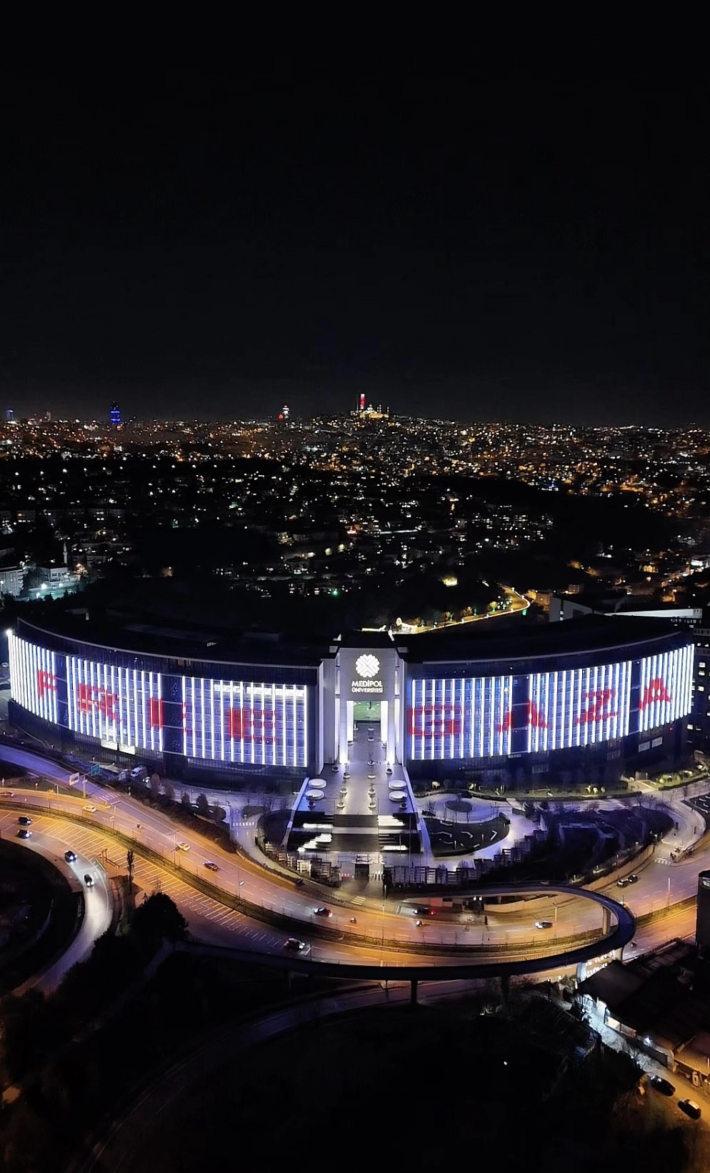 İSTANBUL (AA) - Medipol Üniversitesi, kampüs binasındaki LED ekranda Filistin'e destek mesajları vererek İsrail'in Gazze'de uyguladığı soykırıma dikkati çekti.