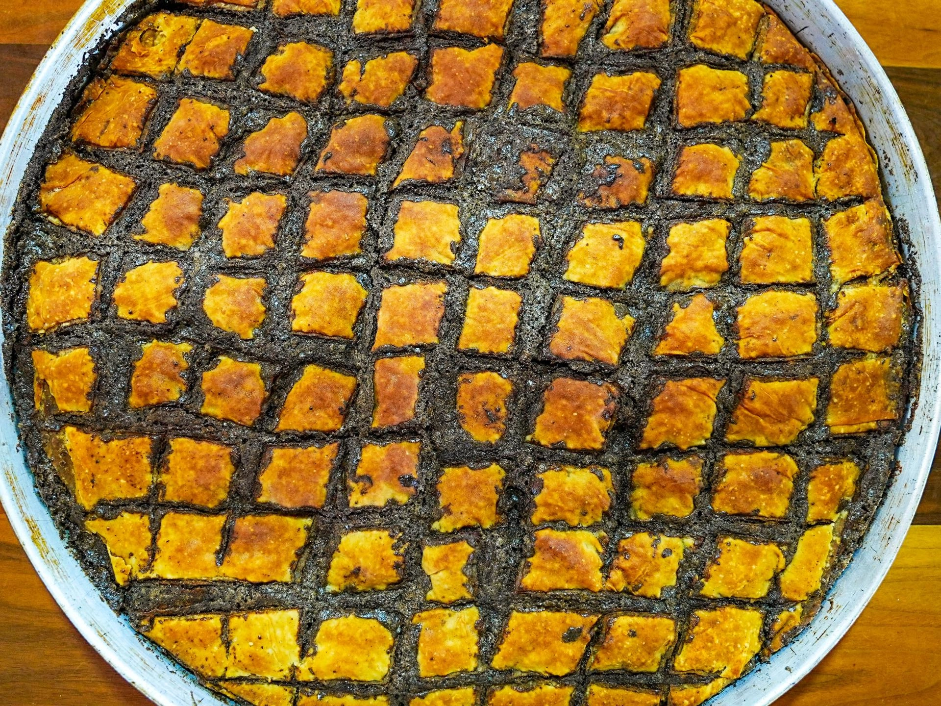 1. Derin bir kaba siyah haşhaş, susam ezmesi, toz şeker ve kabartma tozu konulduktan sonra üzerine suyu eklenir.