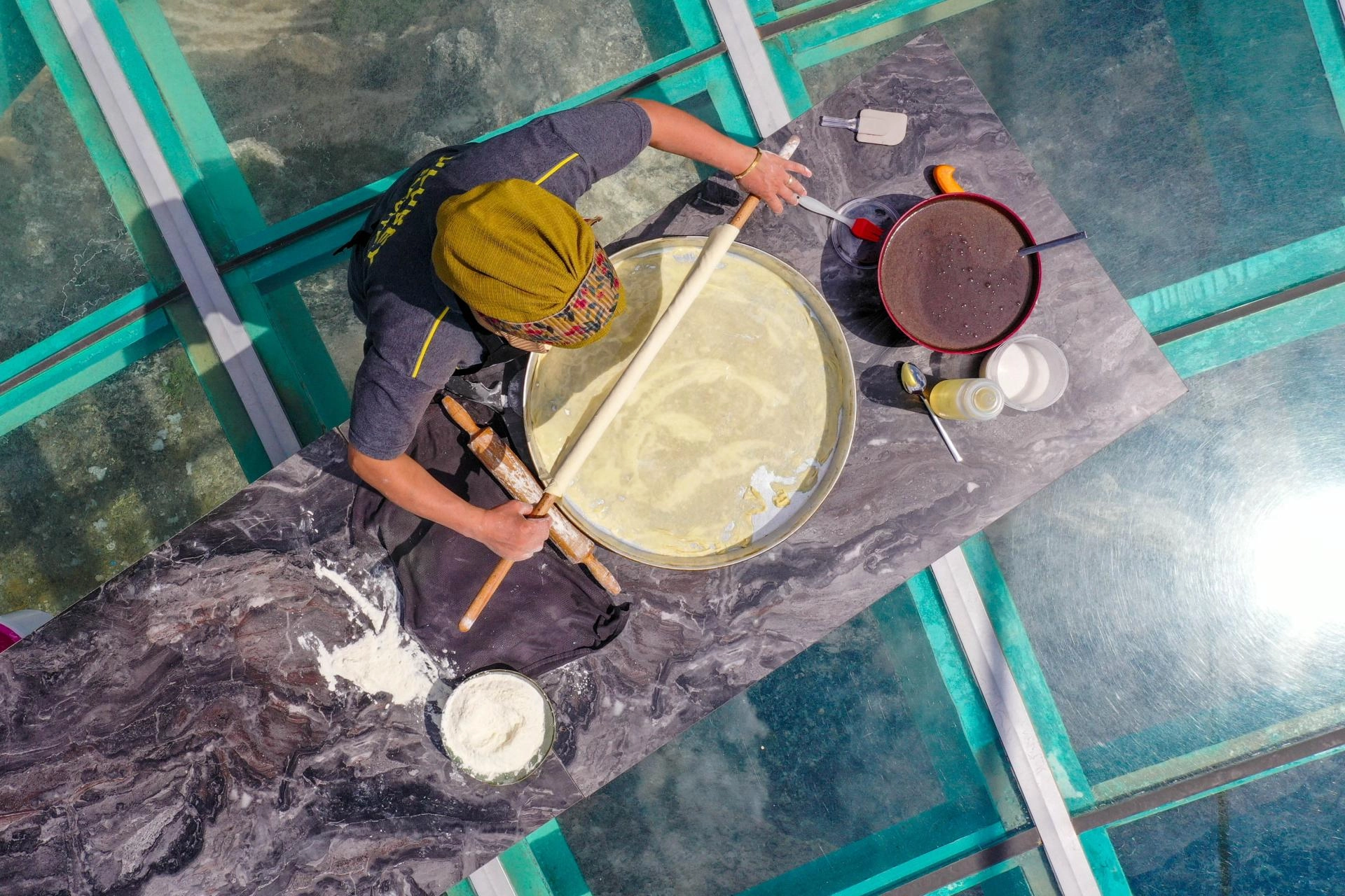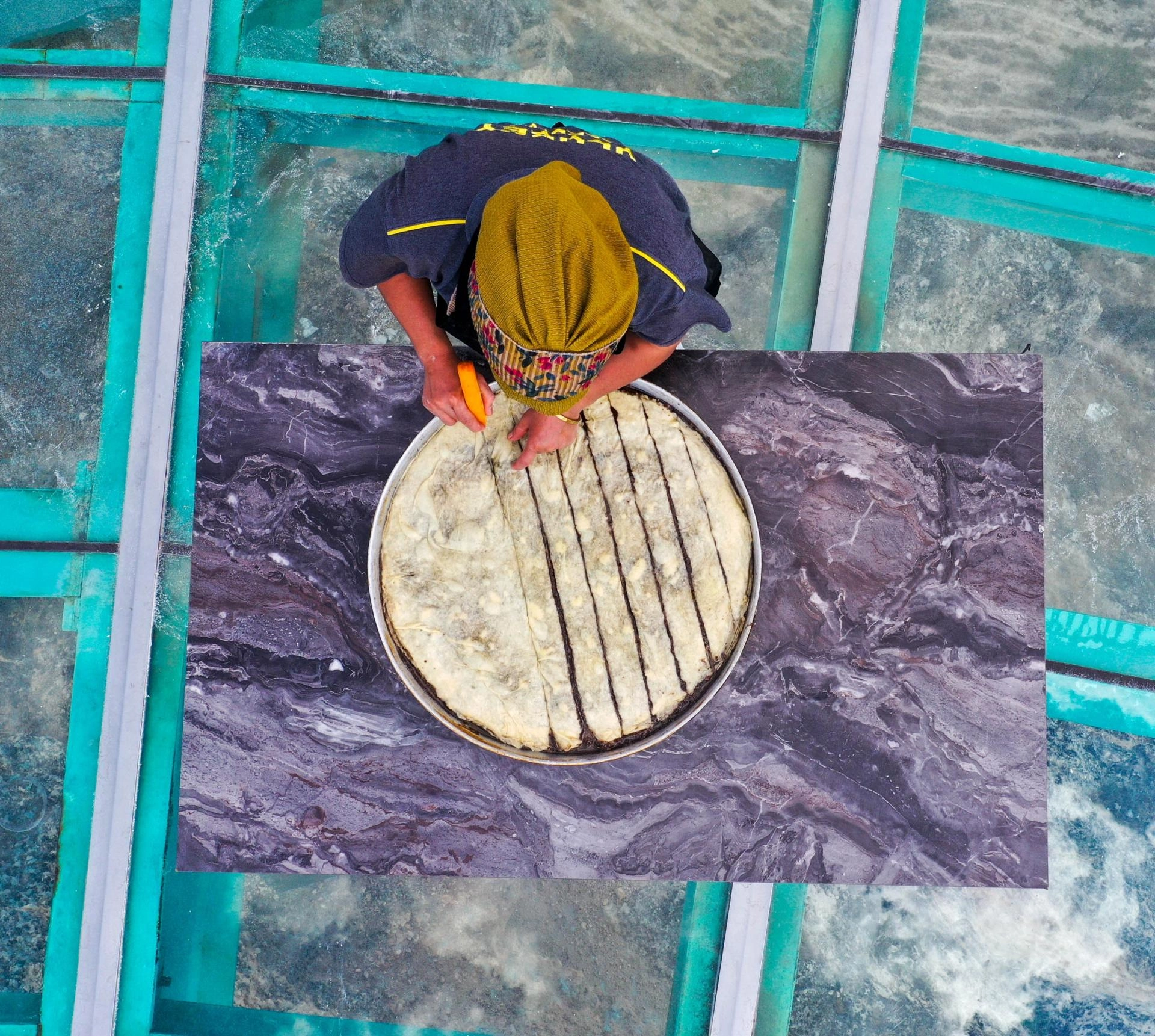 3. Eşit parçaya bölünen hamurlar ince birer yufka şeklinde açılır.