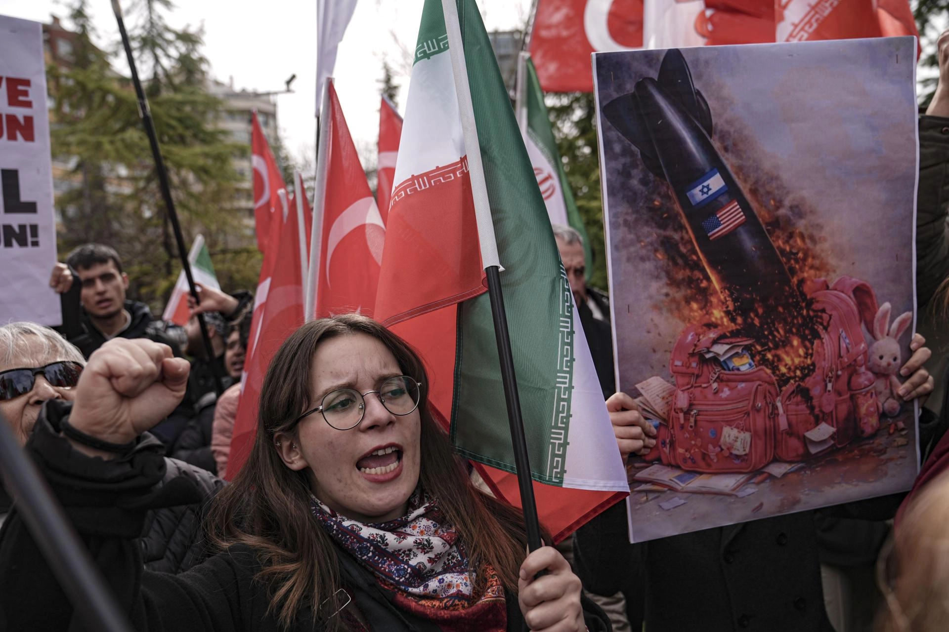 Ellerinde Türk ve İran bayraklarıyla toplanan grup, sloganlar atarak İran'a yönelik saldırıları protesto etti.