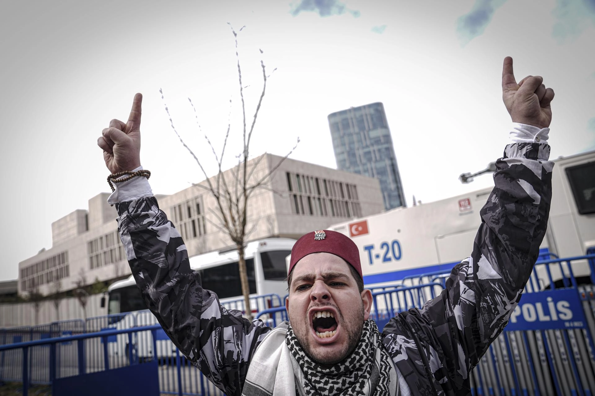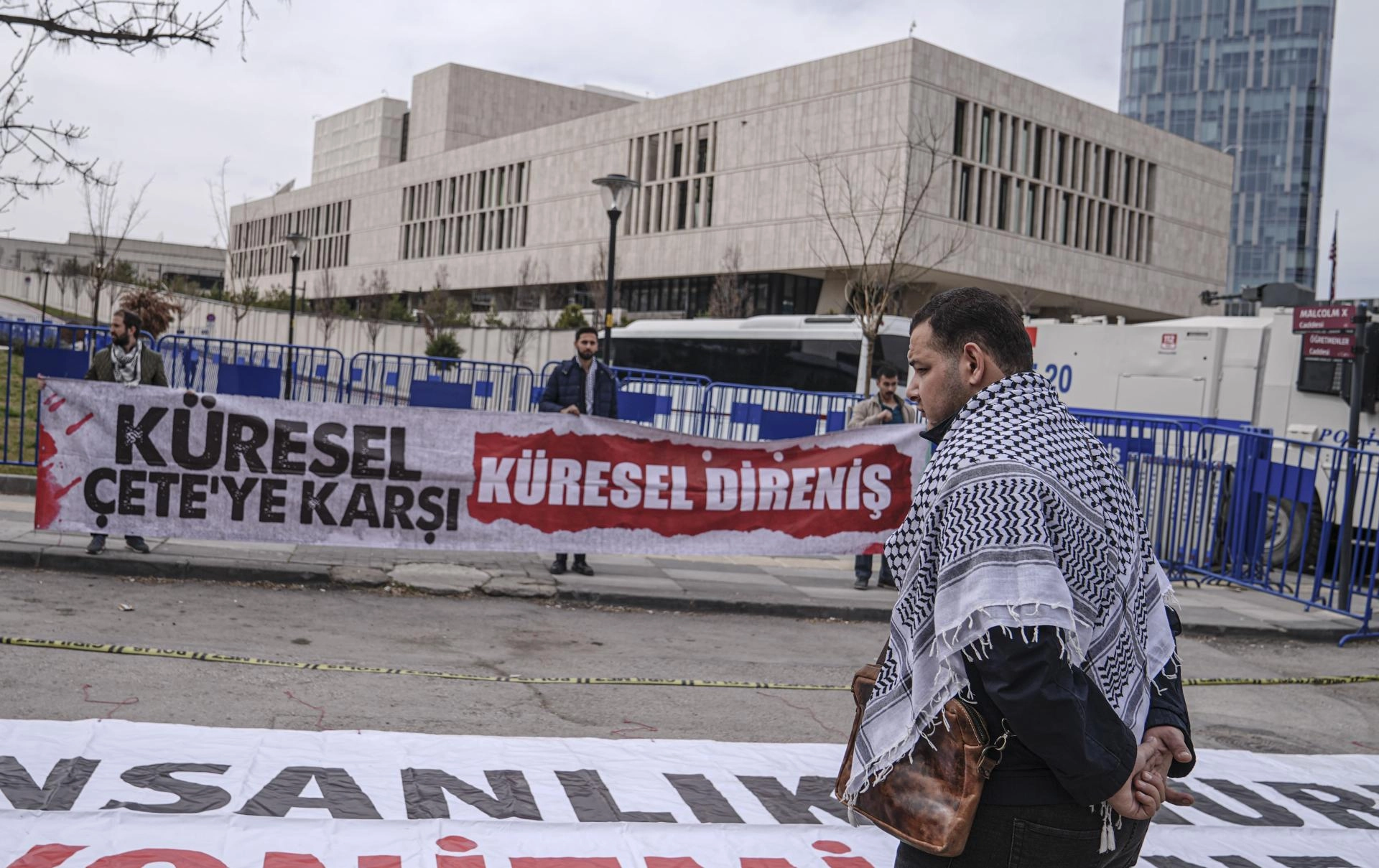 Büyükelçilik önünde toplanan grup, "Küresel çeteye karşı küresel direniş", "İnsanlık onuru siyonizmi yenecek" yazılı pankartlar açarak sloganlar attı.