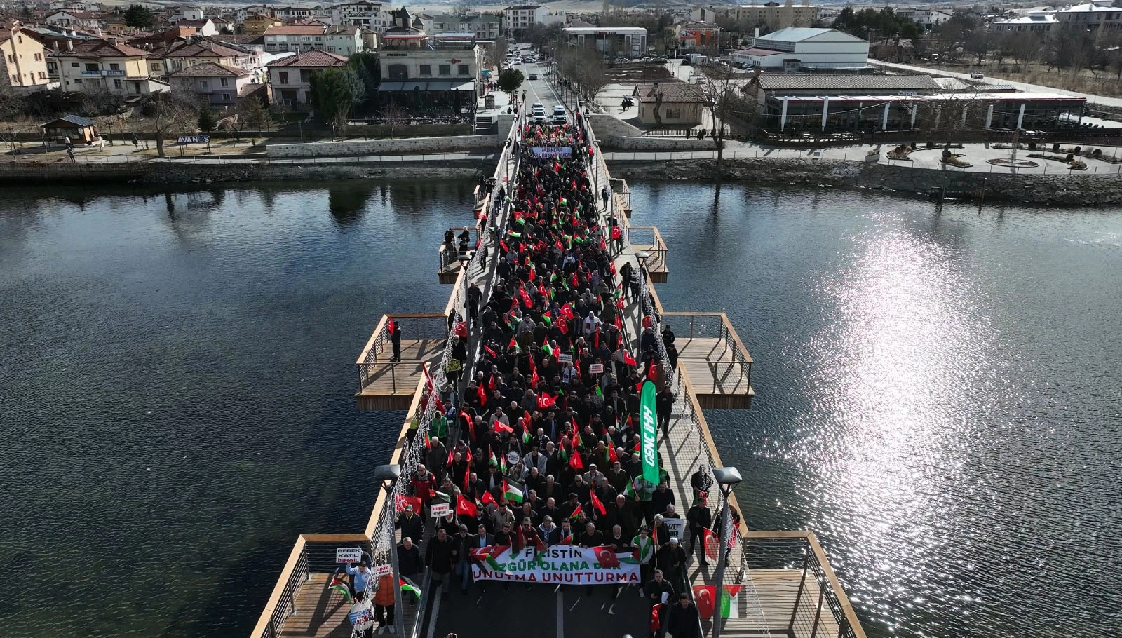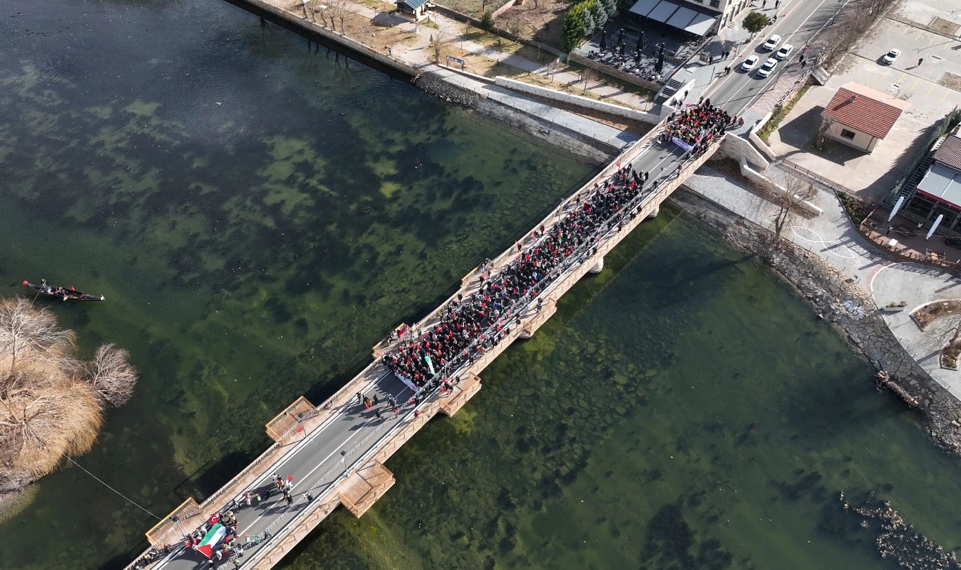 Buradan yürüyüşe geçen grup, sloganlar eşliğinde tarihi taş köprüden geçerek Şehit Şevket Tekin Merkez Camisi önüne kadar yürüdü.
