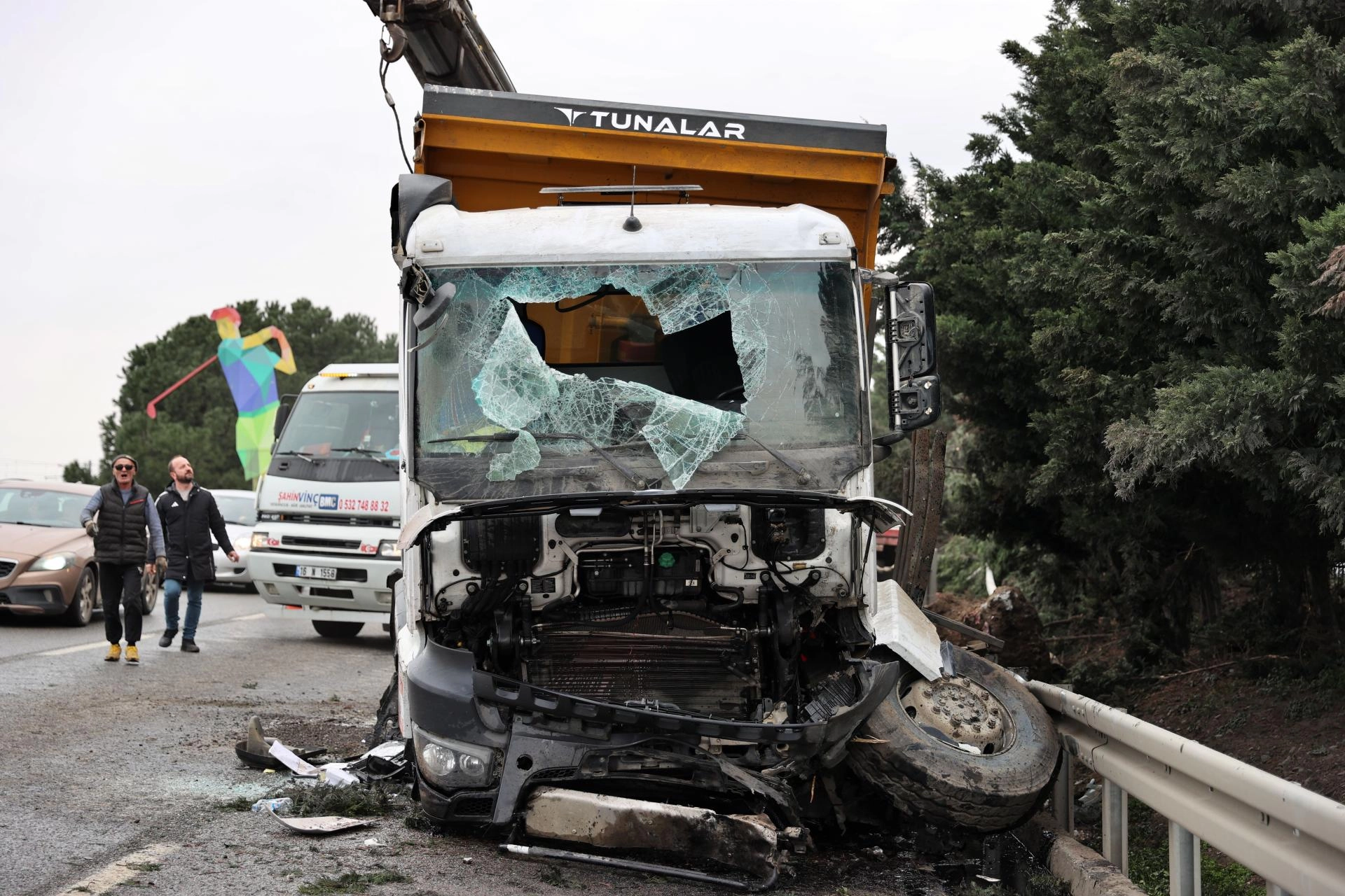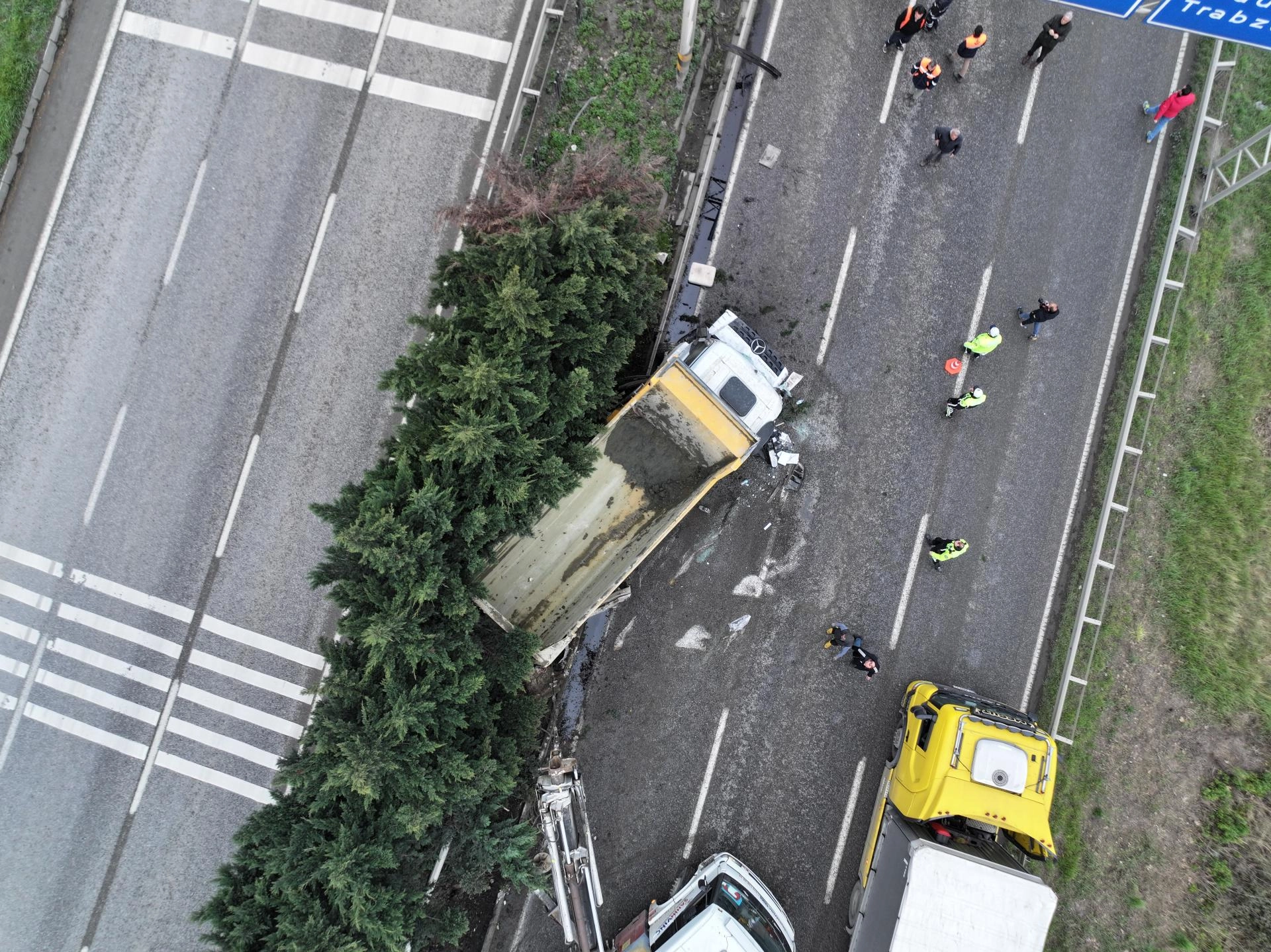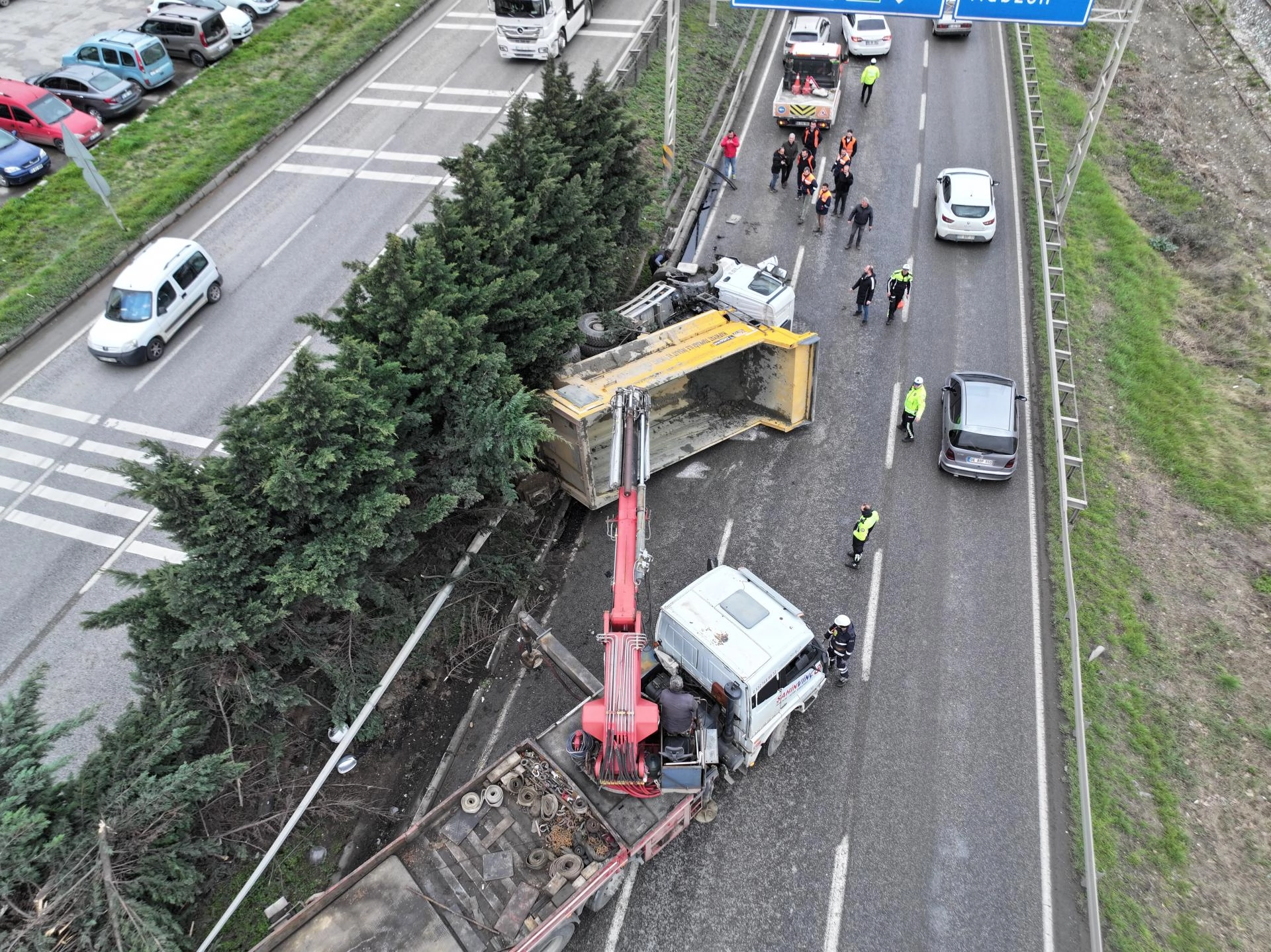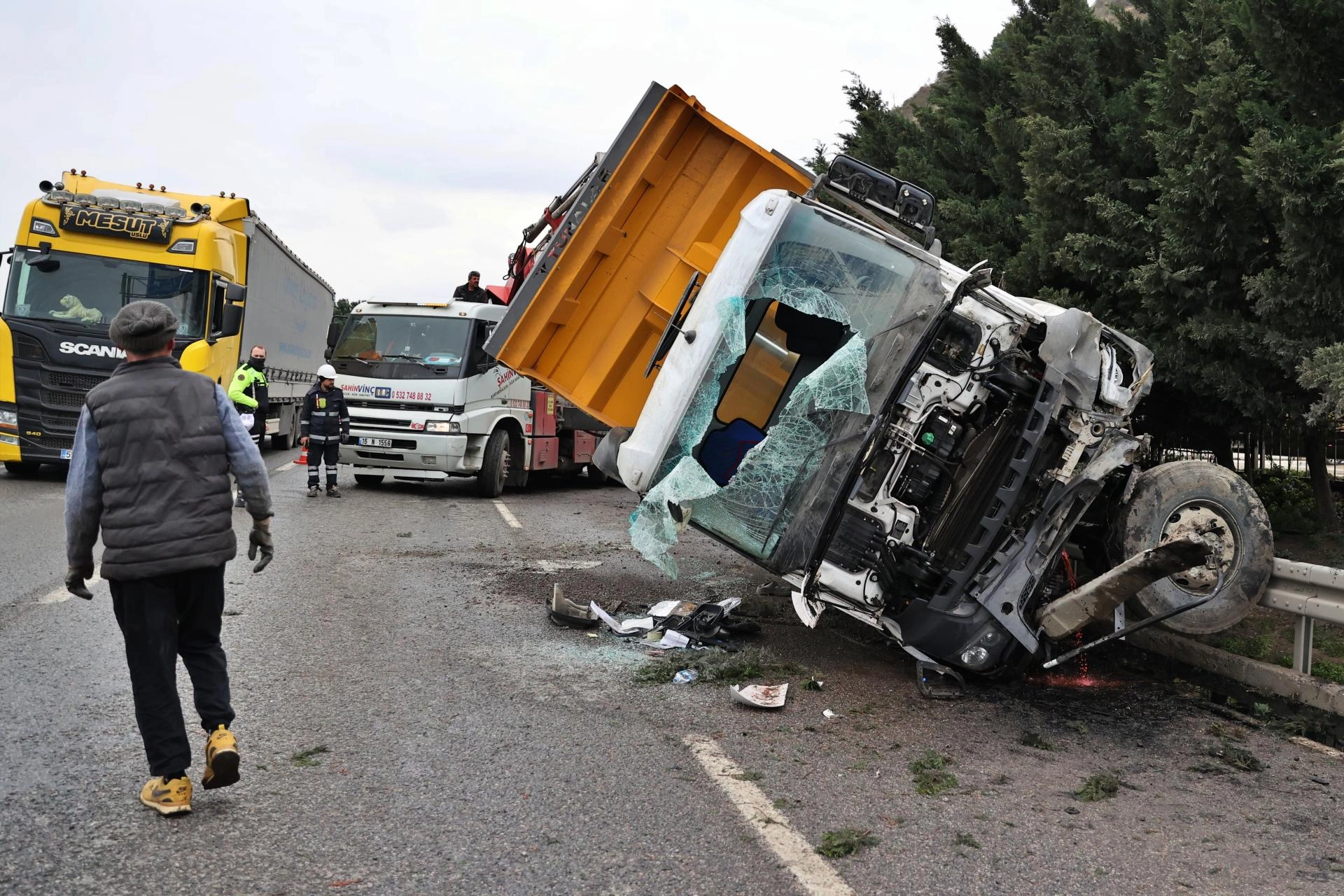 Refüjdeki bariyerlere sıkışan kamyonun kaldırılmasıyla kara yolunda ulaşım normale döndü.