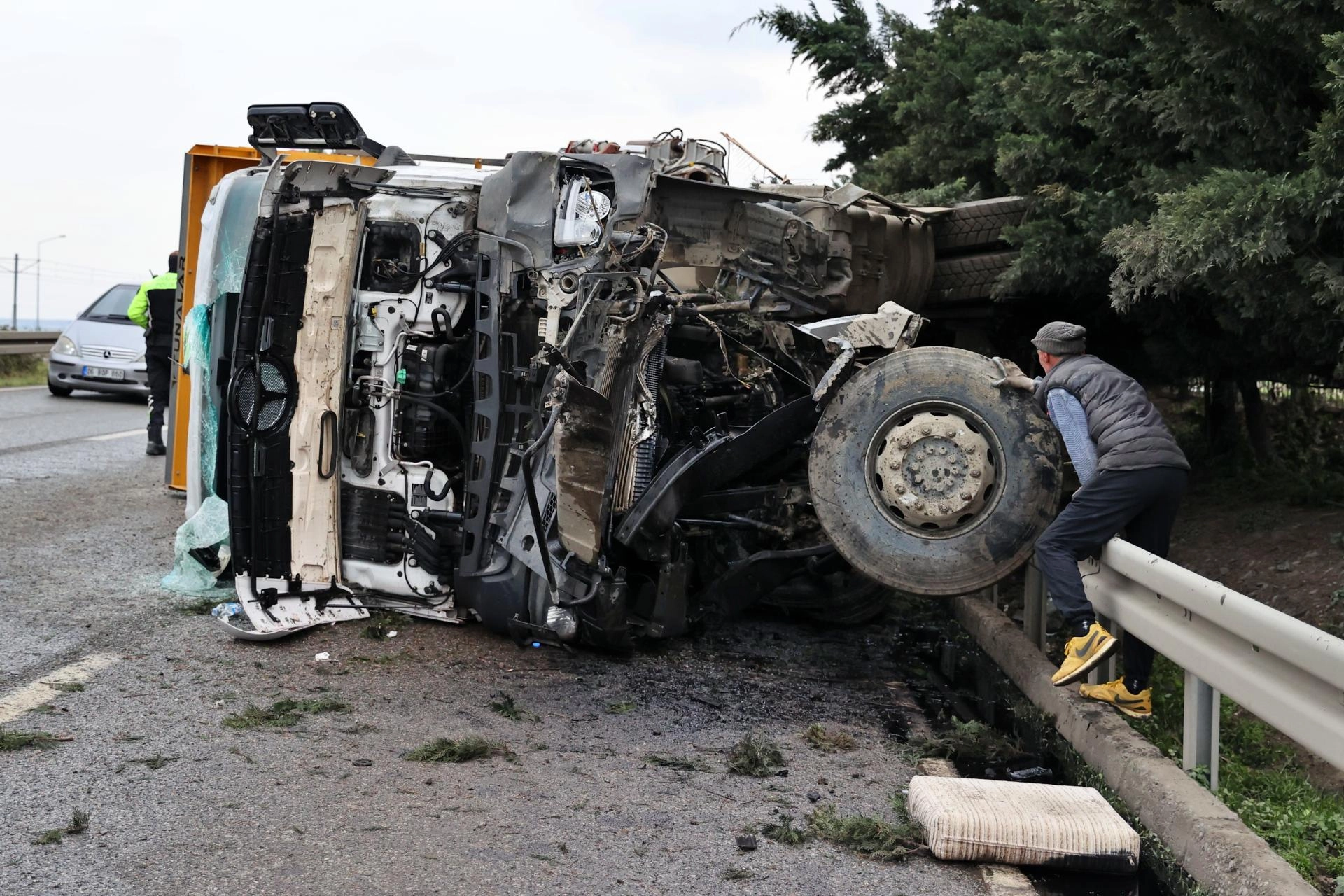 Sağlık ekipleri, kazada yaralanan kamyon şoförünü hastaneye kaldırdı.