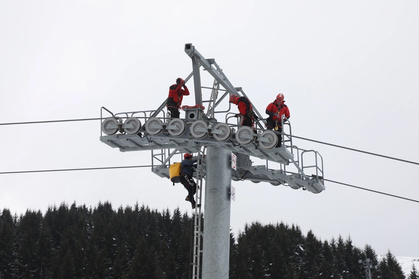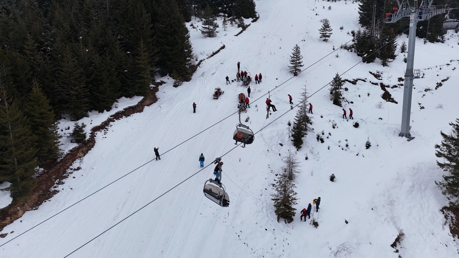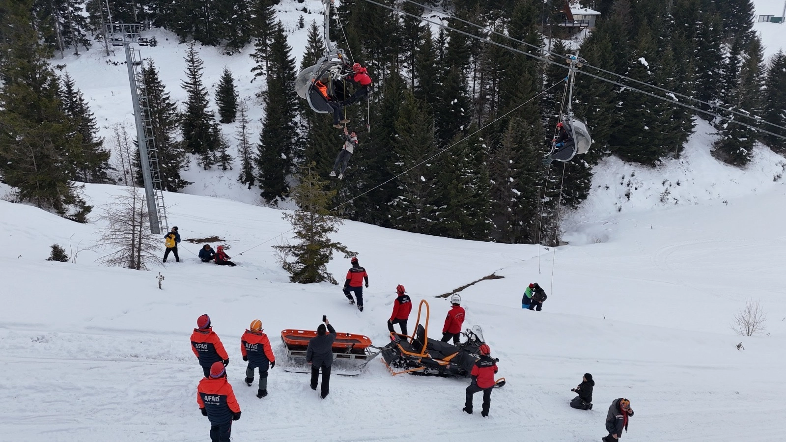 Senaryo gereği, 25 metre yükseklikteki 2 telesiyej kabininde mahsur kalan 4 kişi, ekiplerin koordineli çalışmasıyla kurtarıldı.