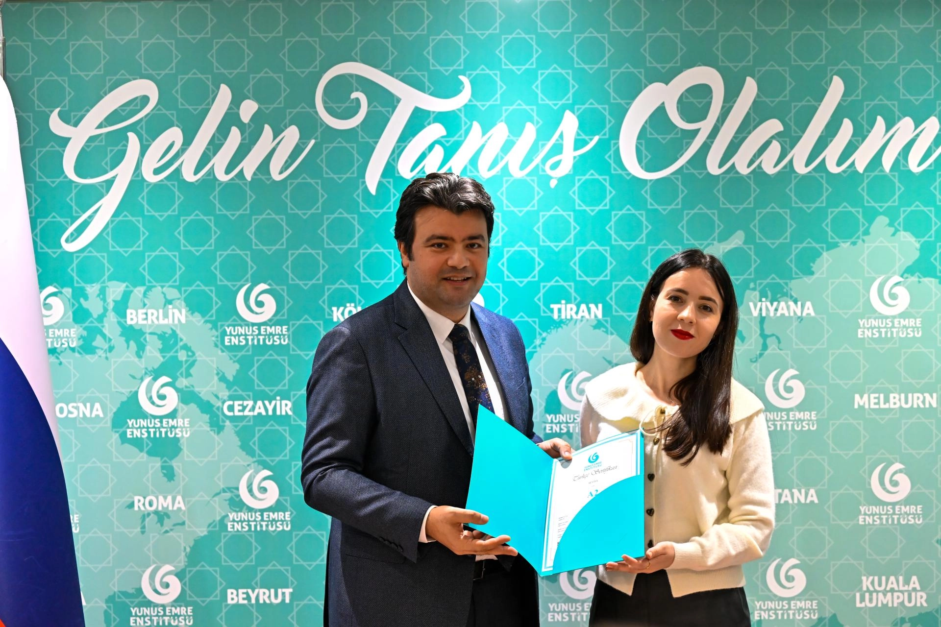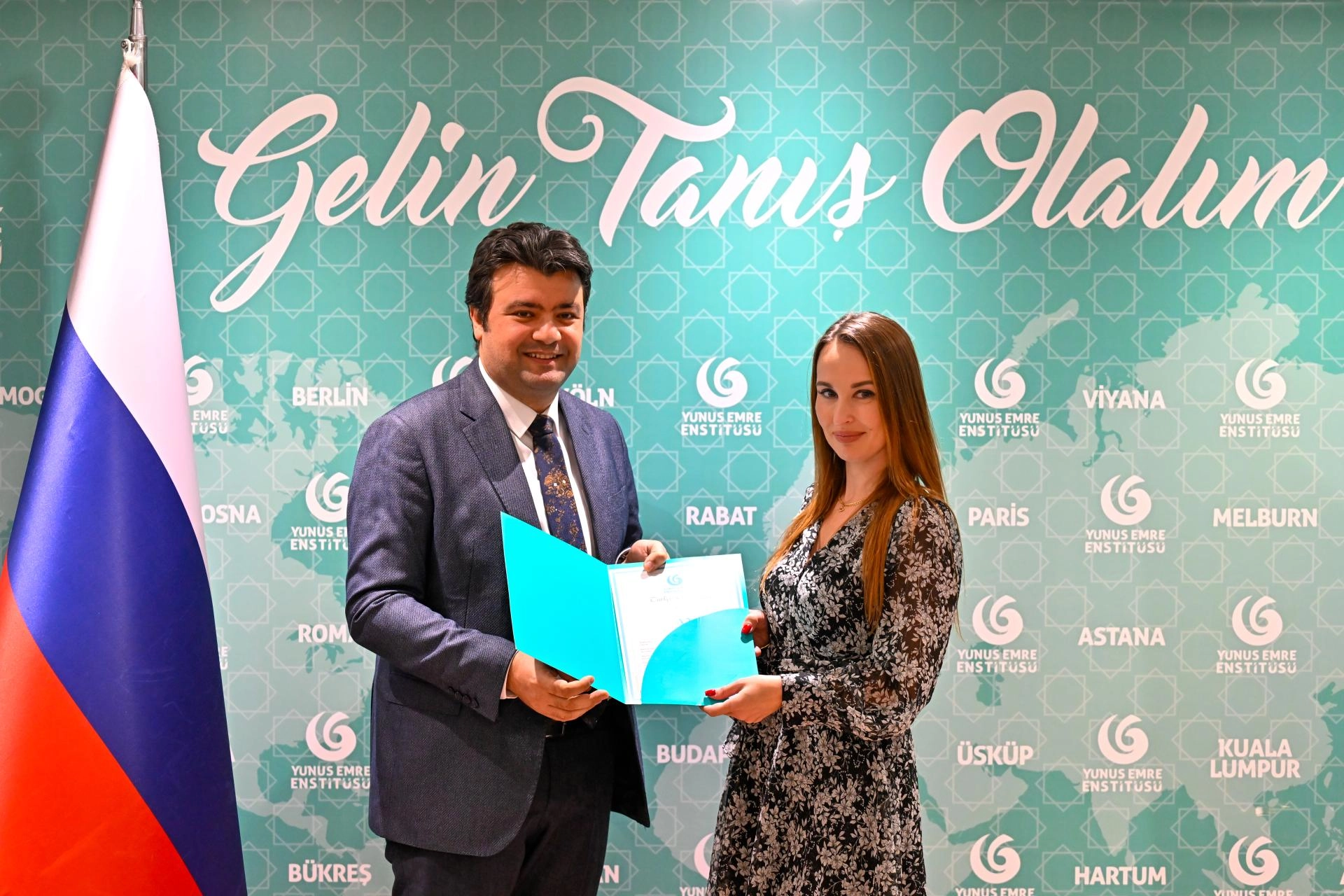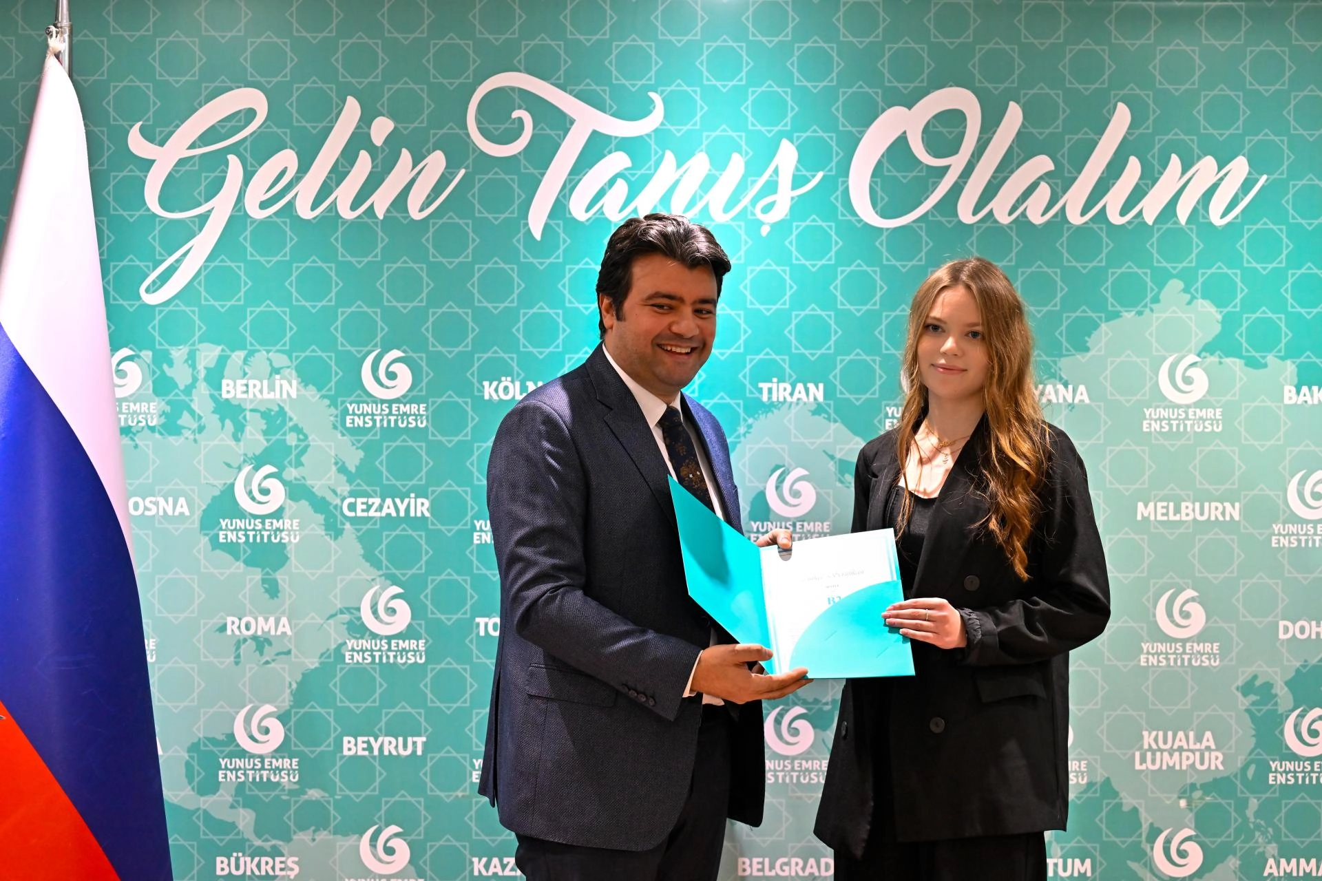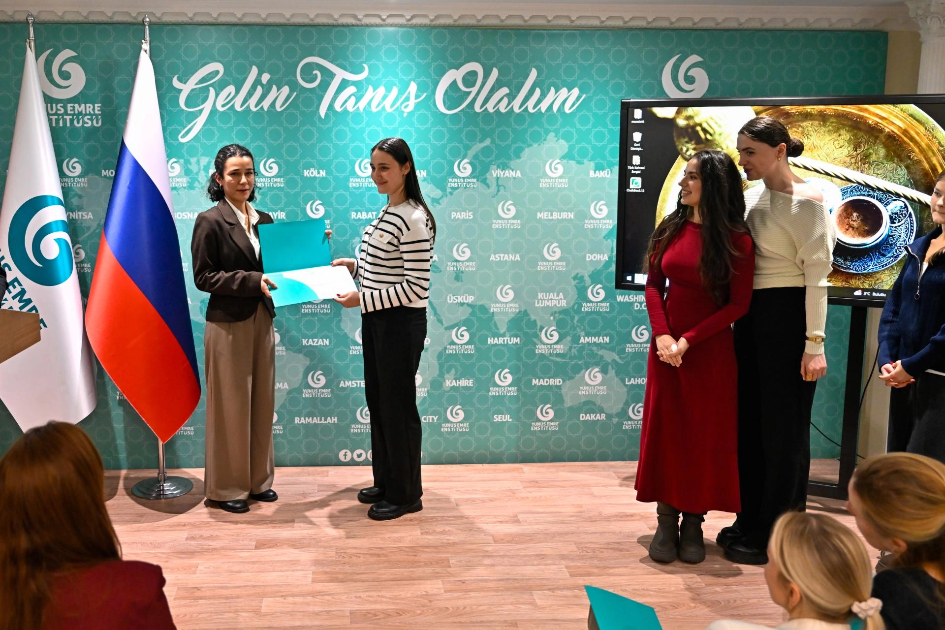 Kursiyerlere sertifikasını takdim eden Moskova YEE Koordinatörü Ersin Akbulut, yaptığı konuşmada, dilin, iletişimin işlevinin yanı sıra kültürel ve tarihi mirasın aktarılmasında önemli bir rol üstlendiğini belirterek, "Bu anlayışla enstitü olarak dil öğretimini yalnızca sınıf ortamıyla sınırlı görmüyor, kültürel faaliyetler, akademik programlar ve etkileşim odaklı etkinliklerle desteklemeyi önemsiyoruz." ifadesini kullandı.