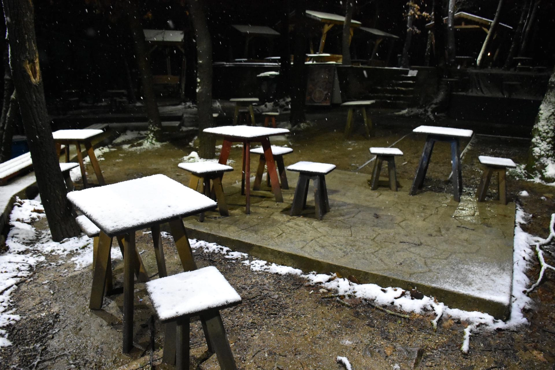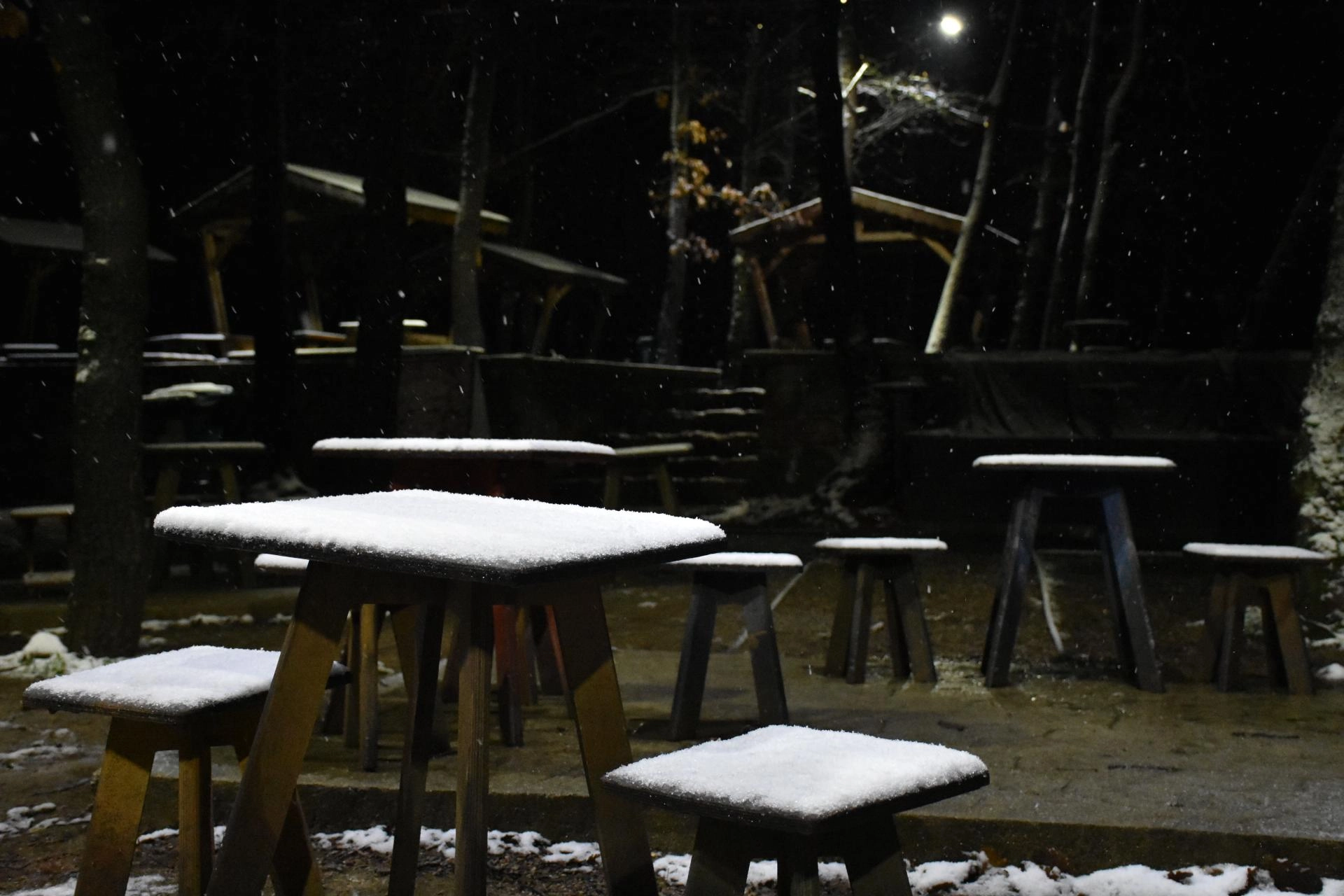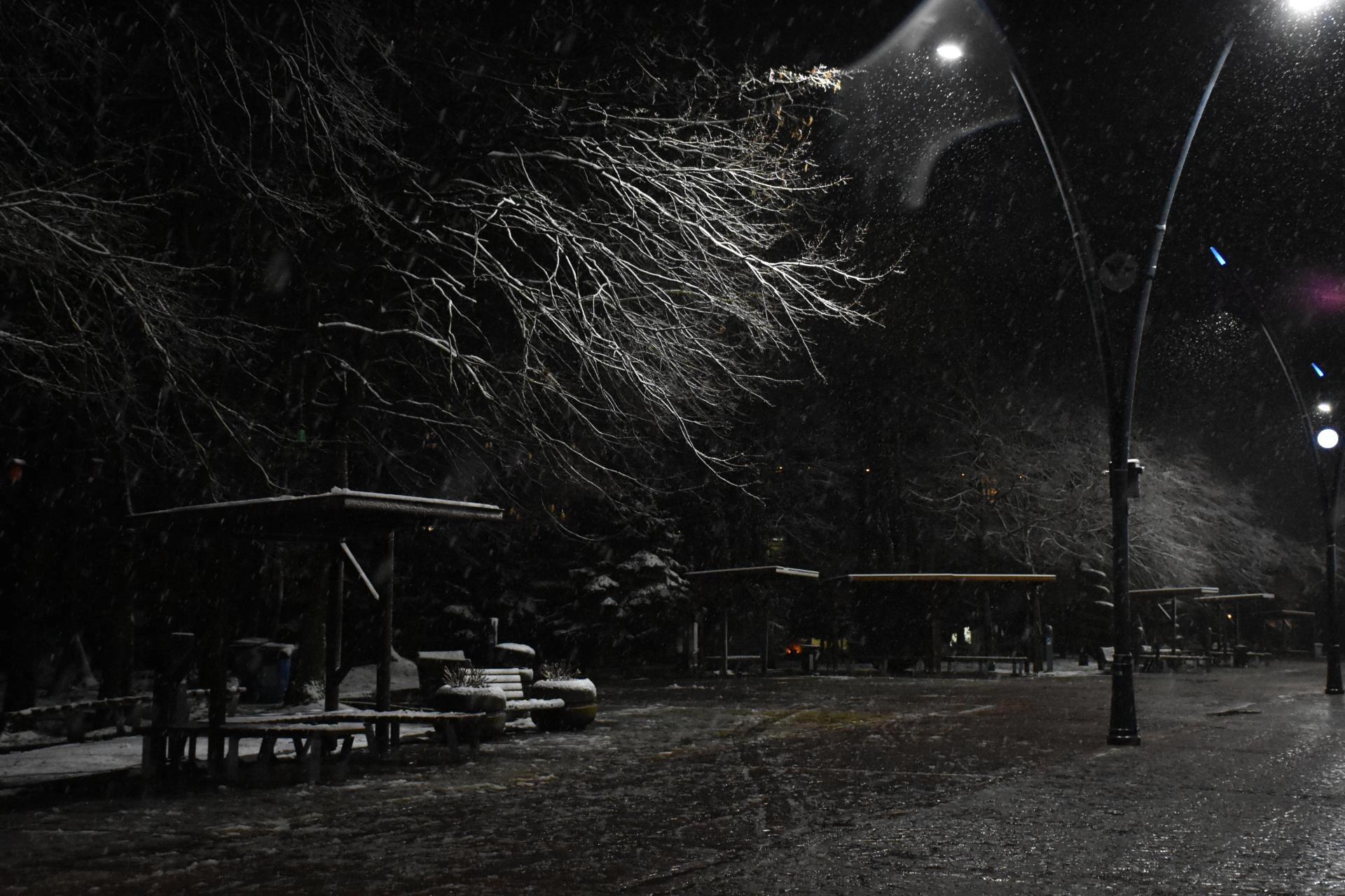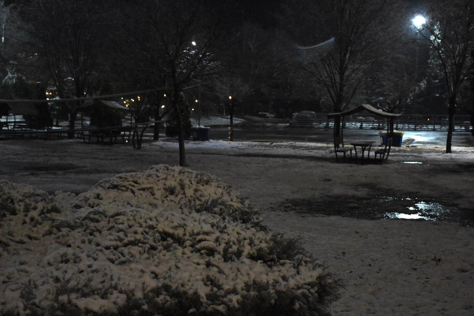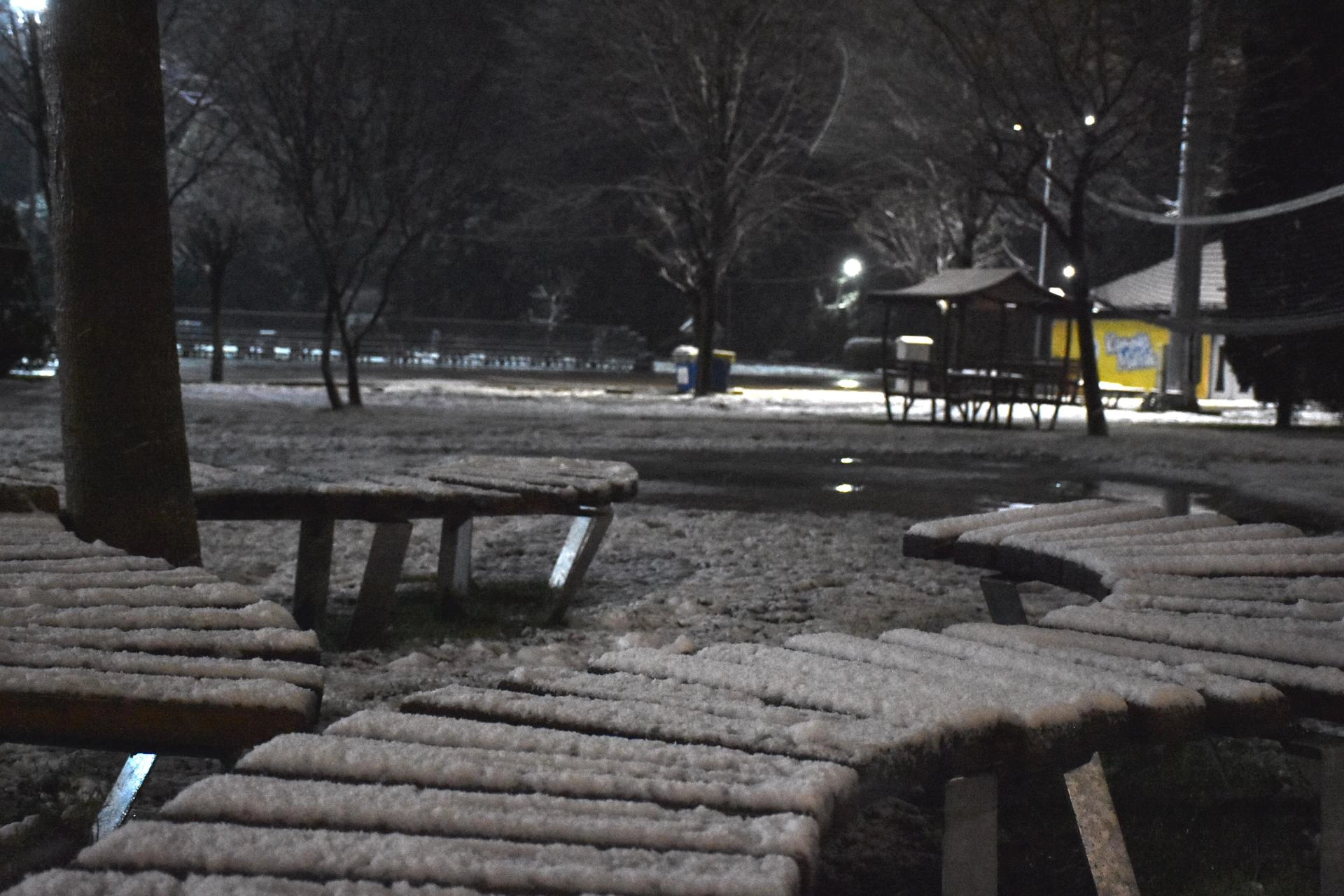 Yağış nedeniyle ağaçlar, banklar, yeşil alanlar ve araçlar üzerinde kar birikintileri oluştu.
