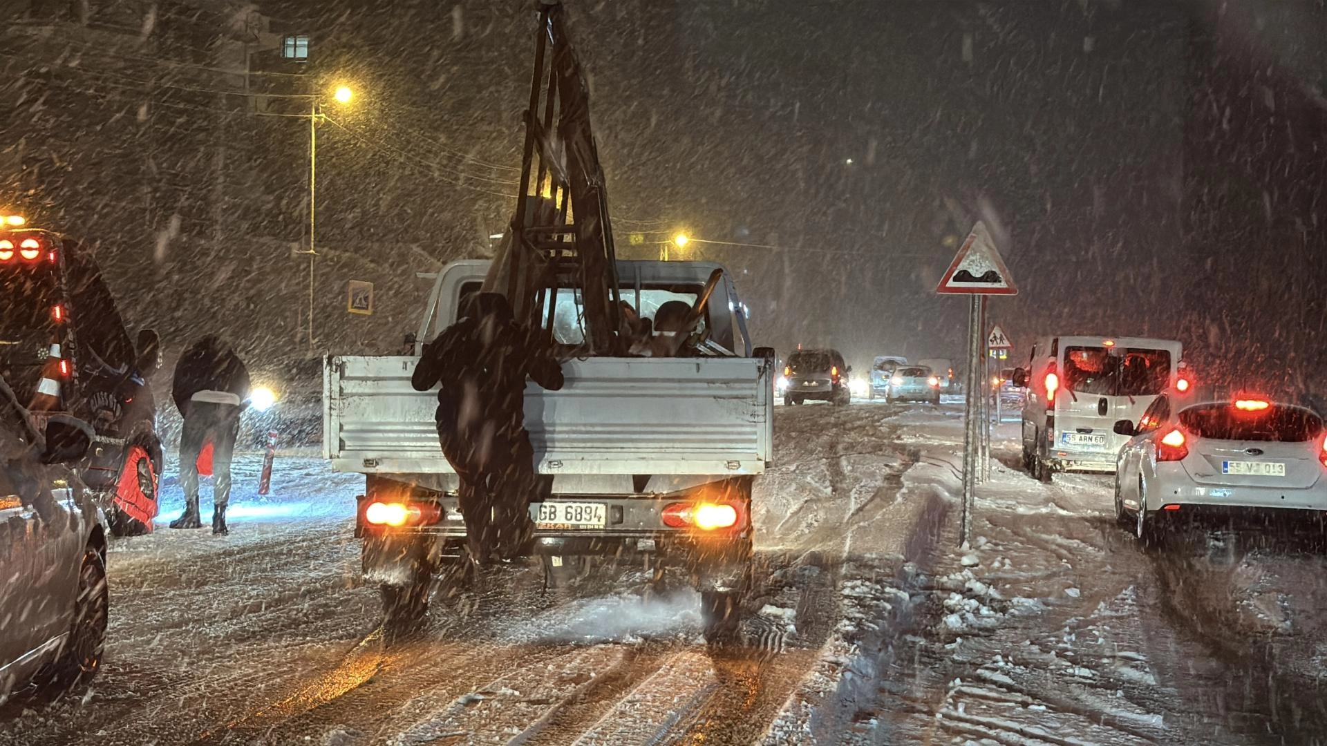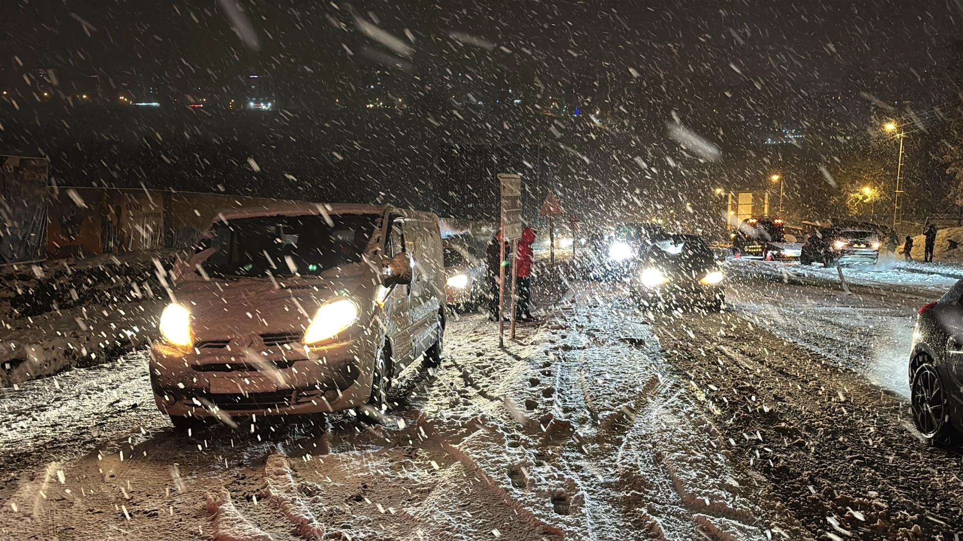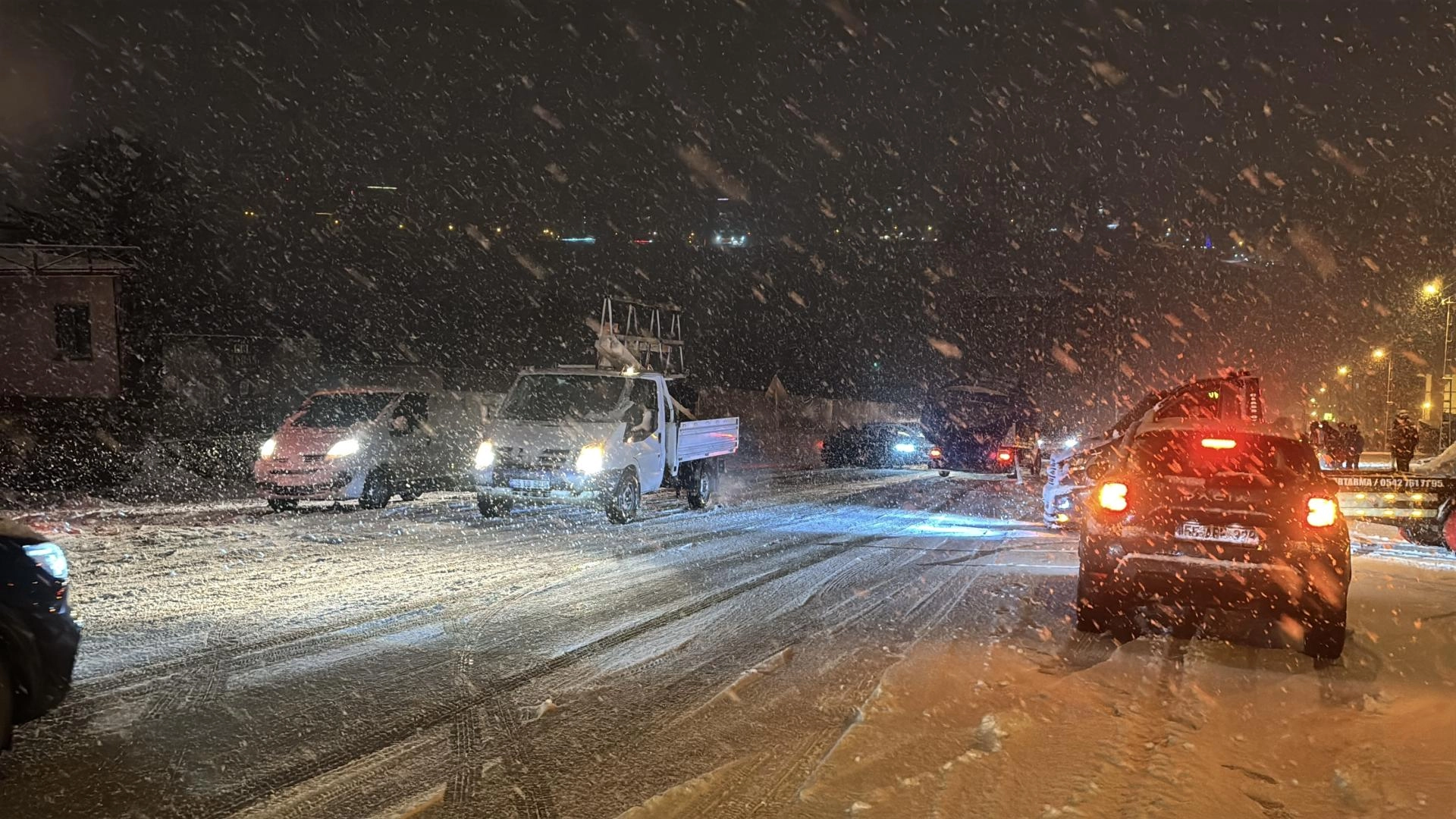 Akşam saatlerinde şiddetini artıran yağış nedeniyle karla kaplanan yollarda kış lastiği ve zinciri bulunmayan araçlar zorlukla ilerliyor.