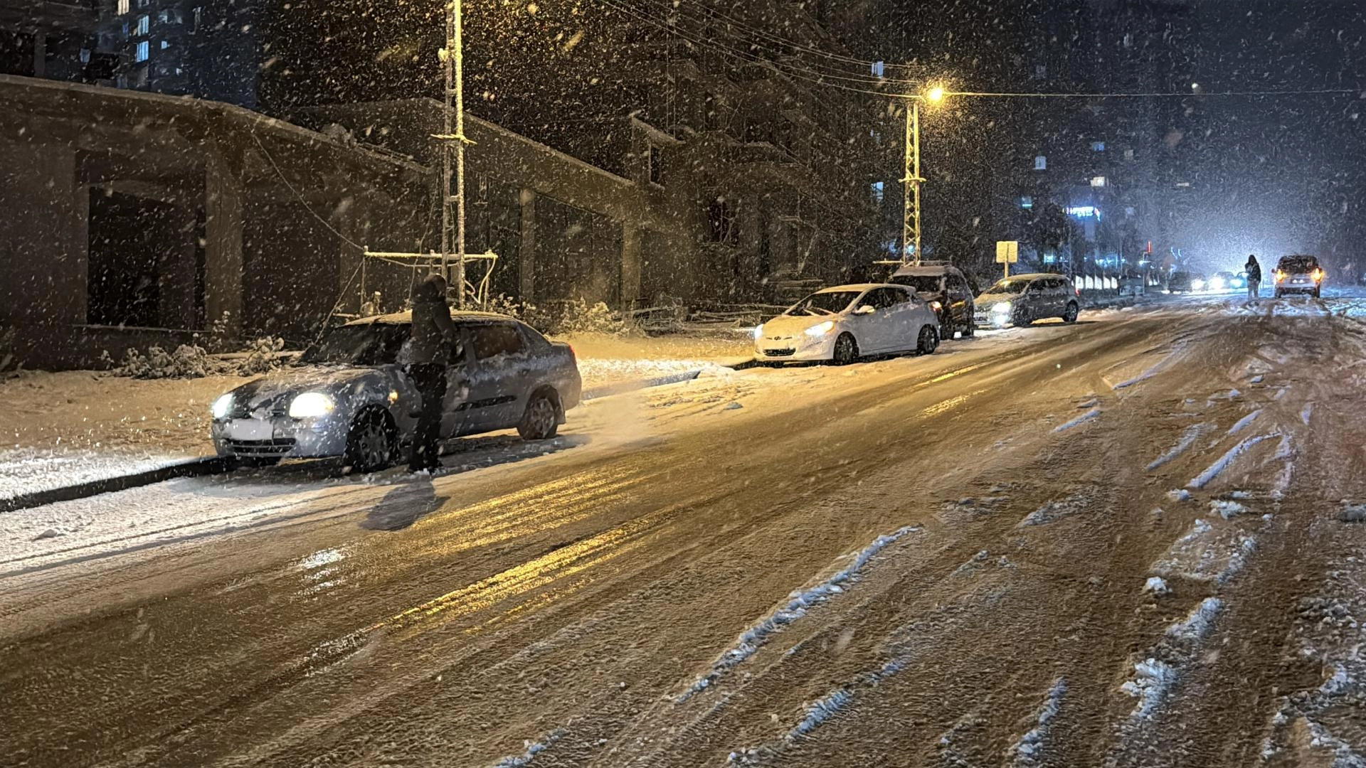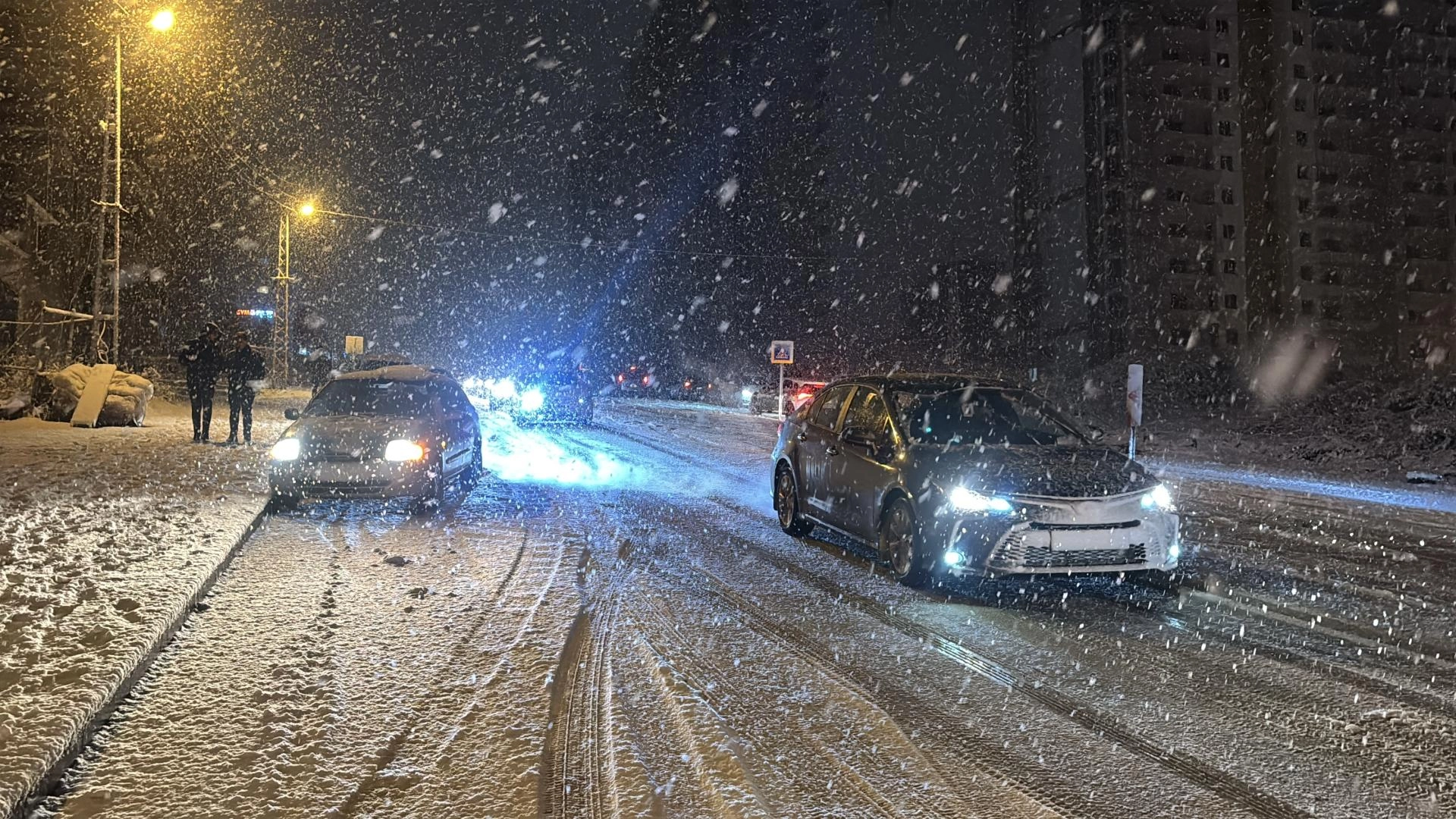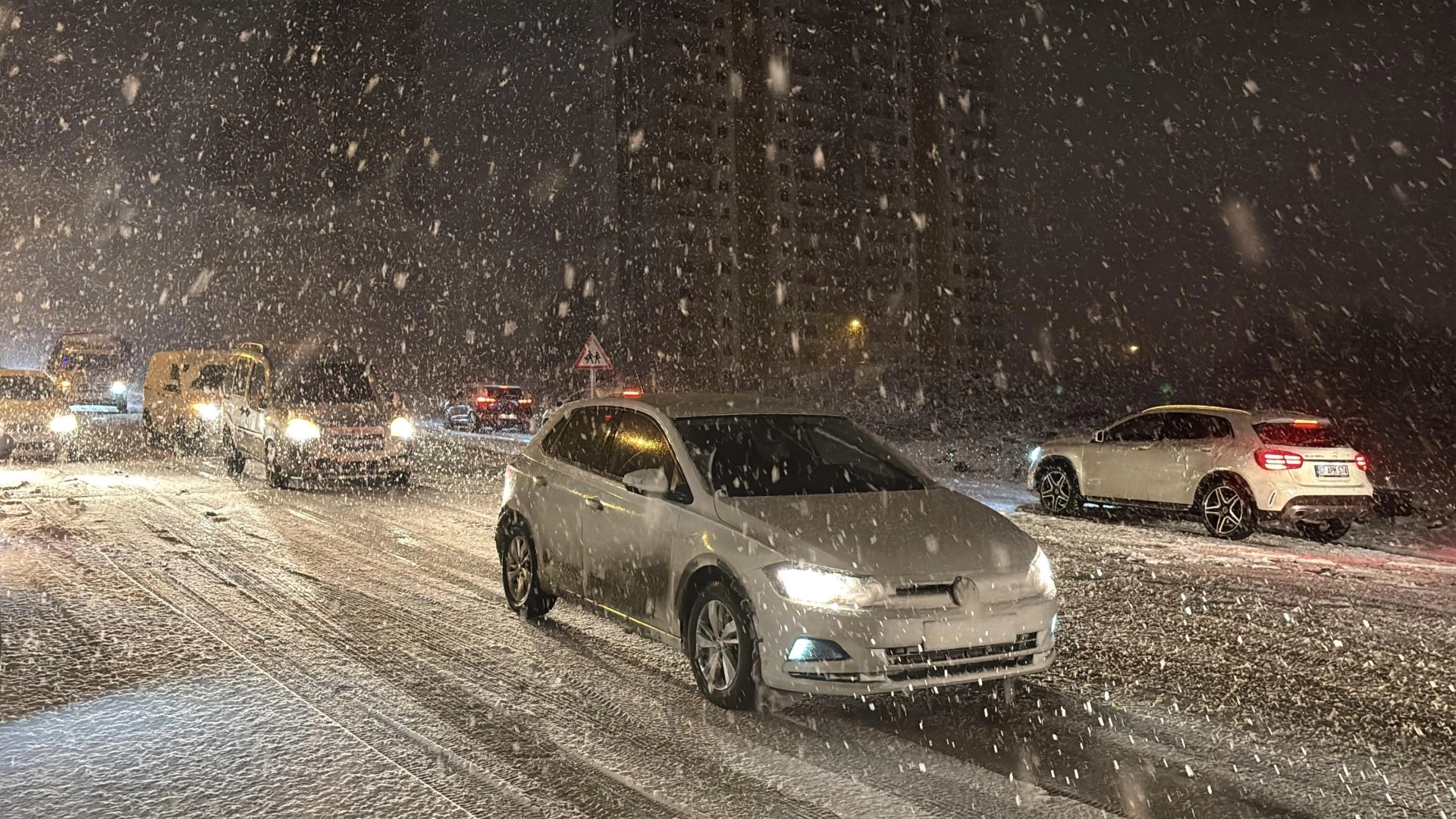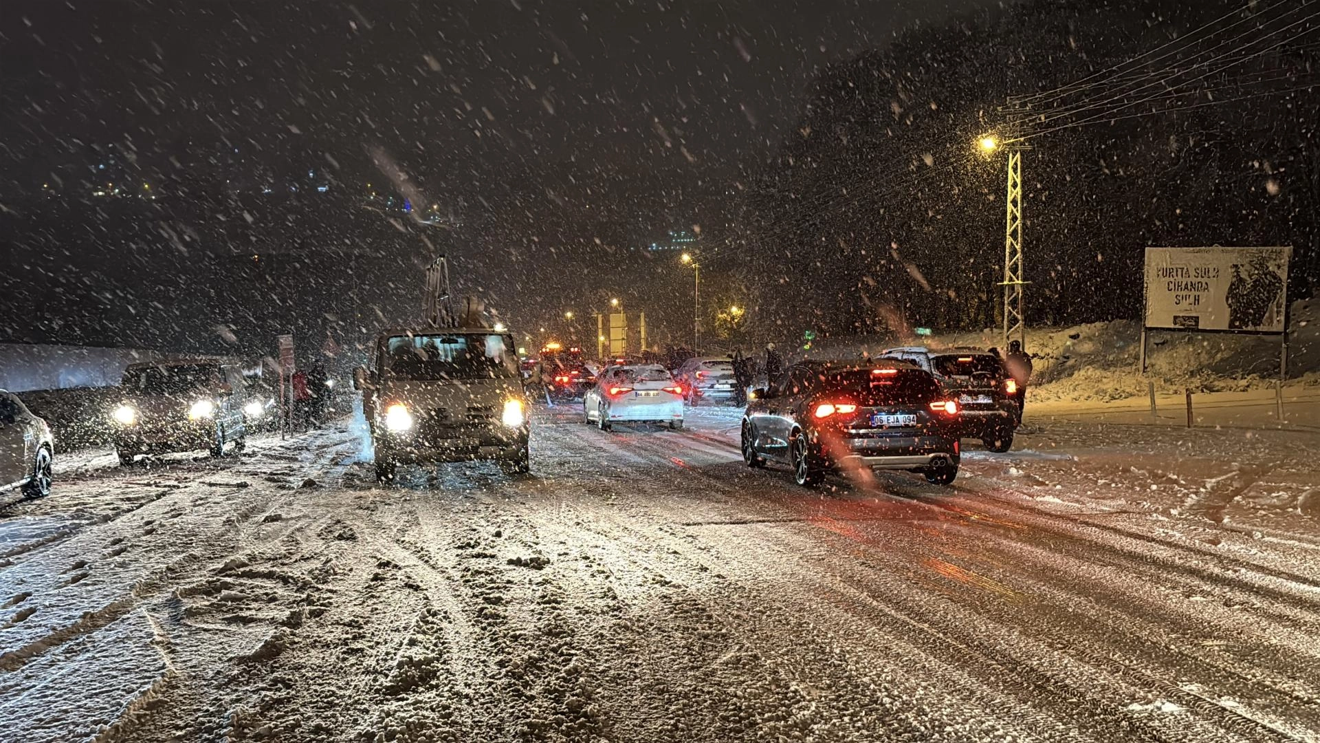 Akşam saatlerinde şiddetini artıran yağış nedeniyle karla kaplanan yollarda kış lastiği ve zinciri bulunmayan araçlar zorlukla ilerliyor.