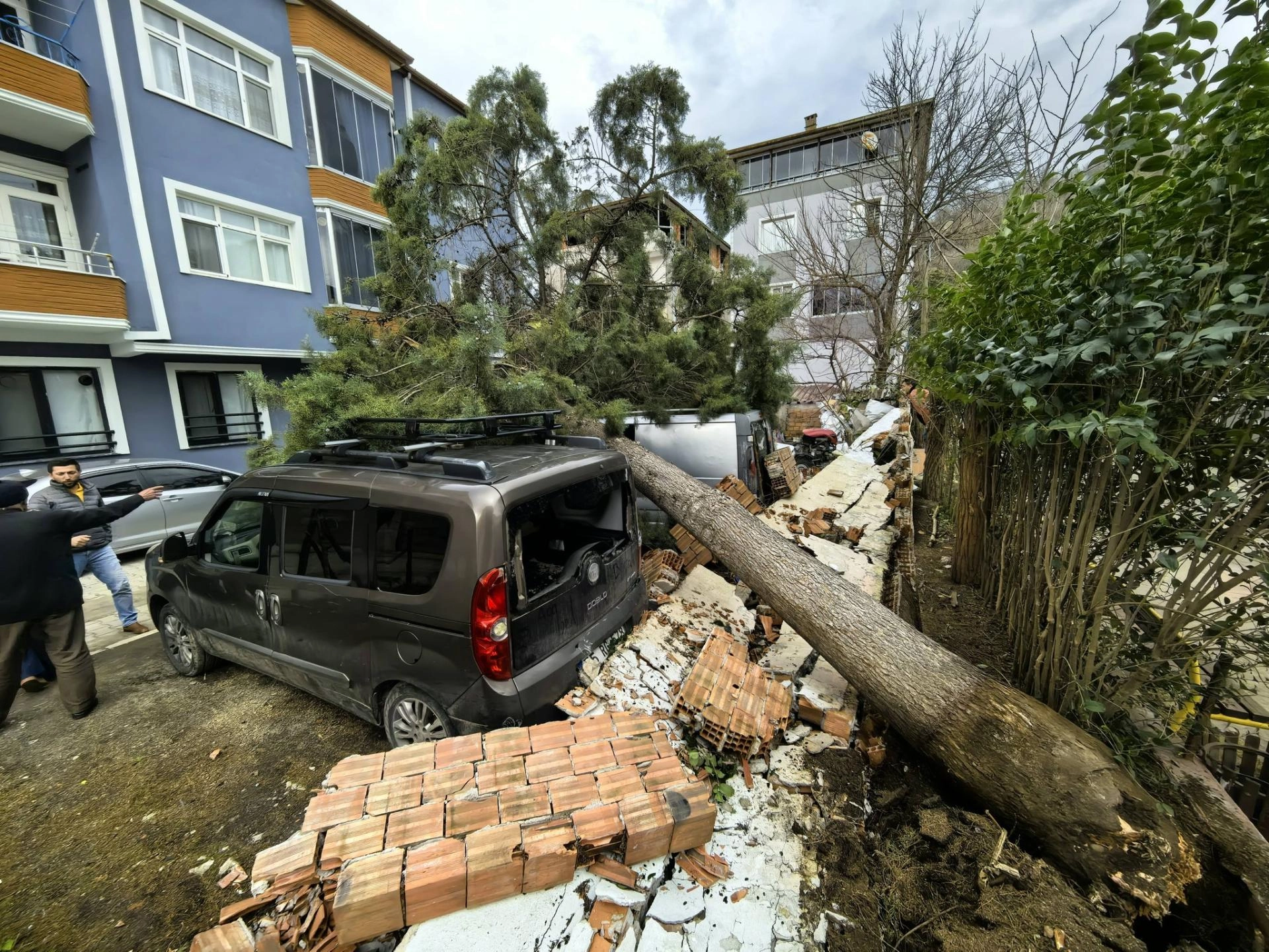 Dalları kırılan ağaçlar, yol kenarında park halinde bulunan 3 aracın üzerine devrildi.