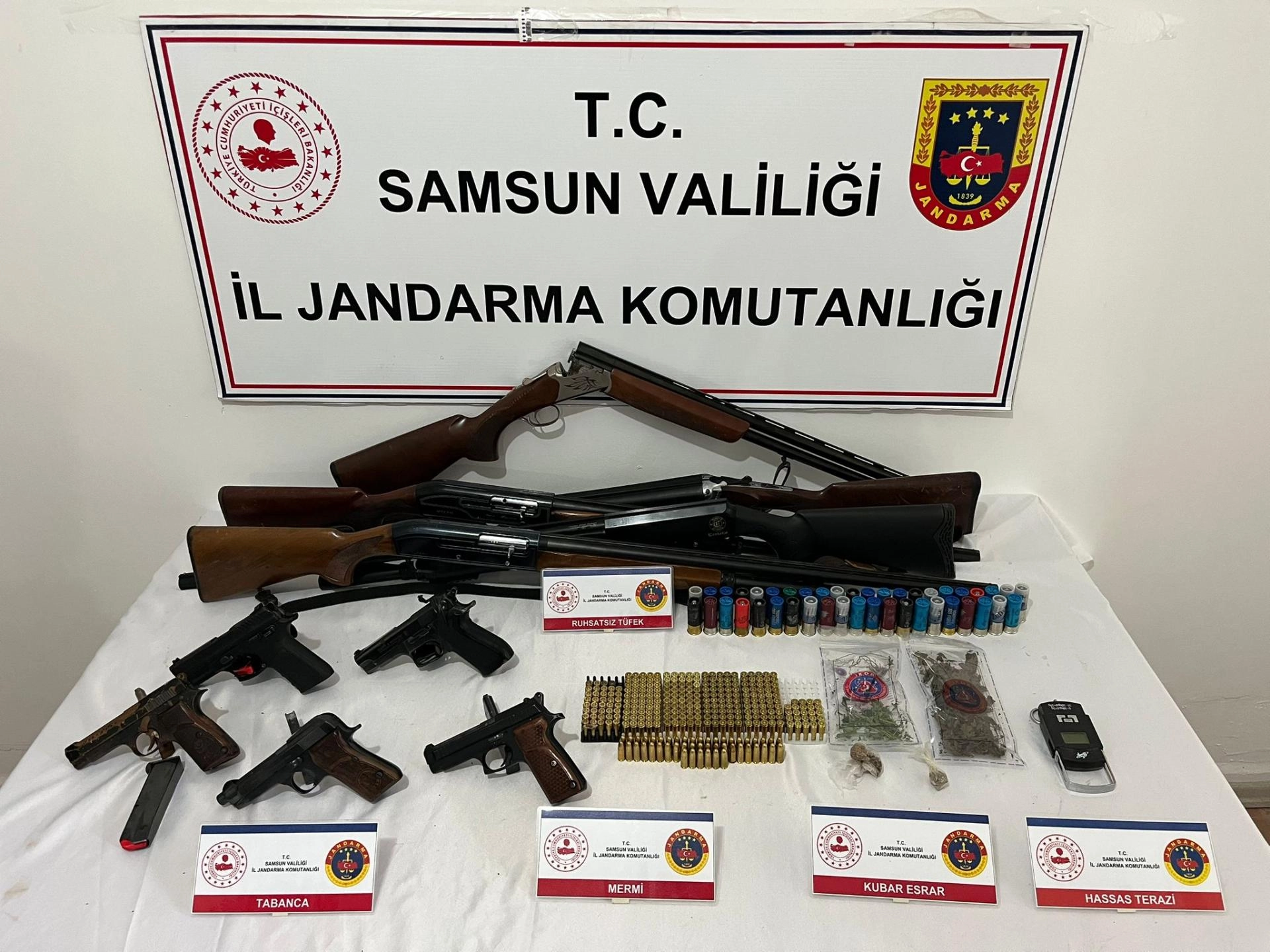 Zanlıların adreslerine eş zamanlı düzenlenen operasyonda 5 ruhsatsız tabanca, 5 ruhsatsız av tüfeği ile uyuşturucu ticaretinde kullanıldığı değerlendirilen hassas terazi ve kubar esrar ele geçirdi.