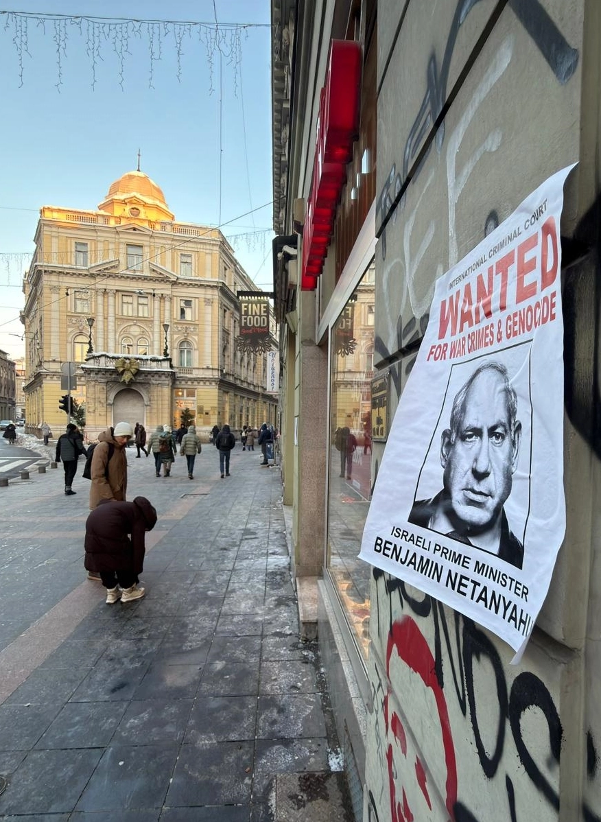 Bir grup insan hakları aktivisti tarafından asılan afişlerde, Netanyahu'nun fotoğrafı yerleştirilerek üzerinde "Uluslararası Ceza Mahkemesi" yazısı yer alırken, alt kısımda da "İsrail Başbakanı Binyamin Netanyahu, aranıyor, savaş suçları ve soykırımdan" ifadelerine yer verildi.