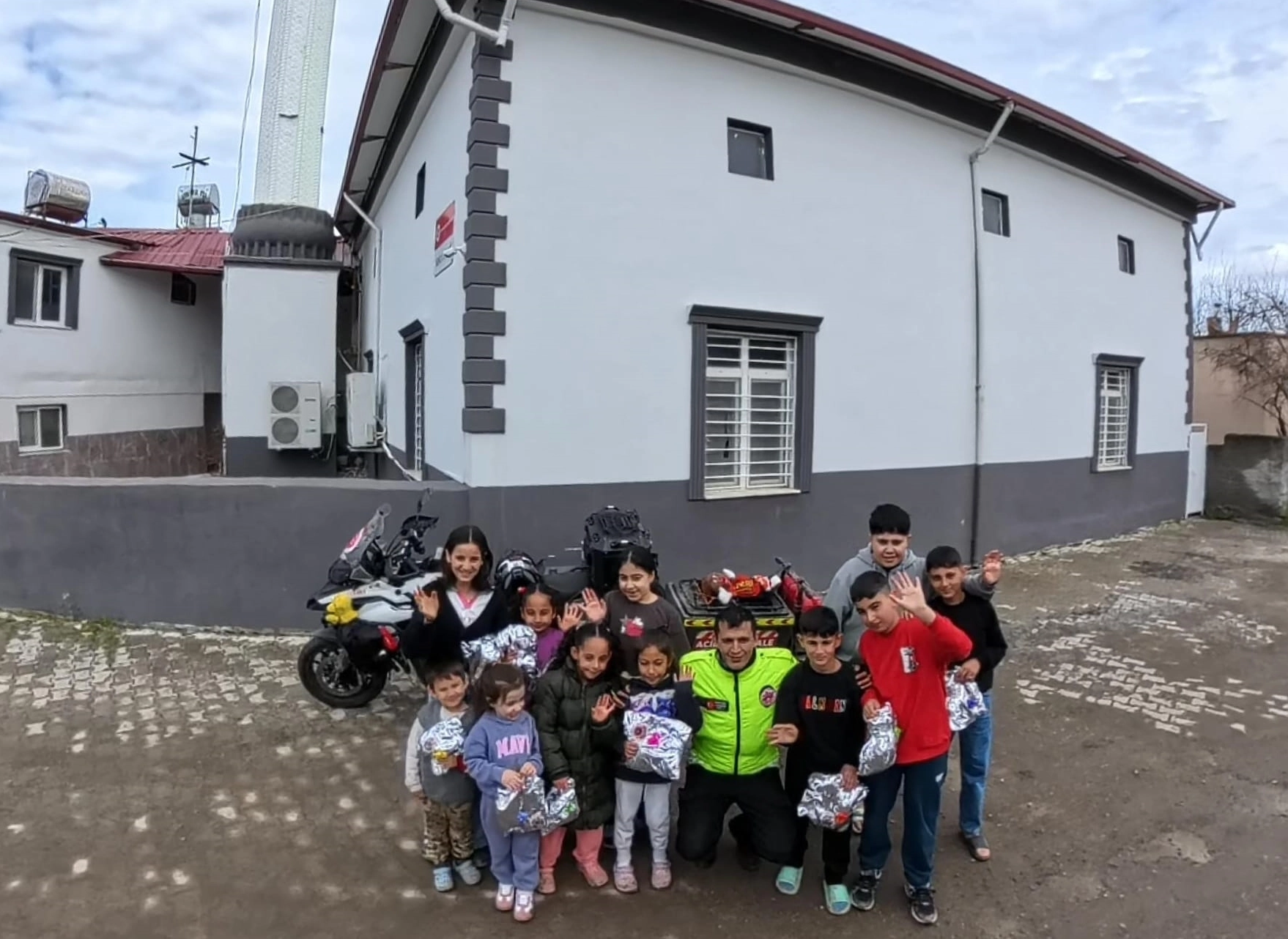 Çocukların sevinci motokuryenin motosikletine taktığı kameraya yansıdı.