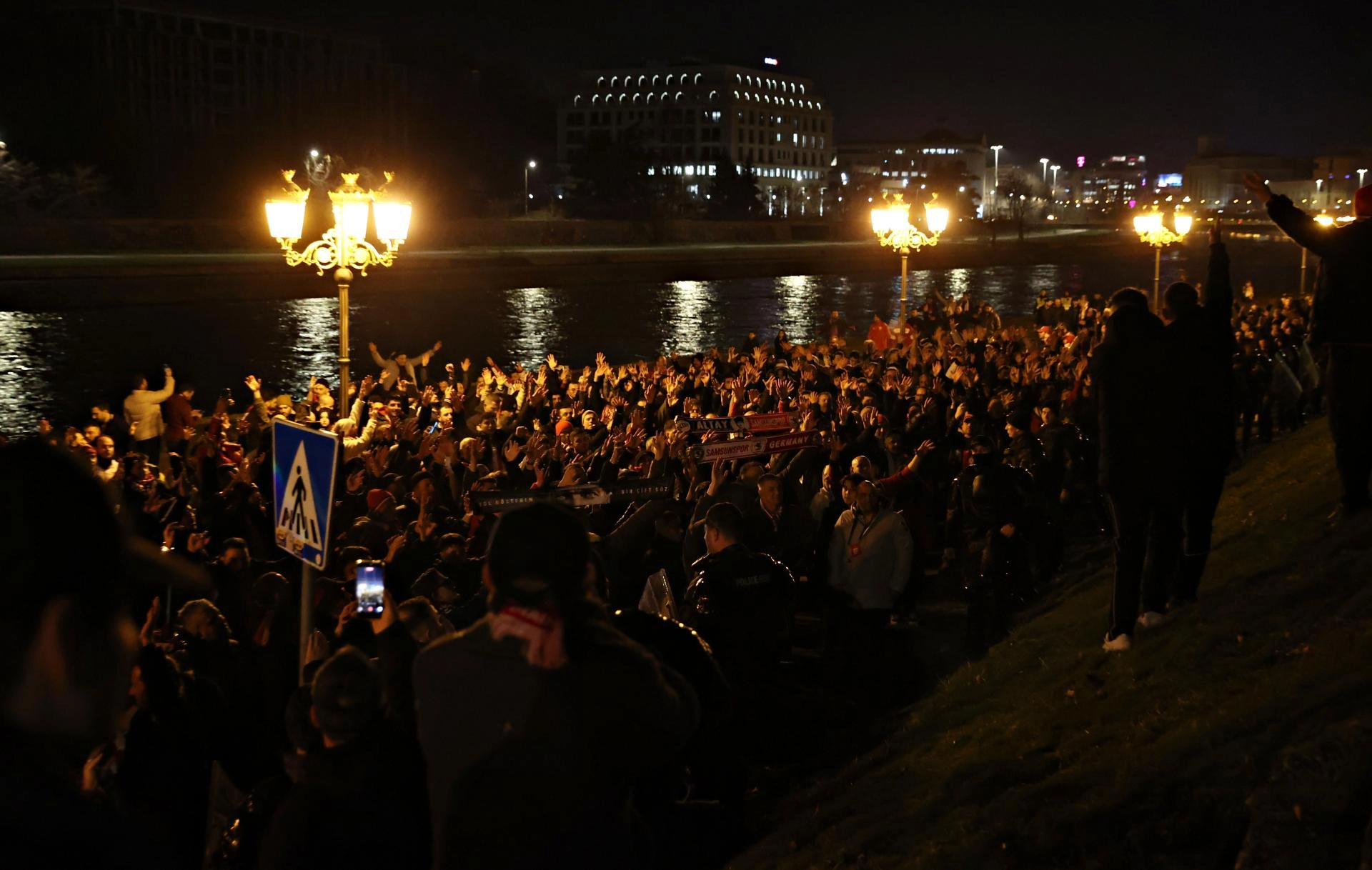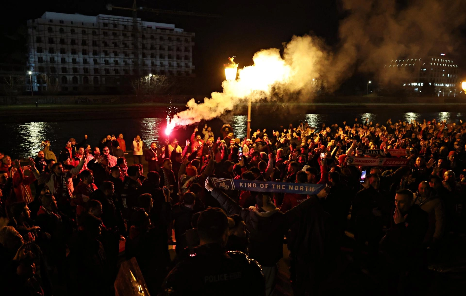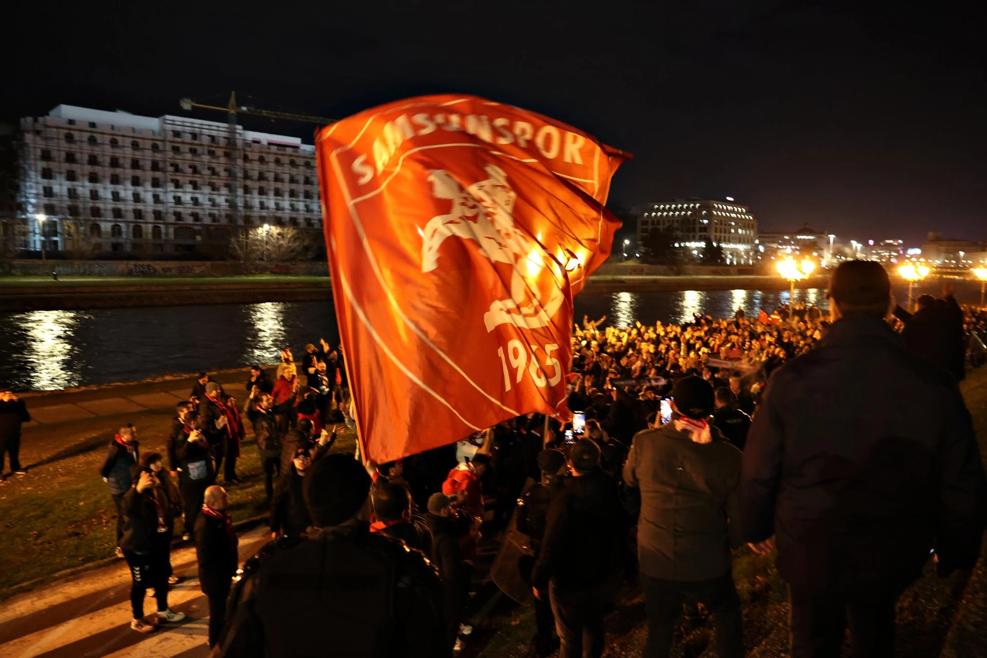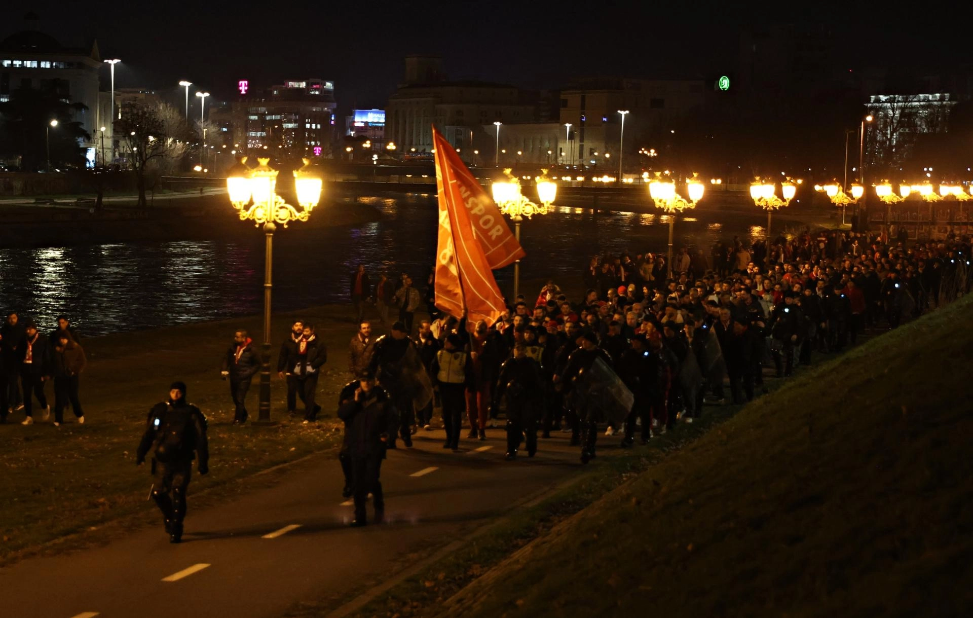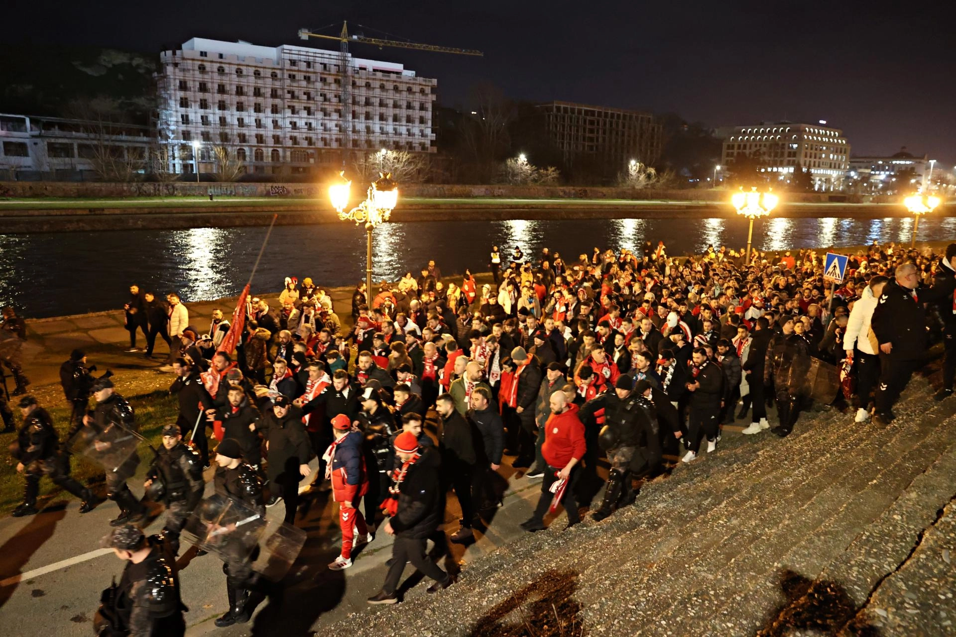Üsküp kentindeki meydanda bir araya gelen kırmızı-beyazlı taraftarlar, burada sloganlar atarak stadyuma geçti.