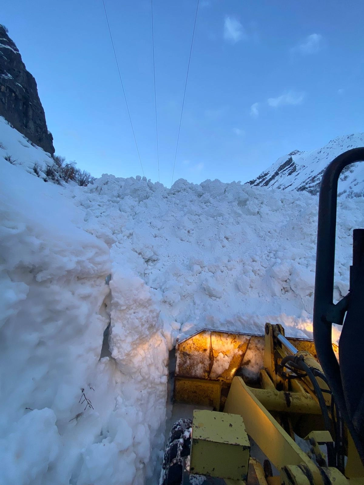 Çığ düşmesi sonucu yol ulaşıma kapanırken operatörünün o esnada molada olduğu öğrenilen bir iş makinesi kısmen çığ altında kaldı.