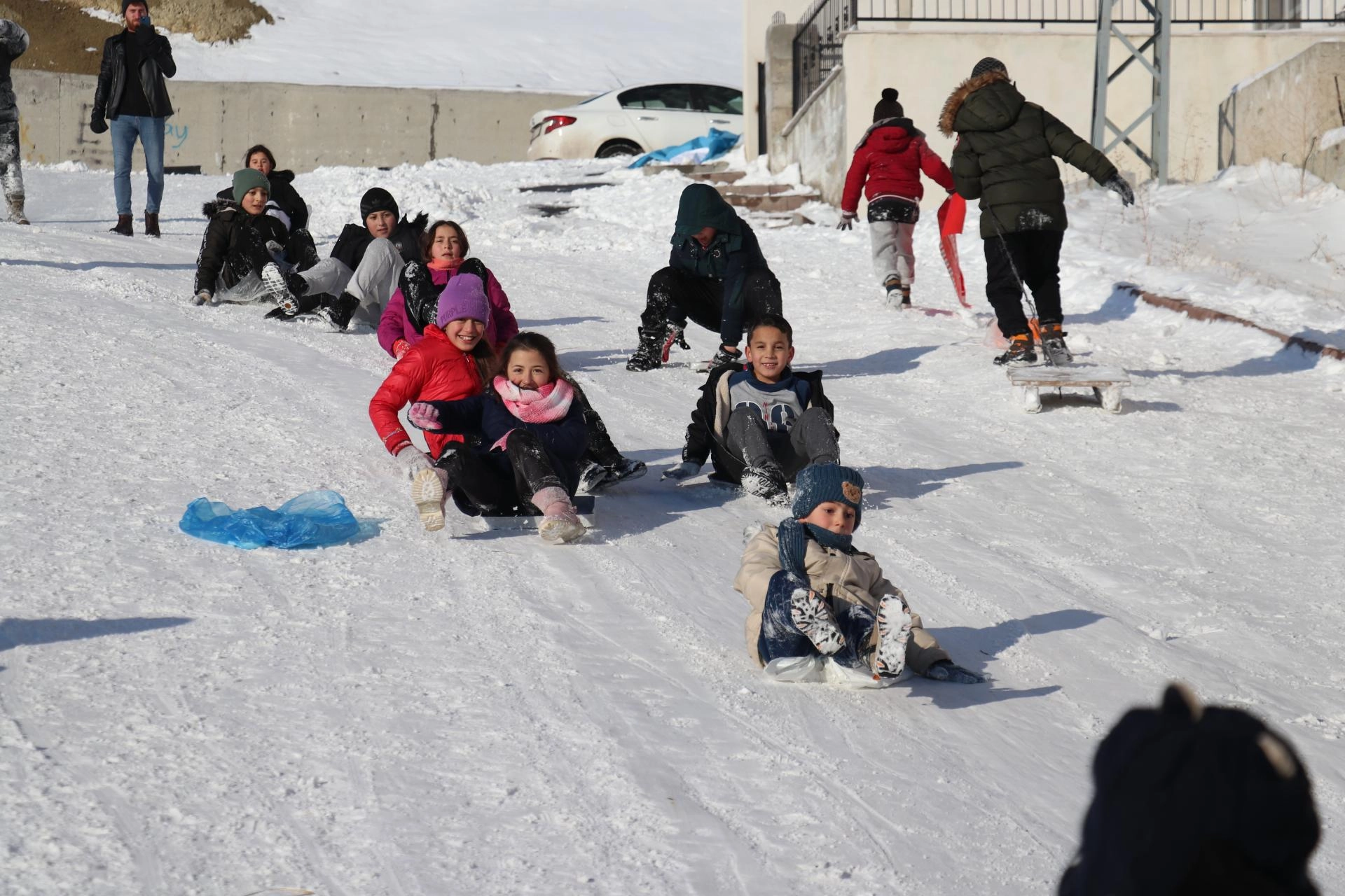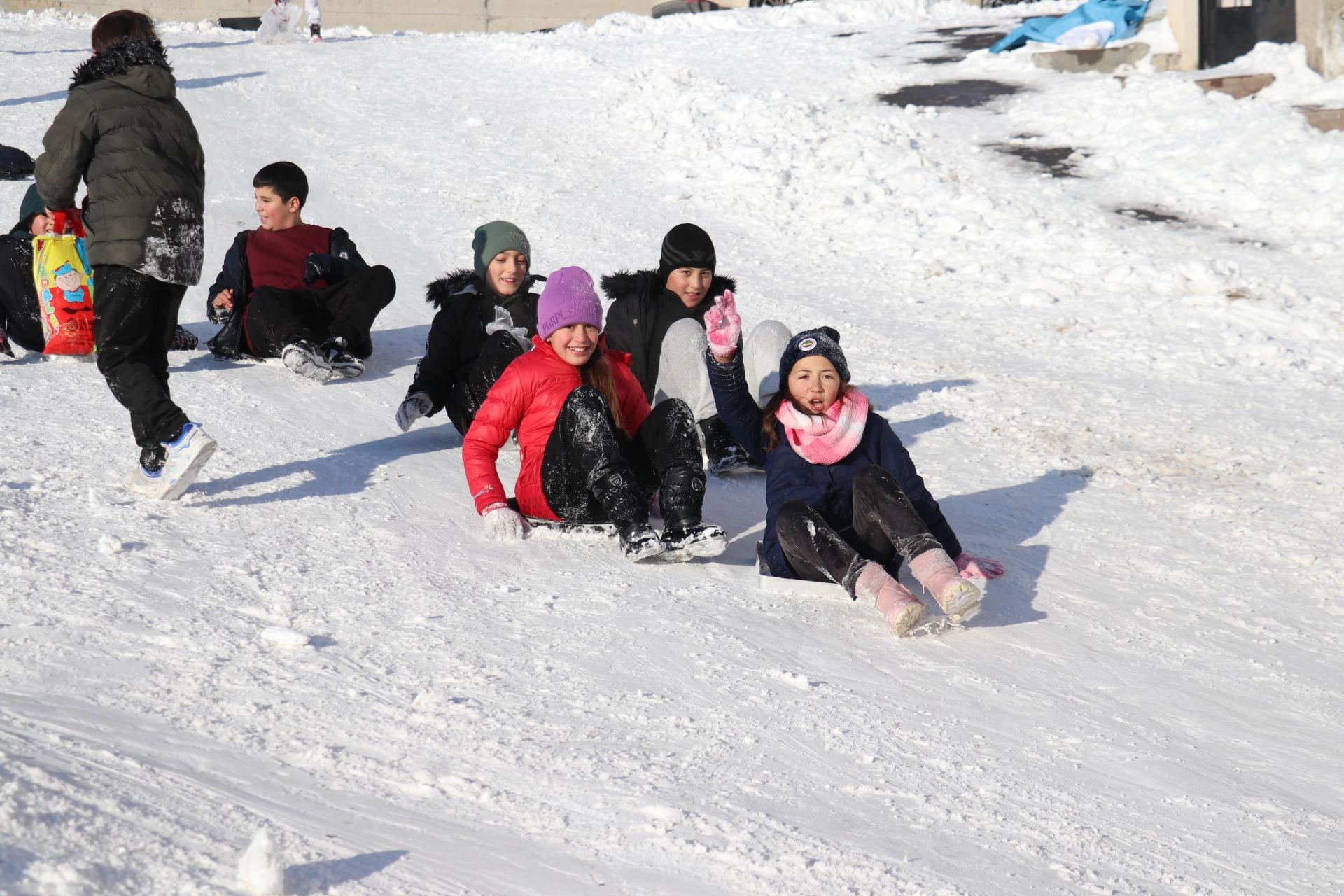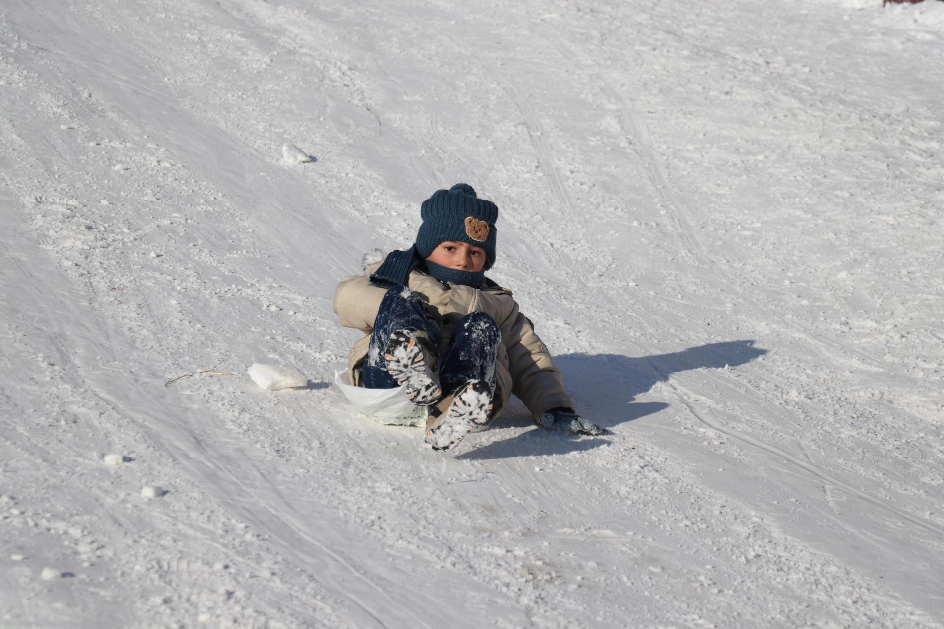 Fatih Mahallesi'ndeki yokuşa gelen çocuklar ise poşet, tepsi ve kızaklarla kayarak gönüllerince eğlendi.