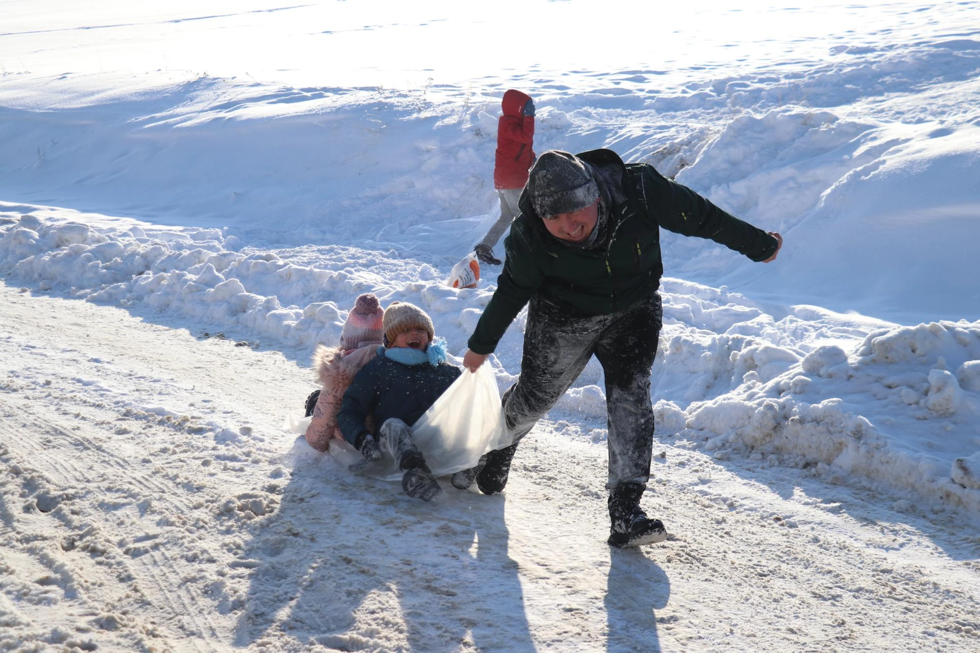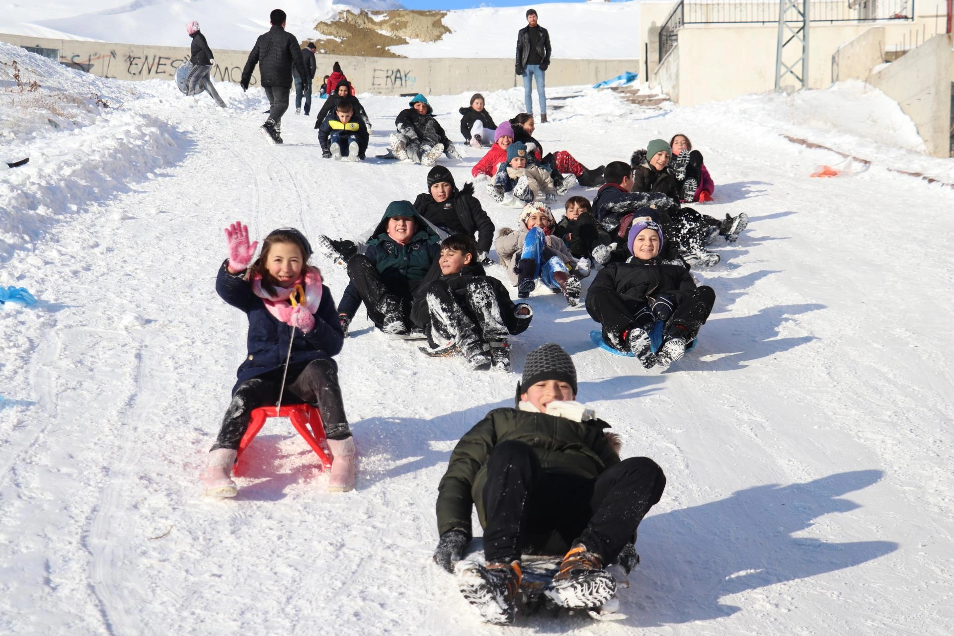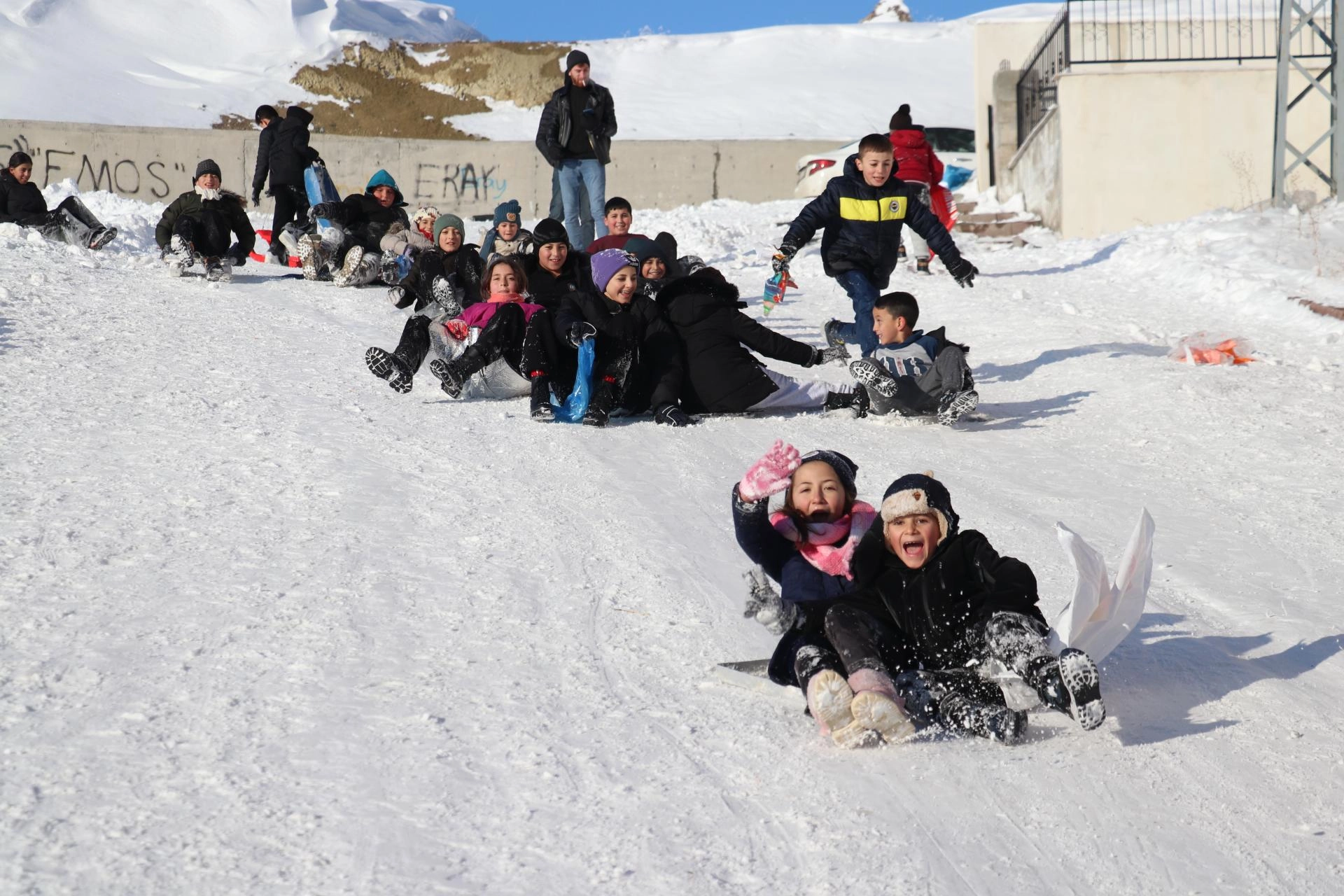 Fatih Mahallesi'ndeki yokuşa gelen çocuklar ise poşet, tepsi ve kızaklarla kayarak gönüllerince eğlendi.