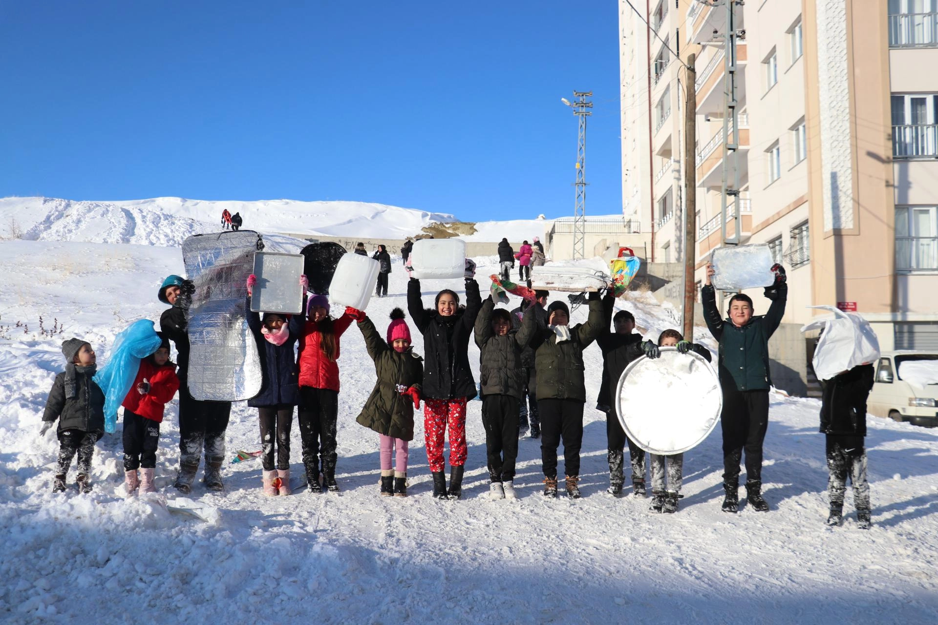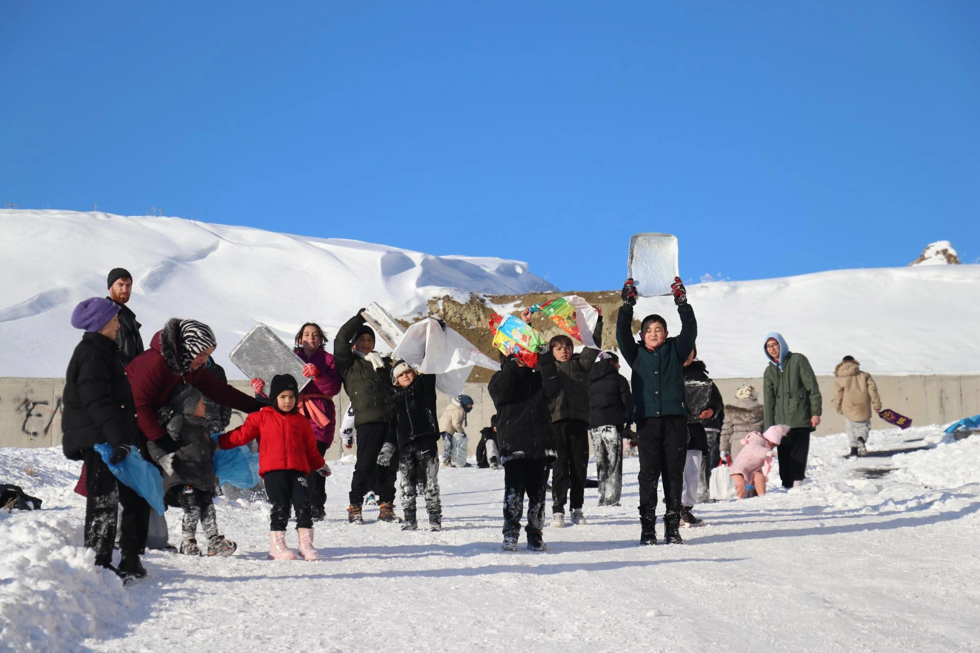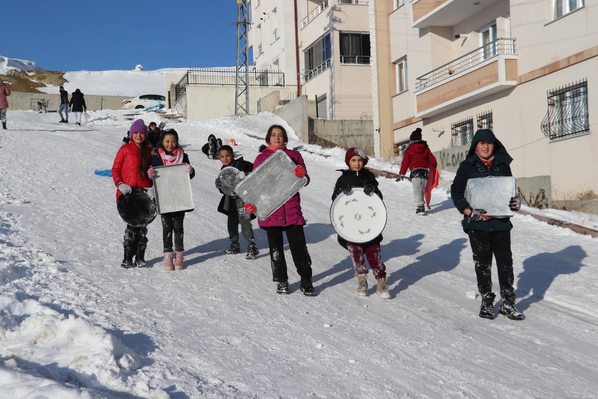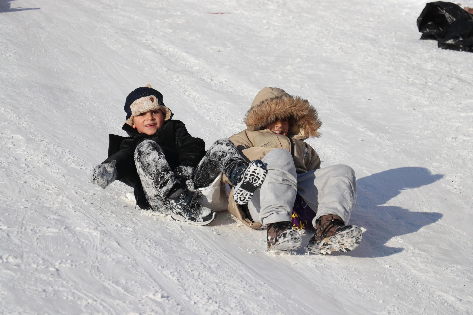 Çocuklardan Melih Dalak, "Burada karın tadını çıkarıyoruz. Gayet güzel, tepsilerimizi alıp kaymaya geldik." ifadesini kullandı.