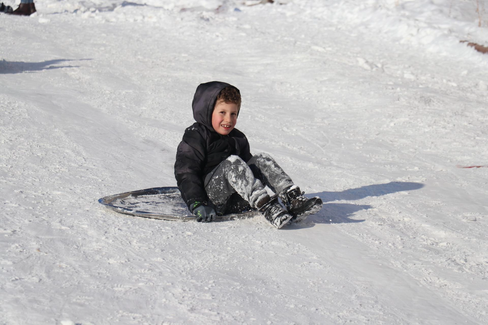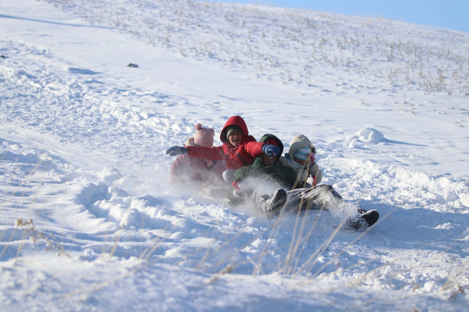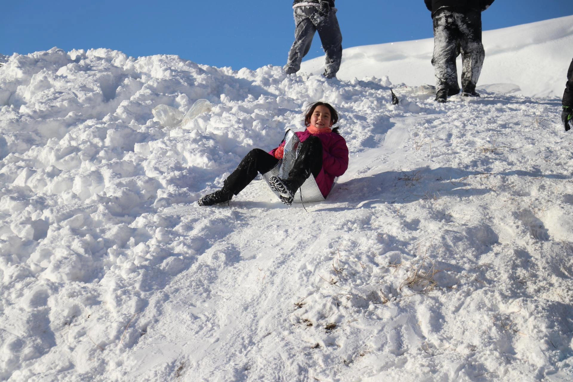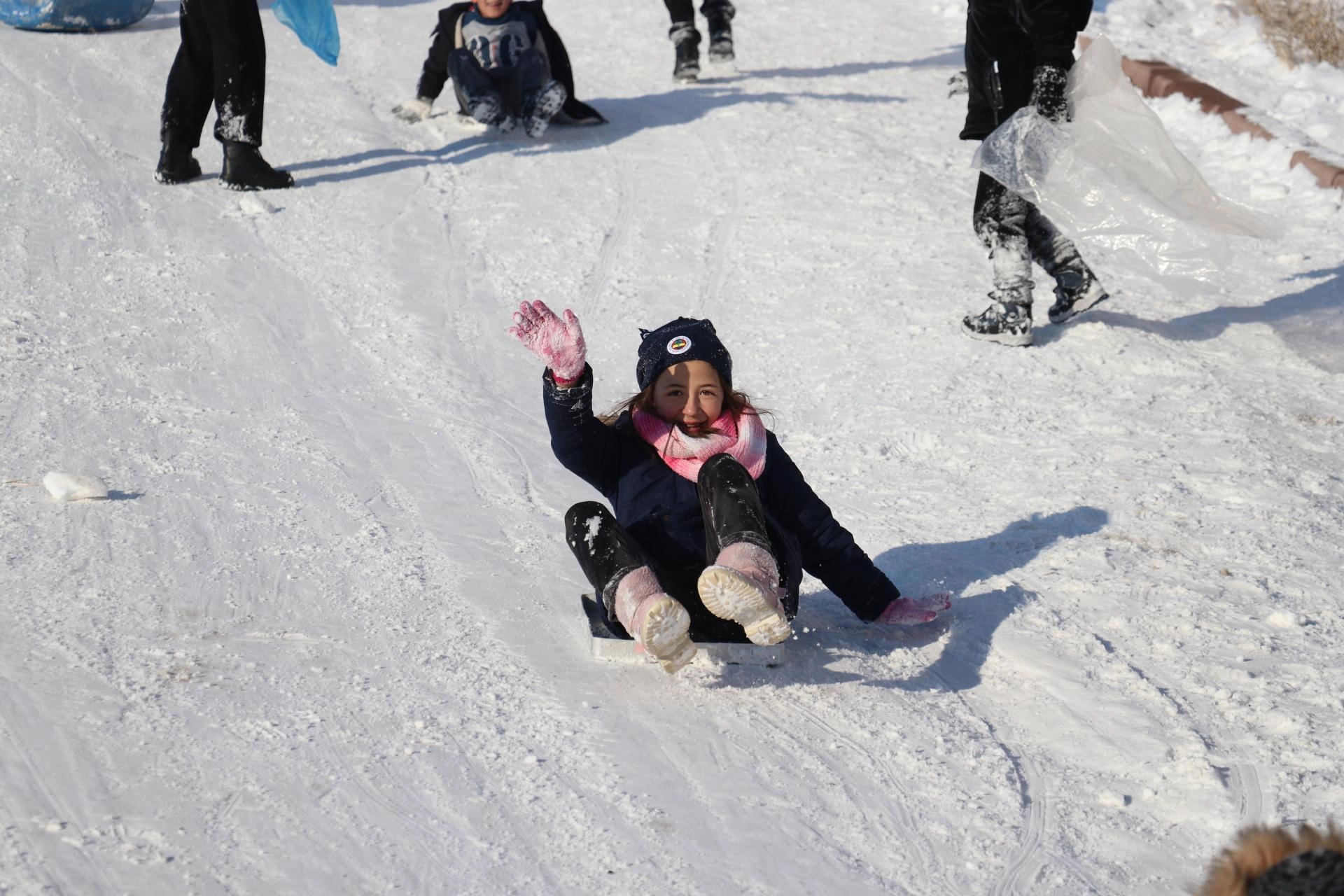 Çocuklardan Melih Dalak, "Burada karın tadını çıkarıyoruz. Gayet güzel, tepsilerimizi alıp kaymaya geldik." ifadesini kullandı.