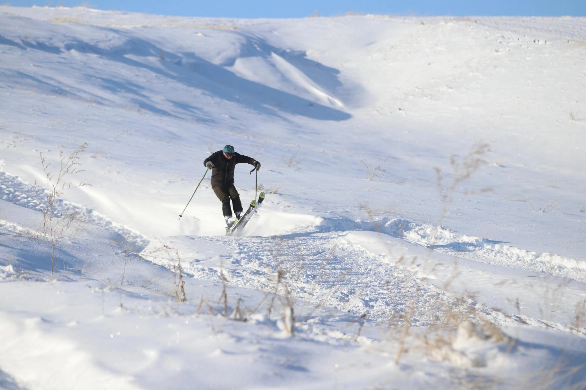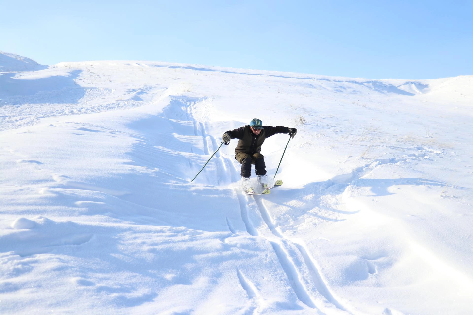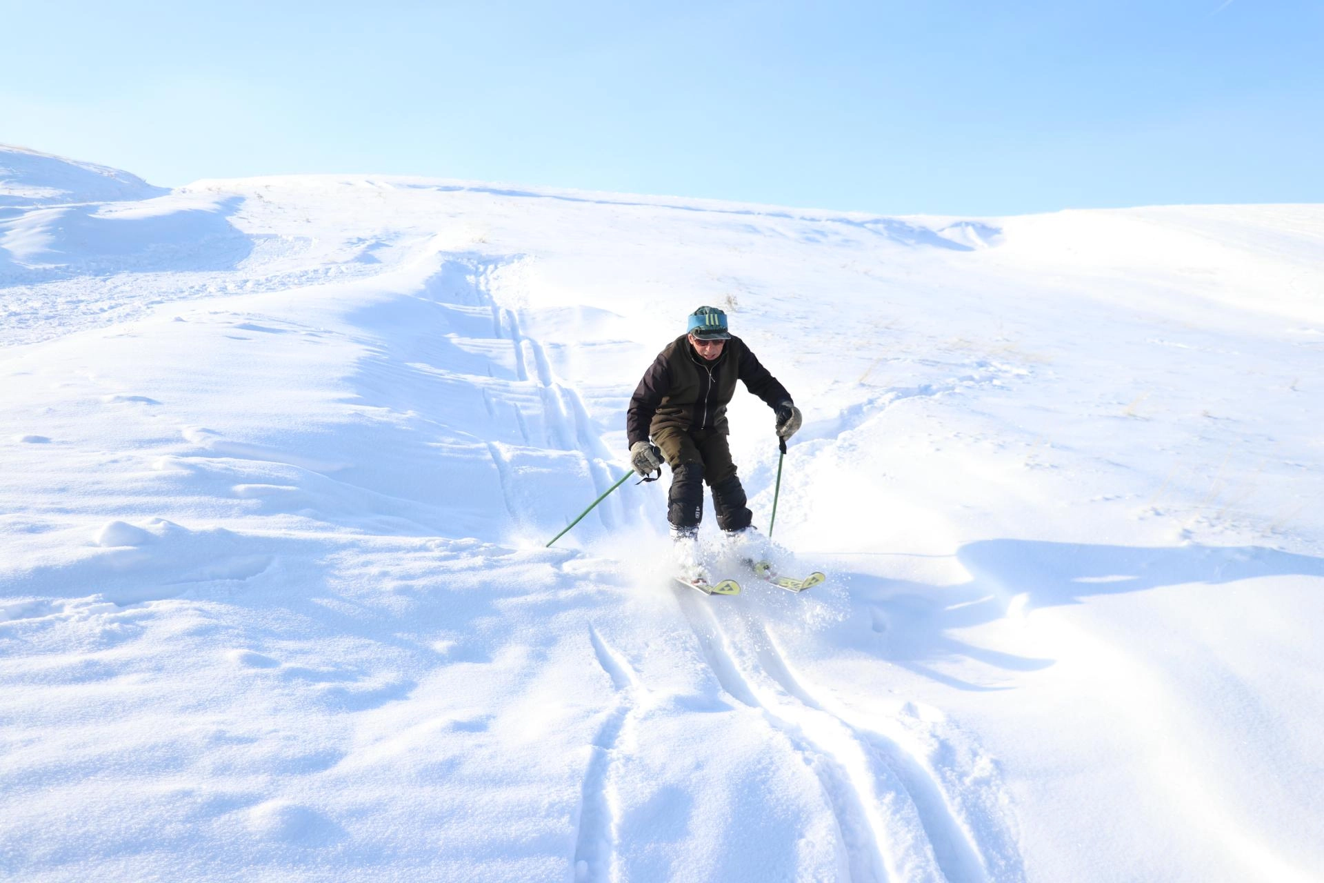 Aynı bölgede kendisine özel pist yapan 78 yaşındaki Mehmet Sarıtaş ise kayak takımlarıyla kayarak karın keyfini doyasıya yaşadı.