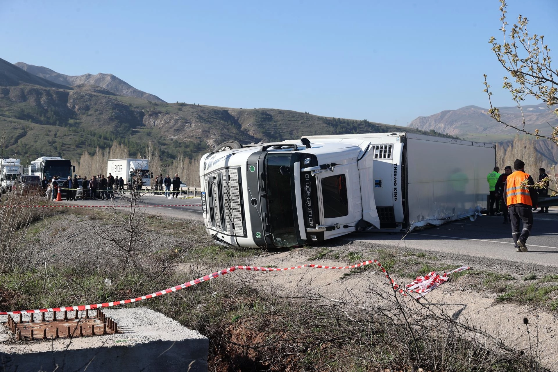 S.B. yönetimindeki 33 CKN 45 plakalı meyve ve sebze yüklü tır, Sivas-Kayseri kara yolunun Mescitli köyü yakınlarında devrildi.