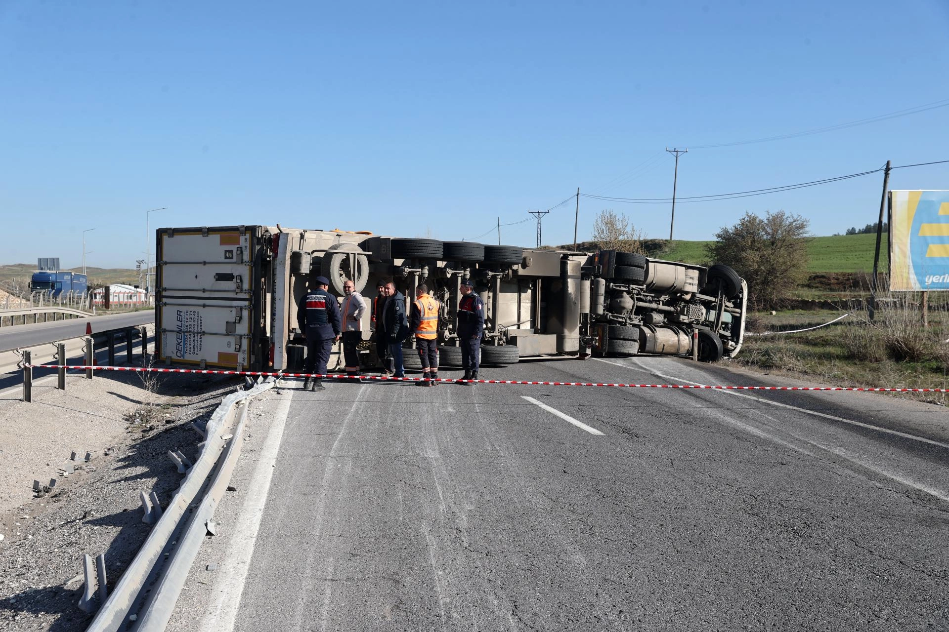 Ekipler trafik akışını tek yönden kontrollü olarak sağlarken, devrilen tırın kaldırılması için çalışma başlatıldı.