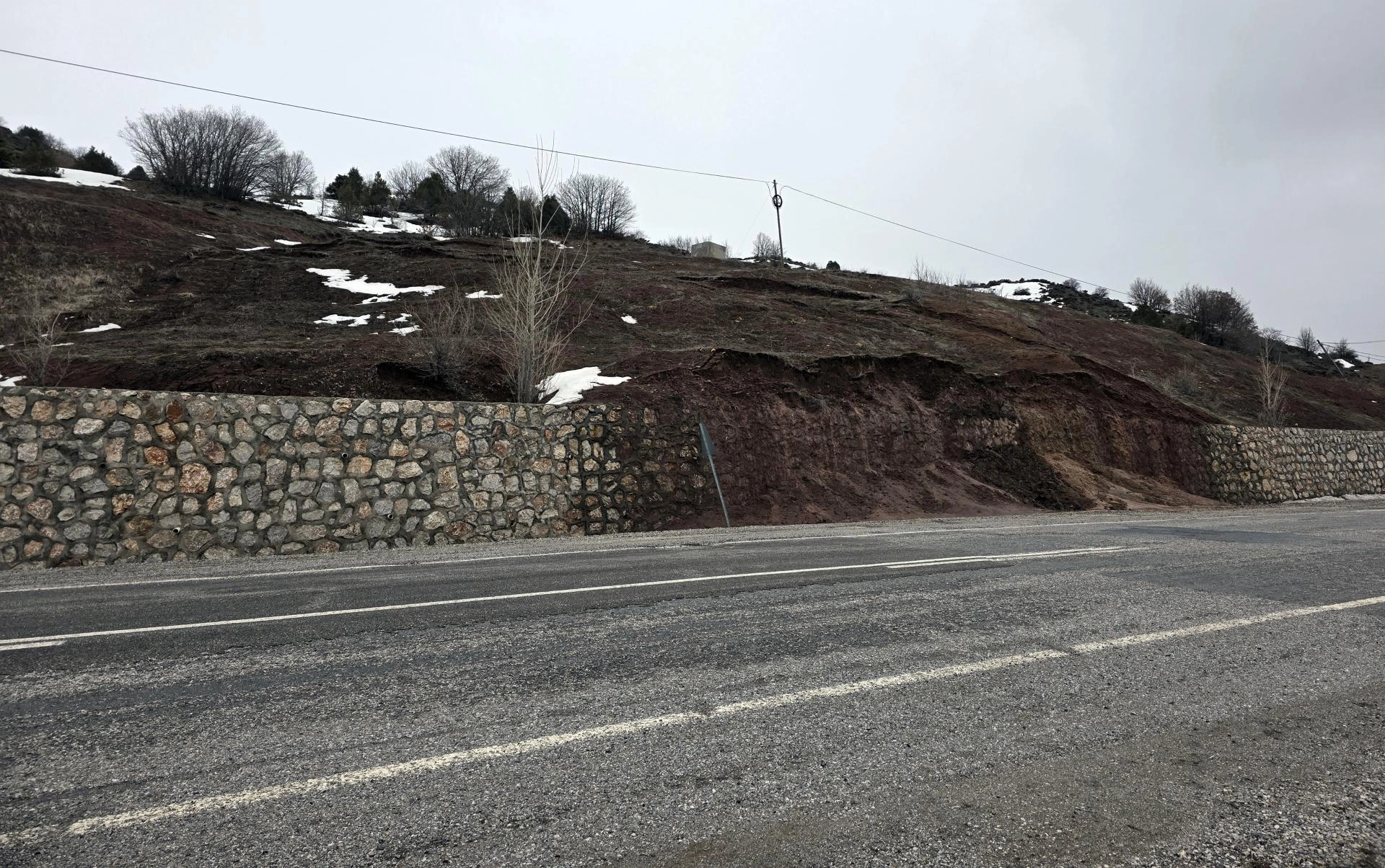 Yamaçtan kayan toprak kütleleri, yol kenarındaki istinat duvarını aşarak asfalt zemine aktı.