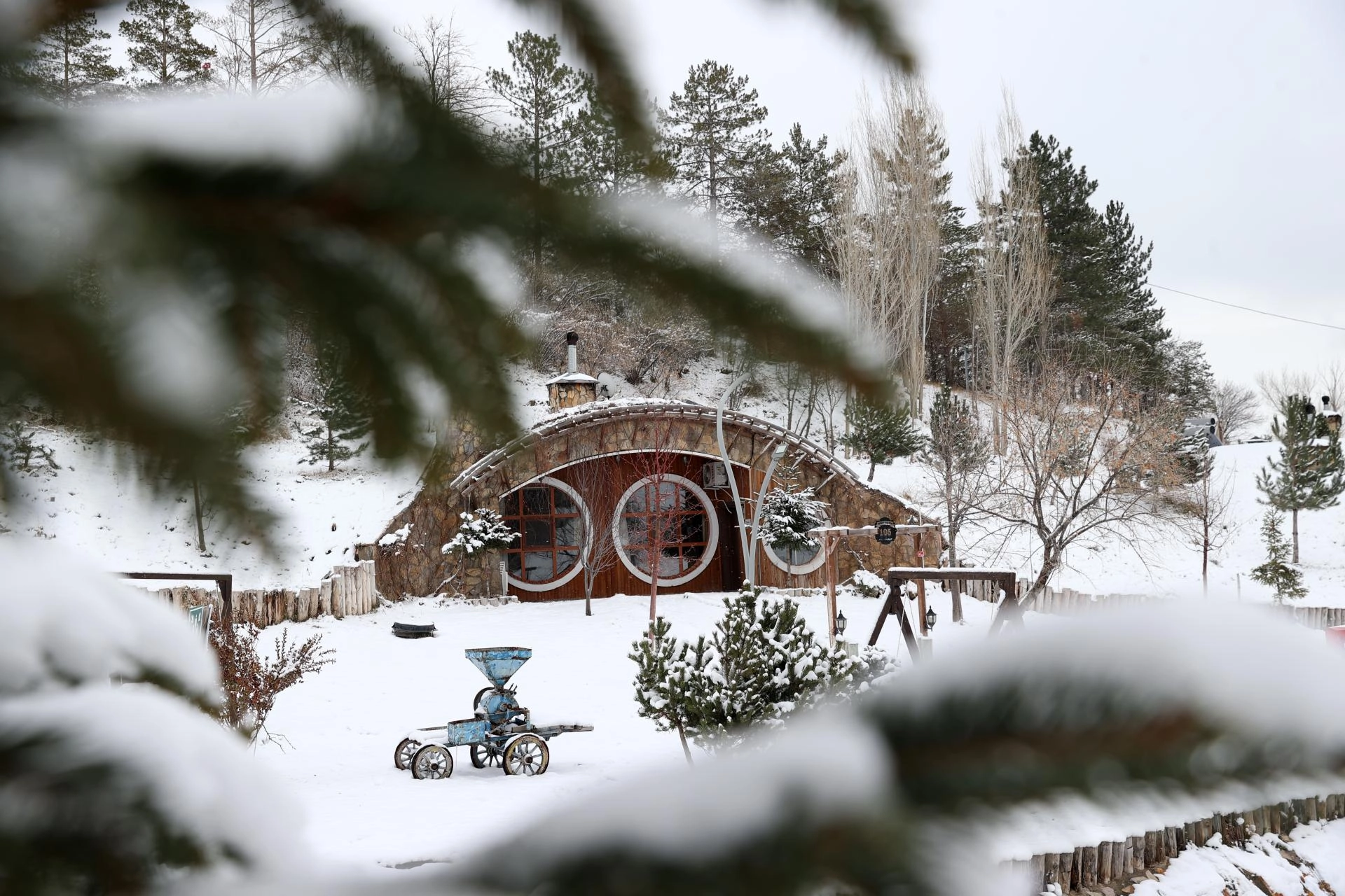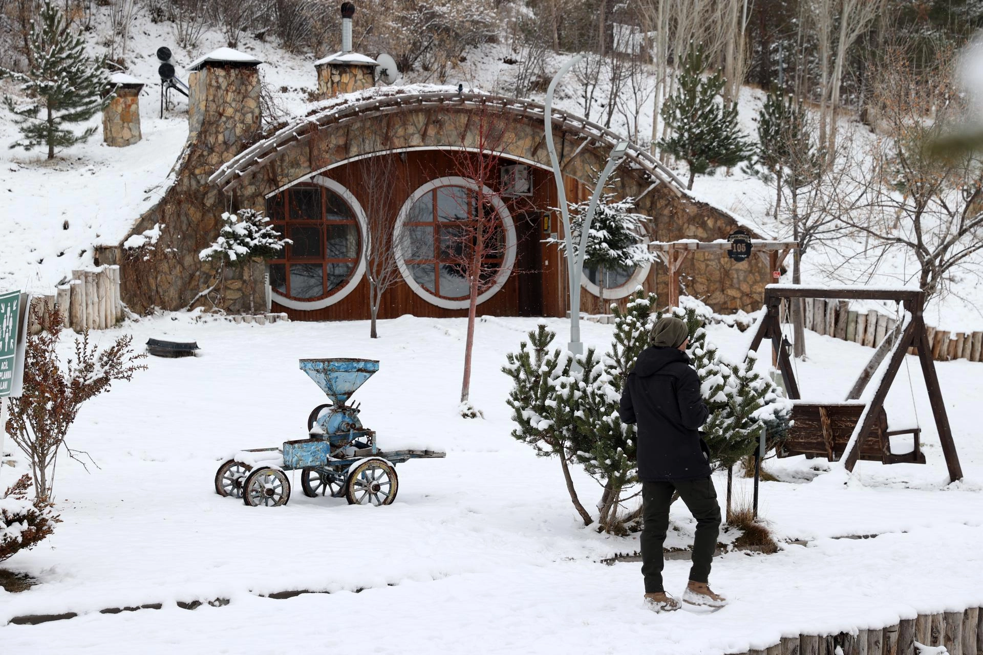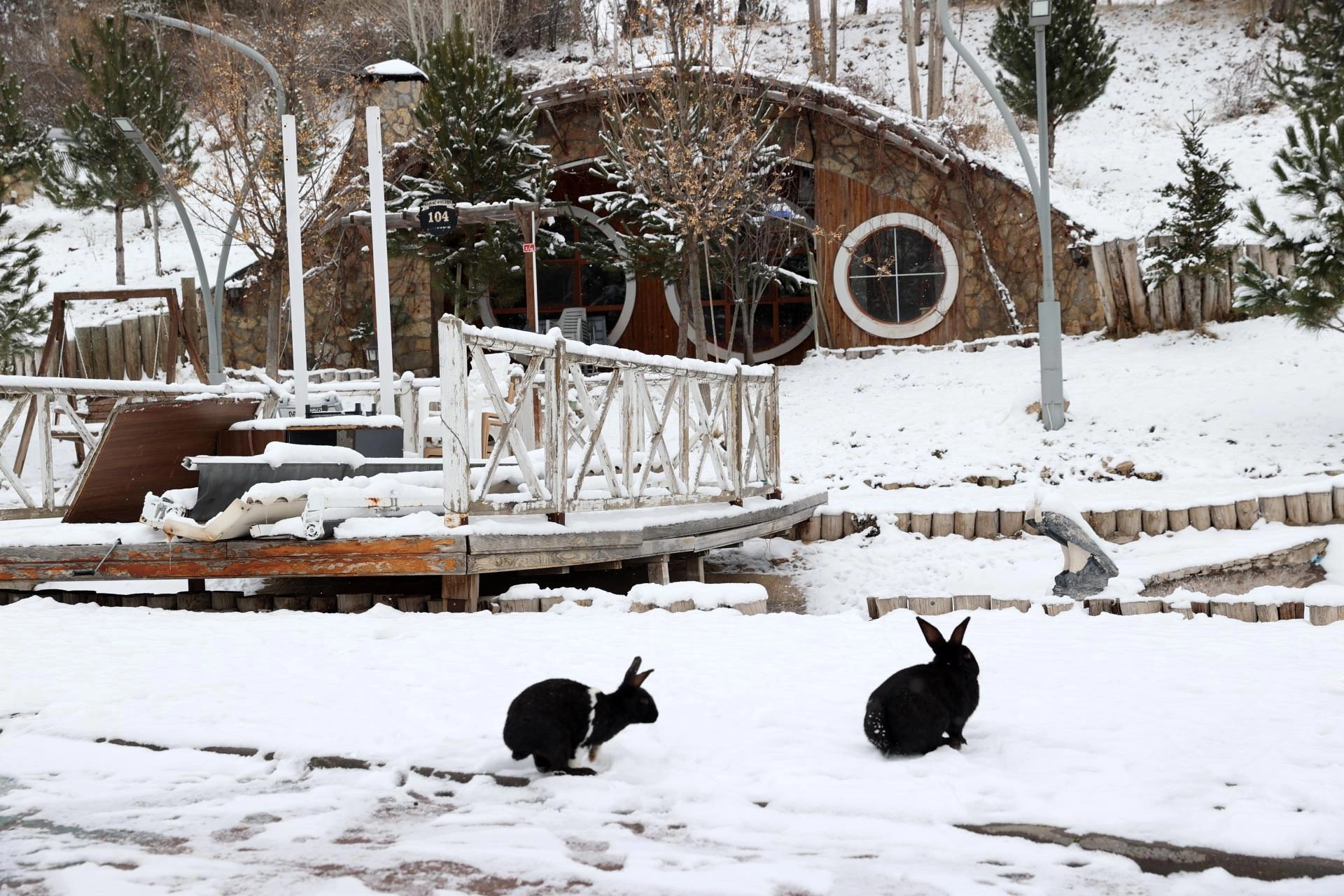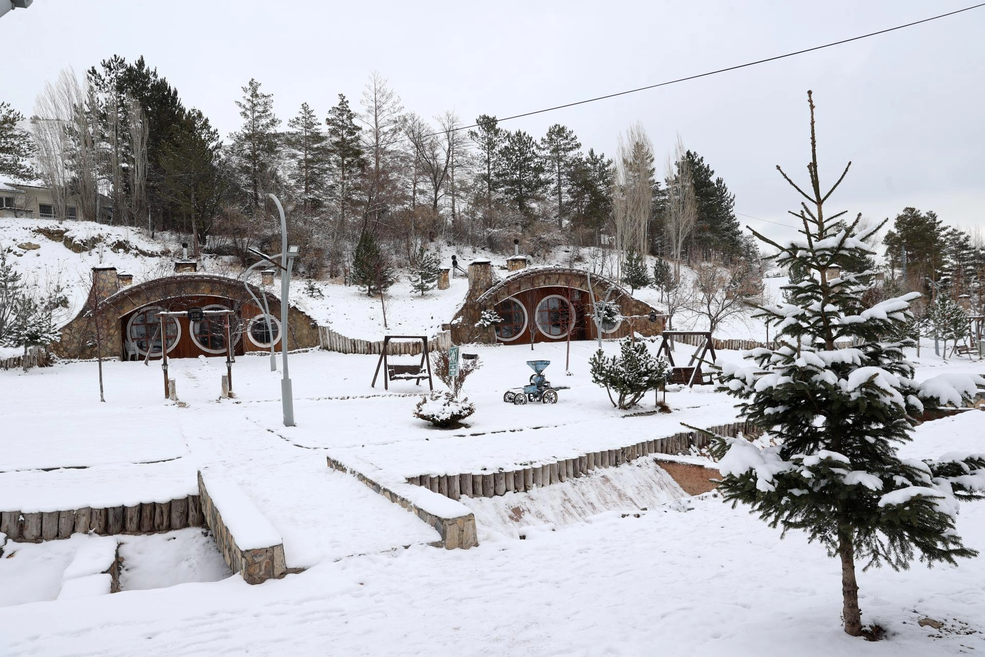 SİVAS (AA) - Sivas'ta etkili olan karın ardından, Sivas Belediyesince "Yüzüklerin Efendisi" filmindeki "Hobbit Evleri"nden esinlenerek inşa edilen yamaç evleri beyaz örtüyle kaplandı.