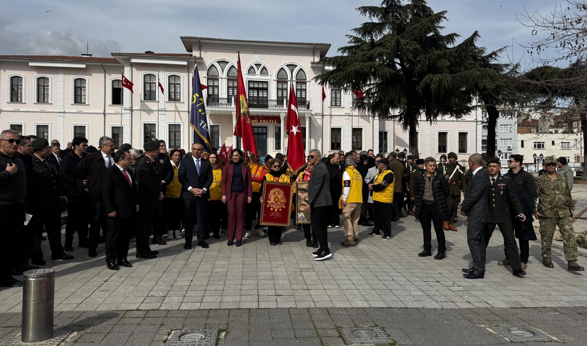 Burada saygı duruşunda bulunulması ve İstiklal Marşı’nın okunmasının ardından Tekirdağ Valisi Recep Soytürk, Garnizon Komutanı Tuğgeneral Aytuğ Yörüyüş ve Büyükşehir Belediye Başkanı Candan Yüceer tarafından anıta çelenk sunuldu.