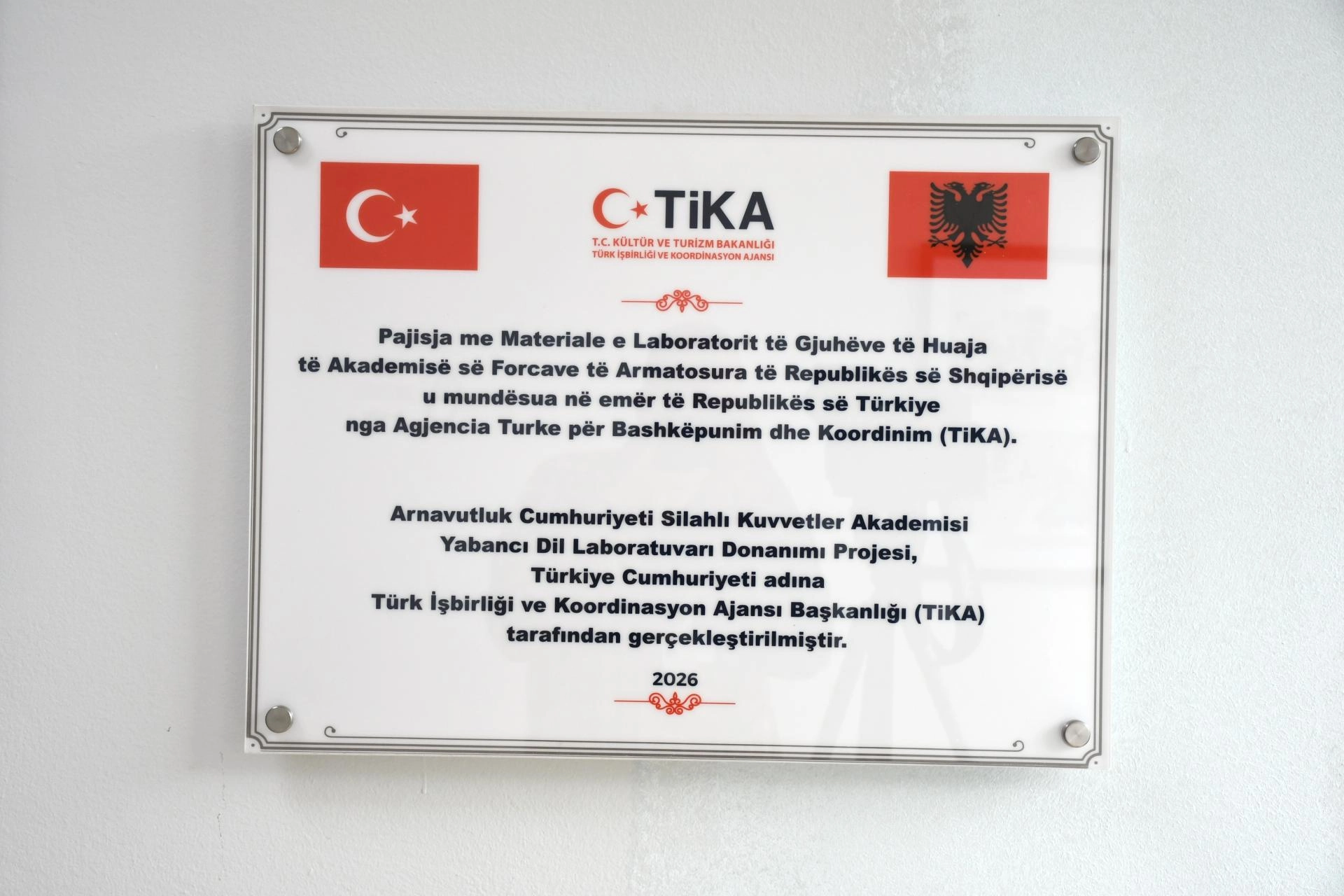 TİRAN (AA) - Türk İşbirliği ve Koordinasyon Ajansı Başkanlığınca (TİKA) yürütülen "Arnavutluk Silahlı Kuvvetler Akademisi Yabancı Dil Laboratuvarı Donanım Projesi" kapsamında açılış töreni düzenlendi.
