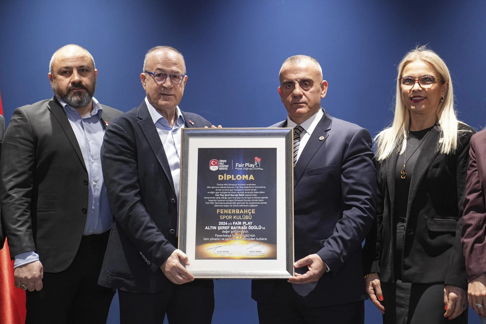 TMOK Fair Play Komisyonu Başkanı Haldun Domaç, söz konusu ödülün ilkinin de Fenerbahçe Kulübüne verildiğini belirterek, "Bir önceki dönem başlattığımız 'Fair Play Altın Şeref Bayrağı' ile ilgili bir çalışmamız vardı. Bu çalışmamızın birincisini Fenerbahçe kazanmıştı. Şimdi ikincisini de yine Fenerbahçe'ye takdim edeceğiz. 'Fair Play Altın Şeref Bayrağı' olimpiyatlara en fazla sporcu gönderen, Türk sporuna hizmet konusunda altyapıların beslenmesi konusunda çok önemli katkılar veren, fair play ruhunu çok doğru bir şekilde yansıtan Fenerbahçe Kulübü, açık ara bir oylamayla bu başarıyı elde etti. Bugün buraya bayrağı teslim etmek için geldik. Kendilerine çok teşekkür ediyoruz." diye konuştu.