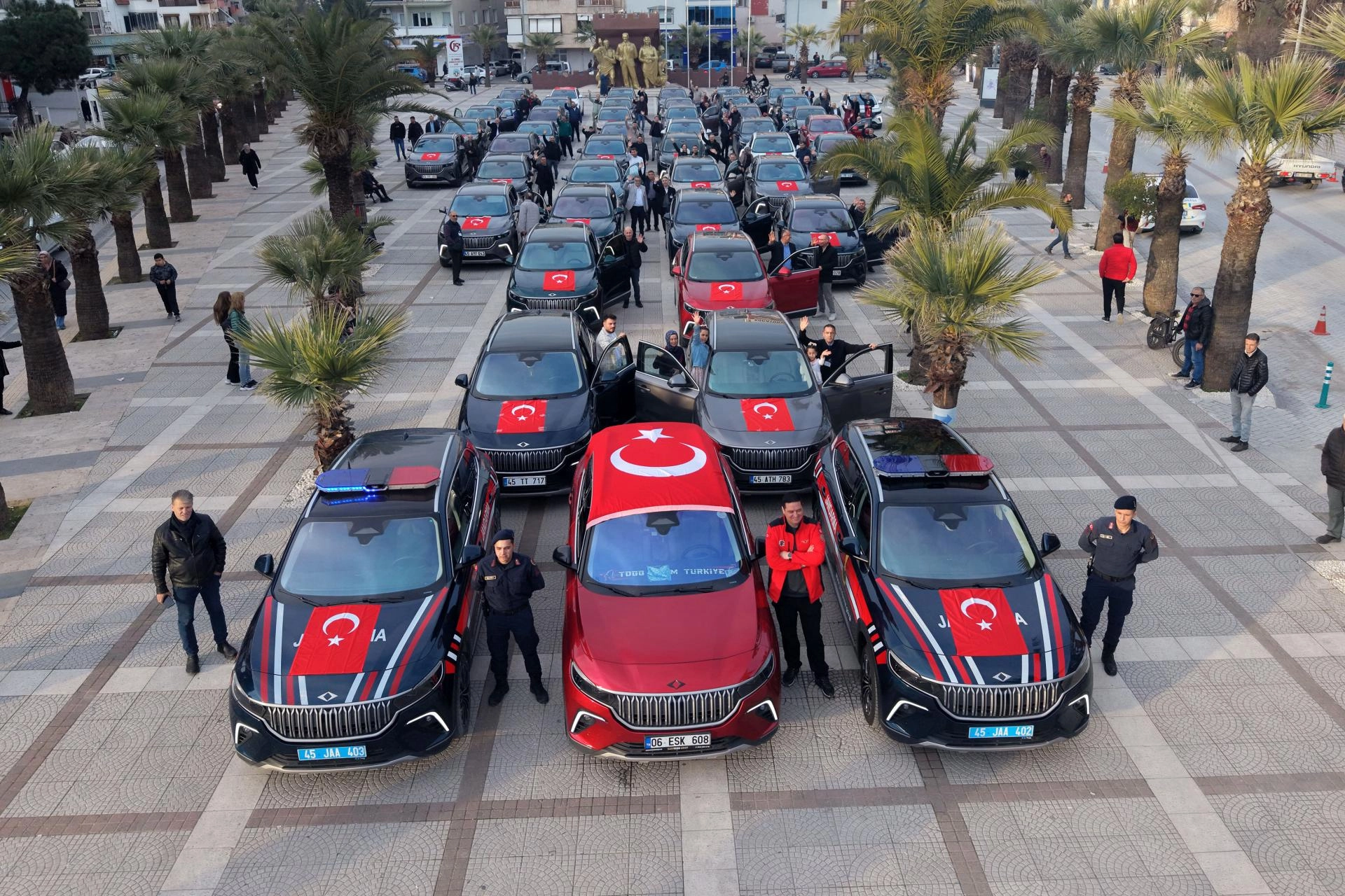 Ankara, İzmir, İstanbul, Adana ile Manisa ve çevre illerden gelen yaklaşık 50 TOGG sürücüsü ile Manisa İl Jandarma Komutanlığı envanterinde bulunan 2 TOGG, 15 Temmuz Demokrasi Şehitleri Alanı'nda toplandı.