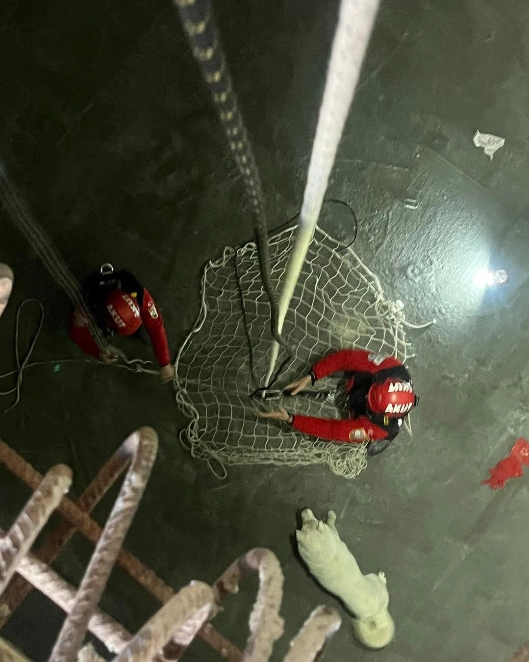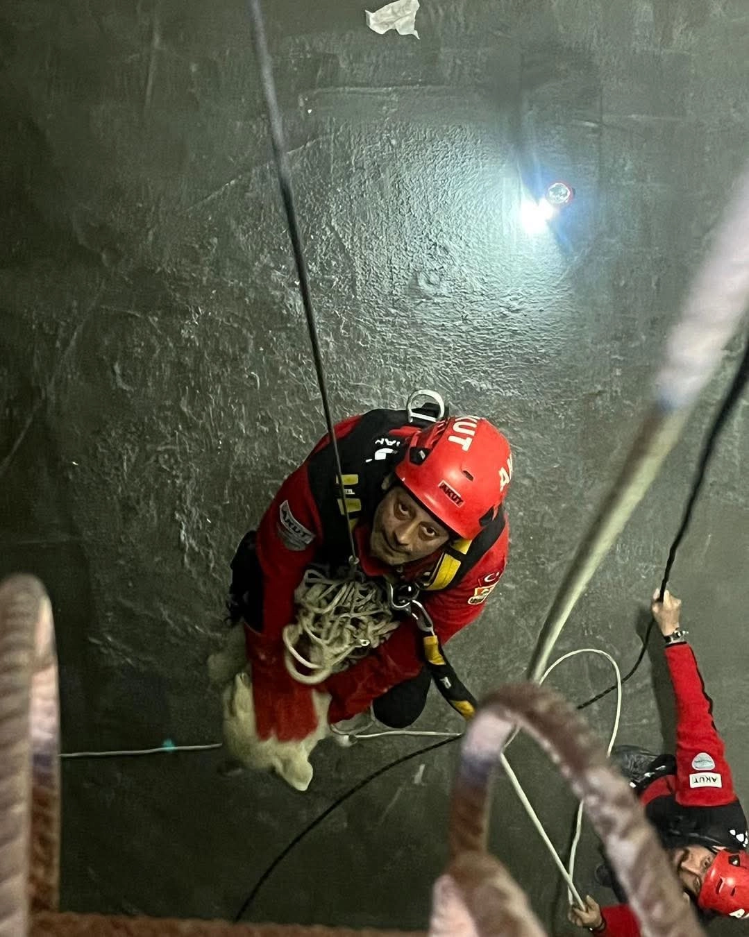 Kurtarma çalışması başlatan ekipler, halat yardımıyla indikleri çukurdaki köpeği mahsur kaldığı yerden çıkardı.