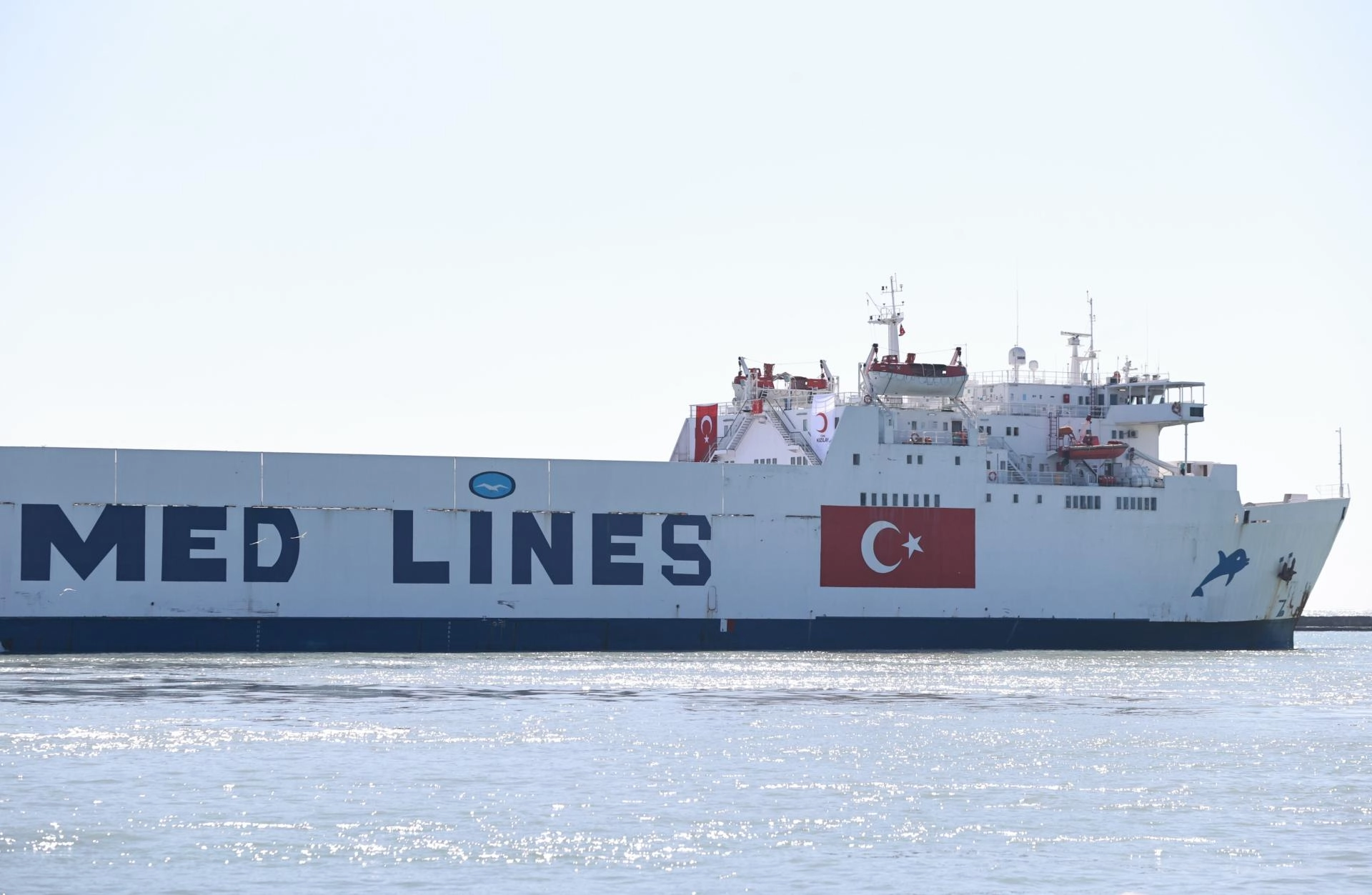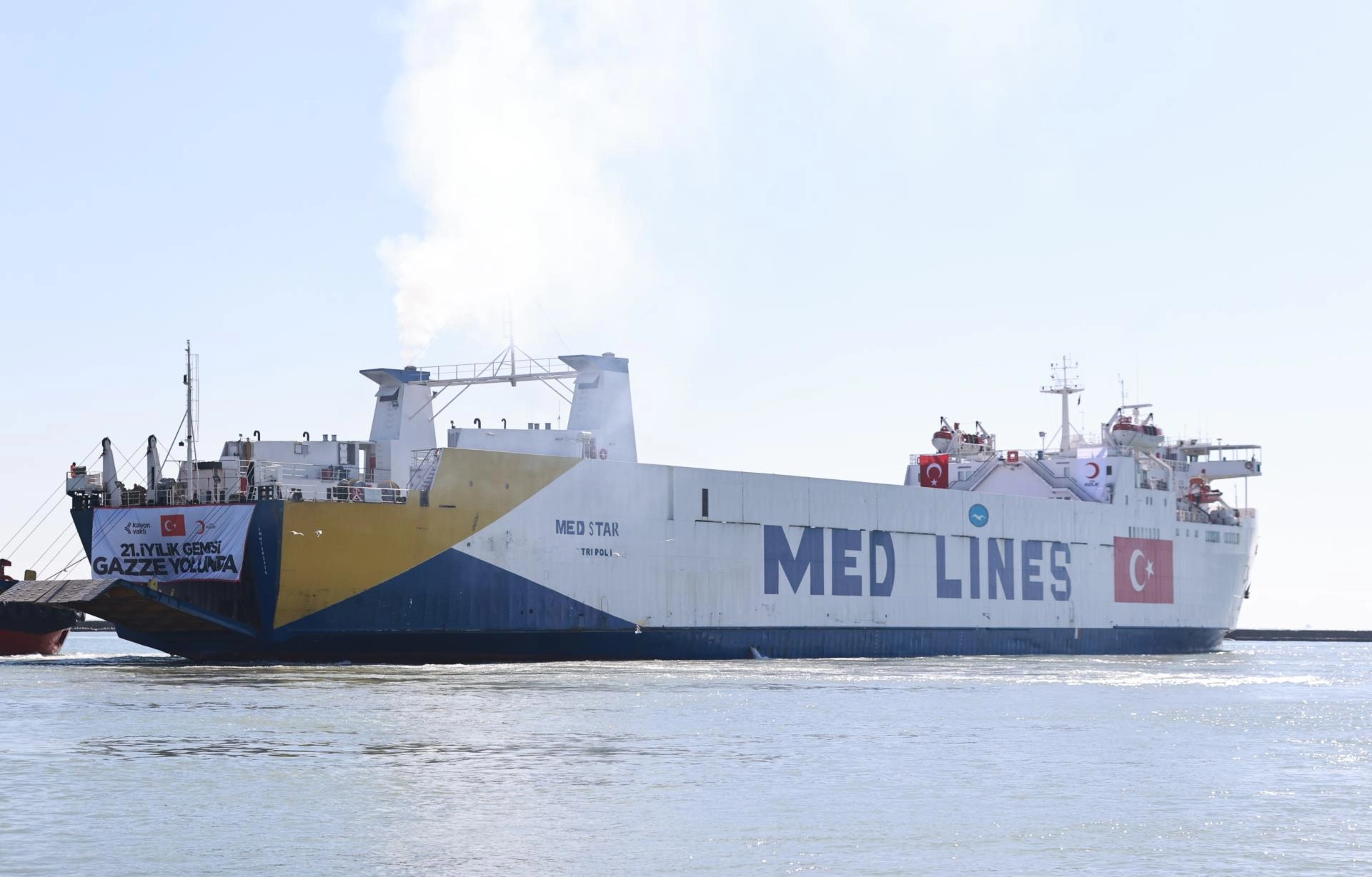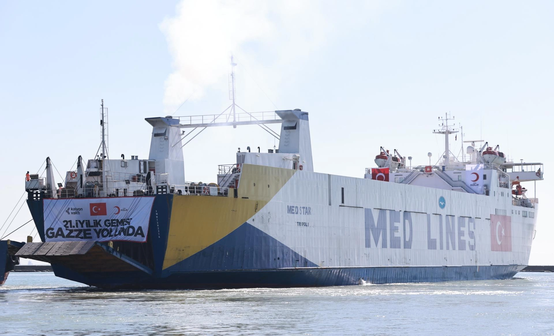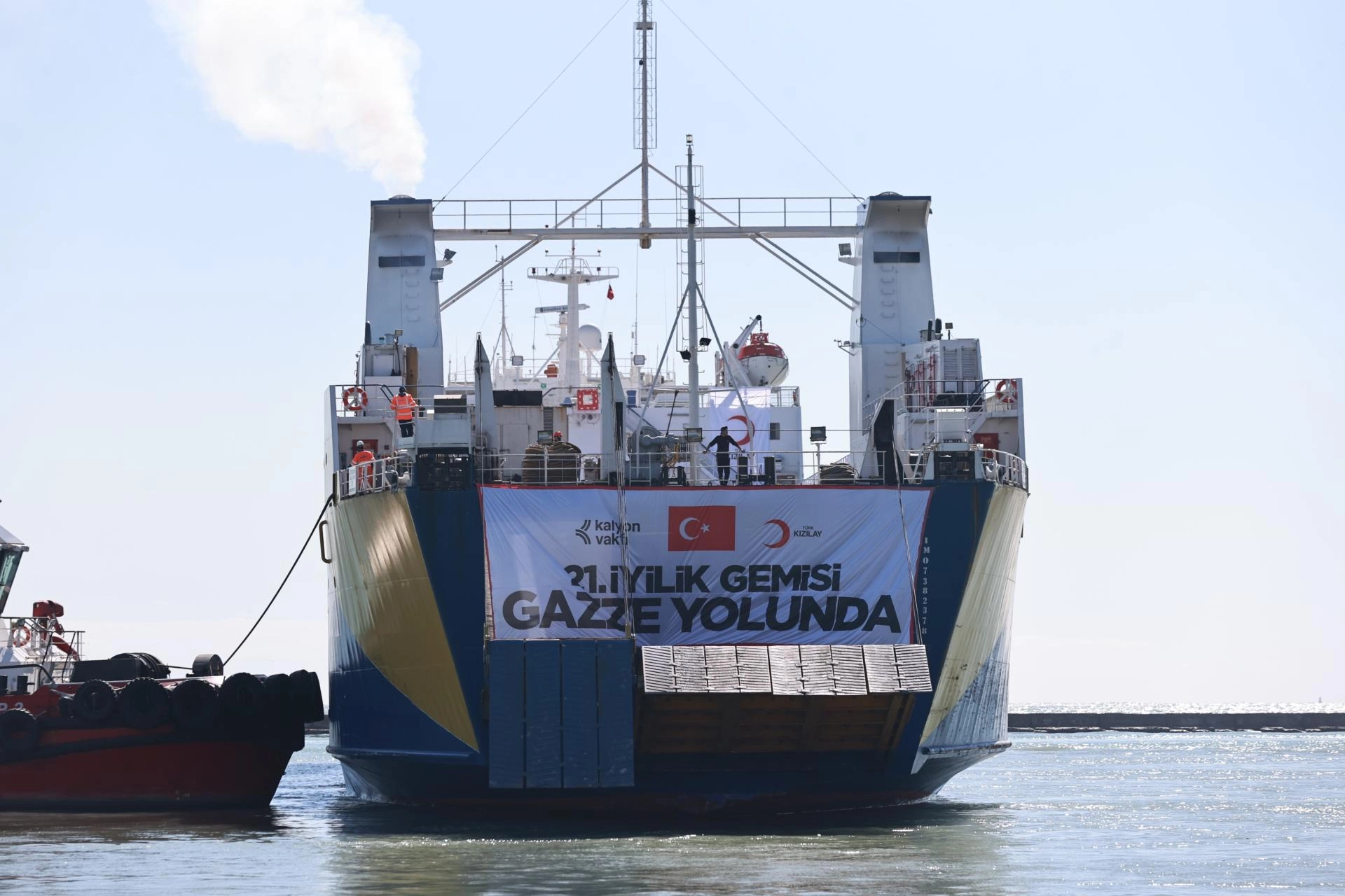Türk Kızılay'ın Gazze'ye gönderilmek üzere hazırladığı içerisinde yaklaşık 175 bin gıda kolisi başta olmak üzere giyim, hijyen, barınma, su ve temel yaşam malzemesinin bulunduğu 21. İyilik Gemisi'nin uğurlanması için Mersin Uluslararası Limanı'nda tören düzenlendi.