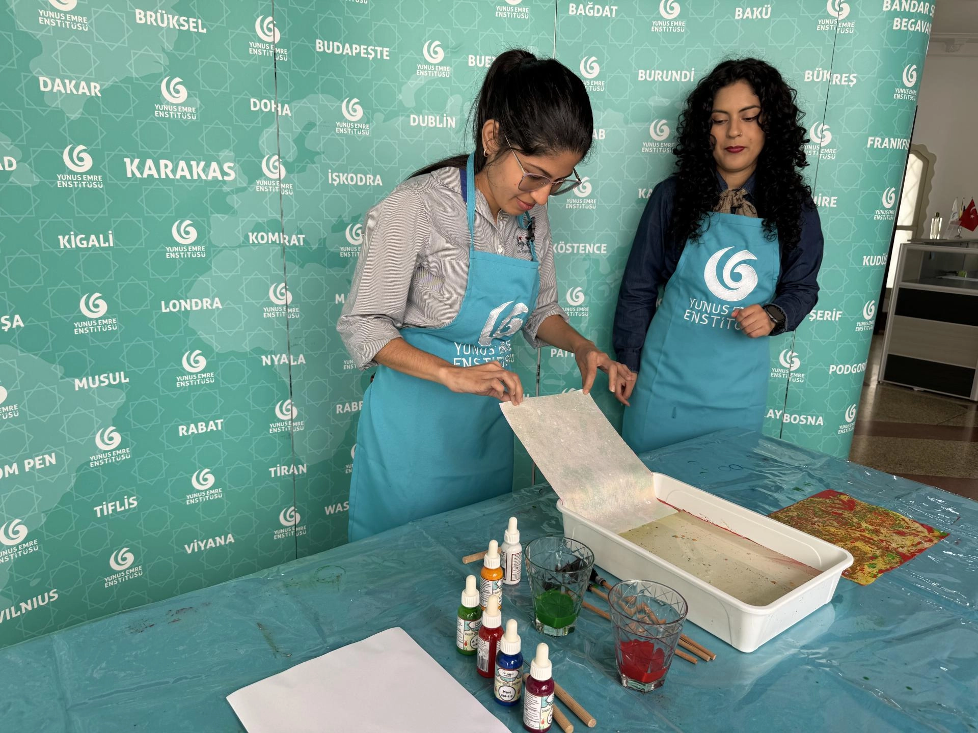 "Grafik sanatlar eğitimimin ardından, el yapımı ciltleme konusuna odaklanmaya başladım. Bu süreçte ebru kağıdı üzerine derinlemesine araştırmalar yaparak bu tekniği uygulama fırsatı buldum. Yıllar sonra yolum buradaki Yunus Emre Enstitüsü ile kesişti. Burada, 'büyülü sanat' olarak da bilinen Ebru sanatı ile tanışma şansına eriştim."