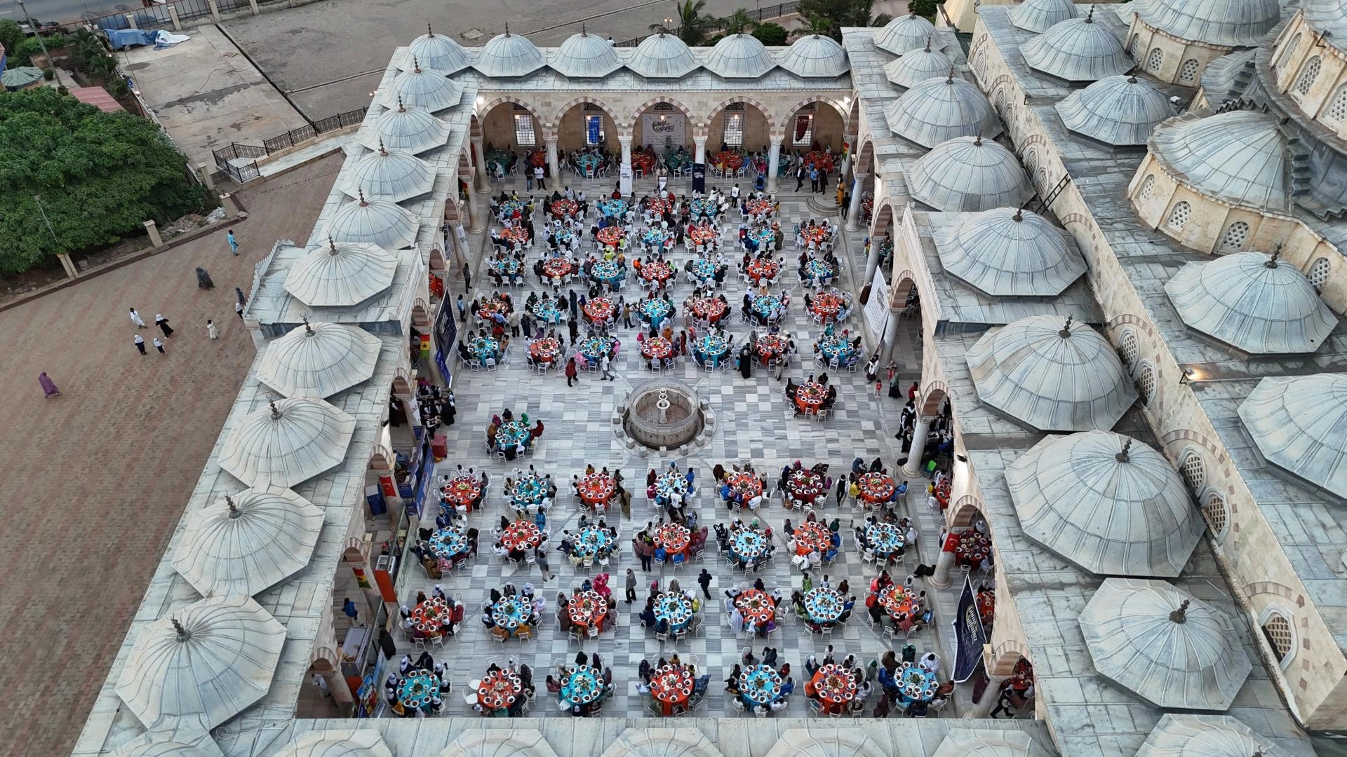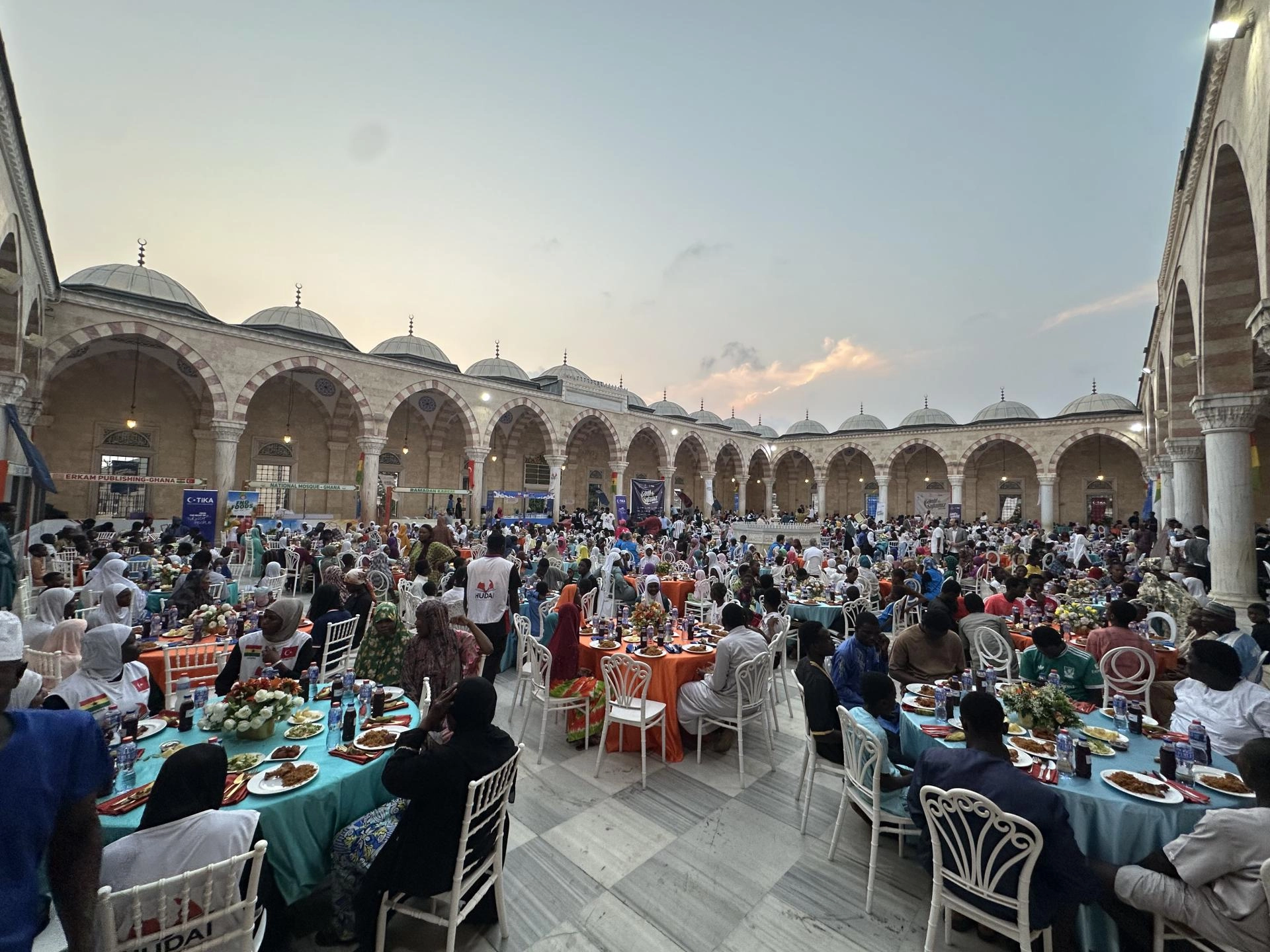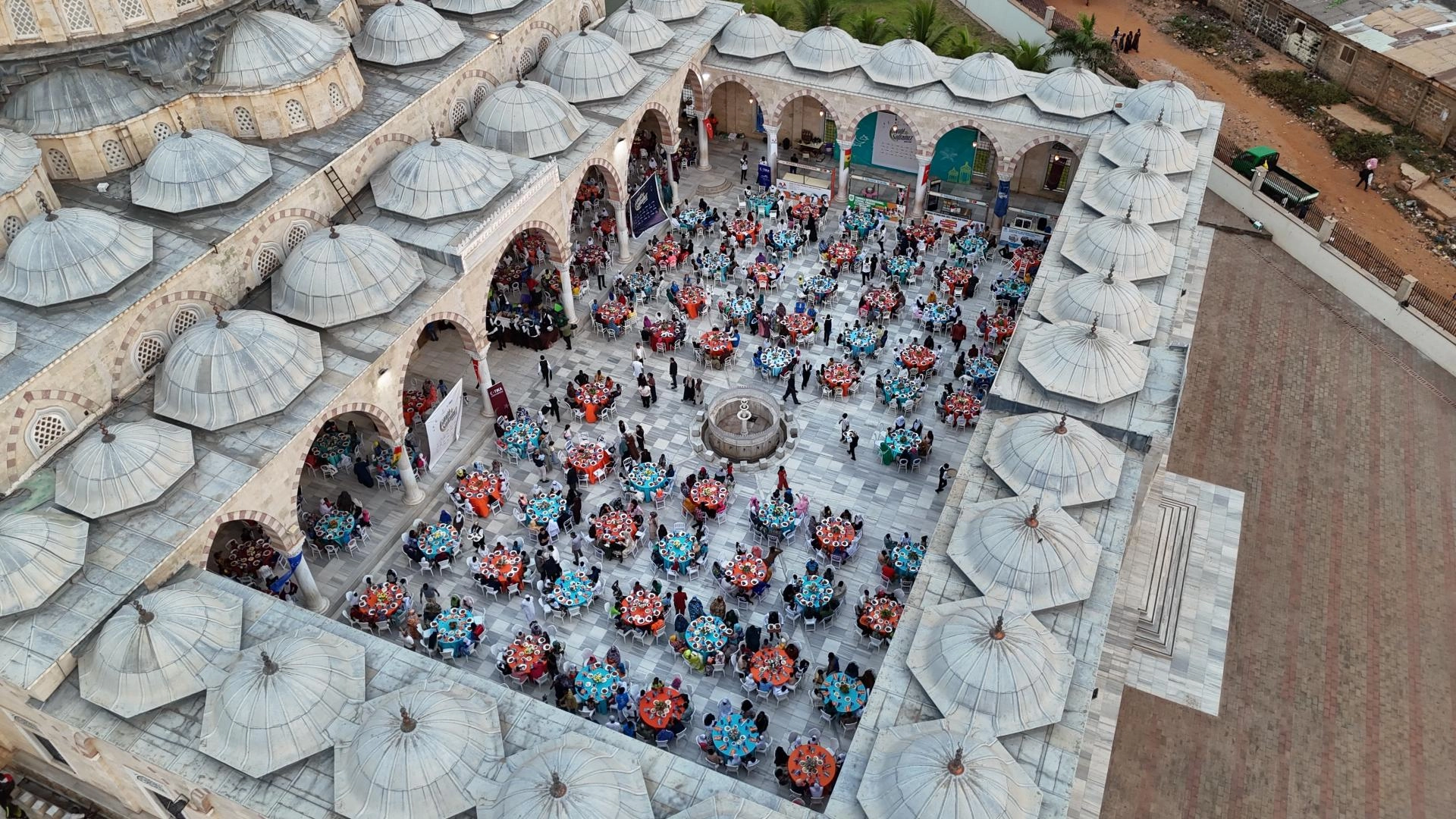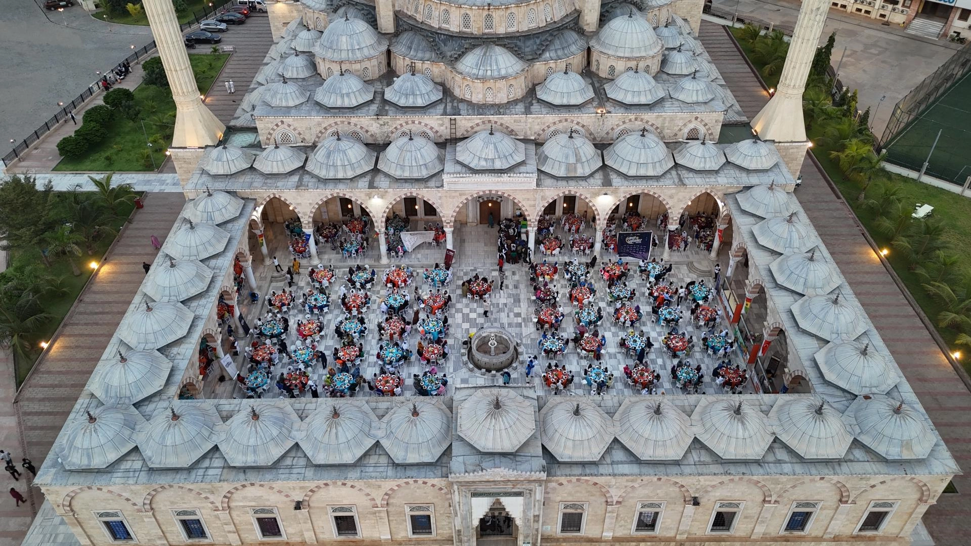 İftar programı, Türk hayırseverlerin desteğiyle inşa edilen Gana Milli Cami ve Külliyesi'nin avlusunda düzenlendi.