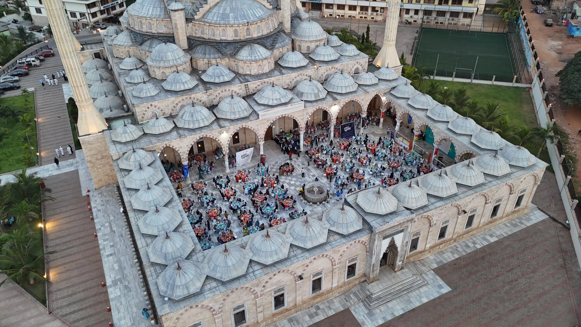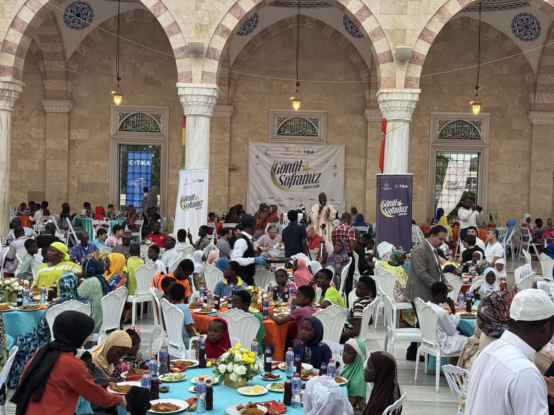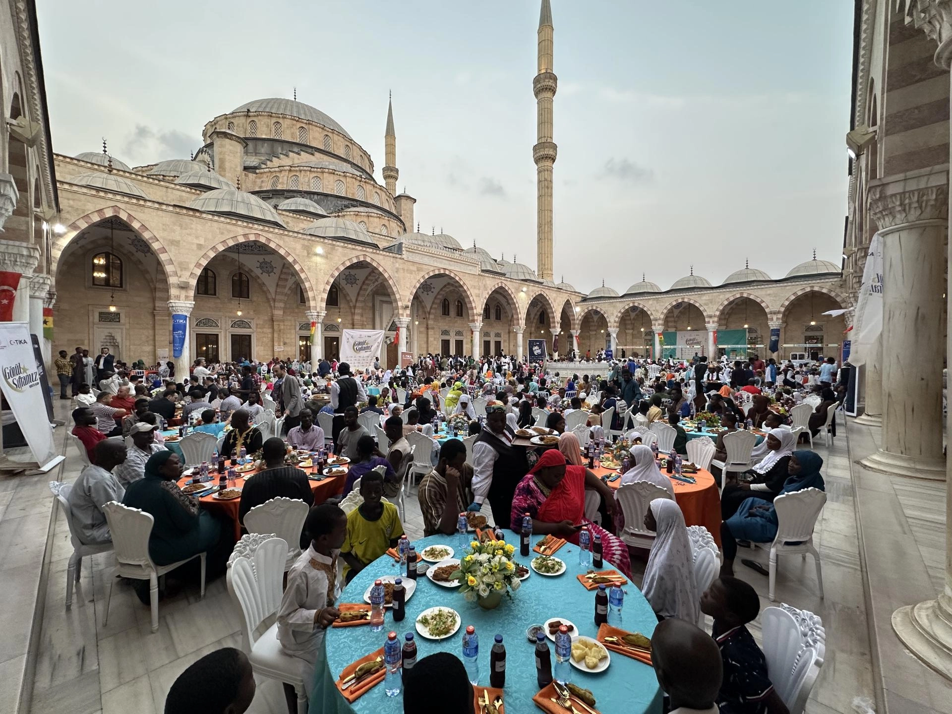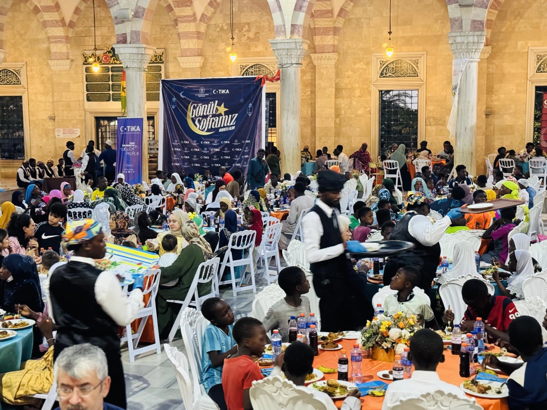 İftar programı, Türk hayırseverlerin desteğiyle inşa edilen Gana Milli Cami ve Külliyesi'nin avlusunda düzenlendi.
