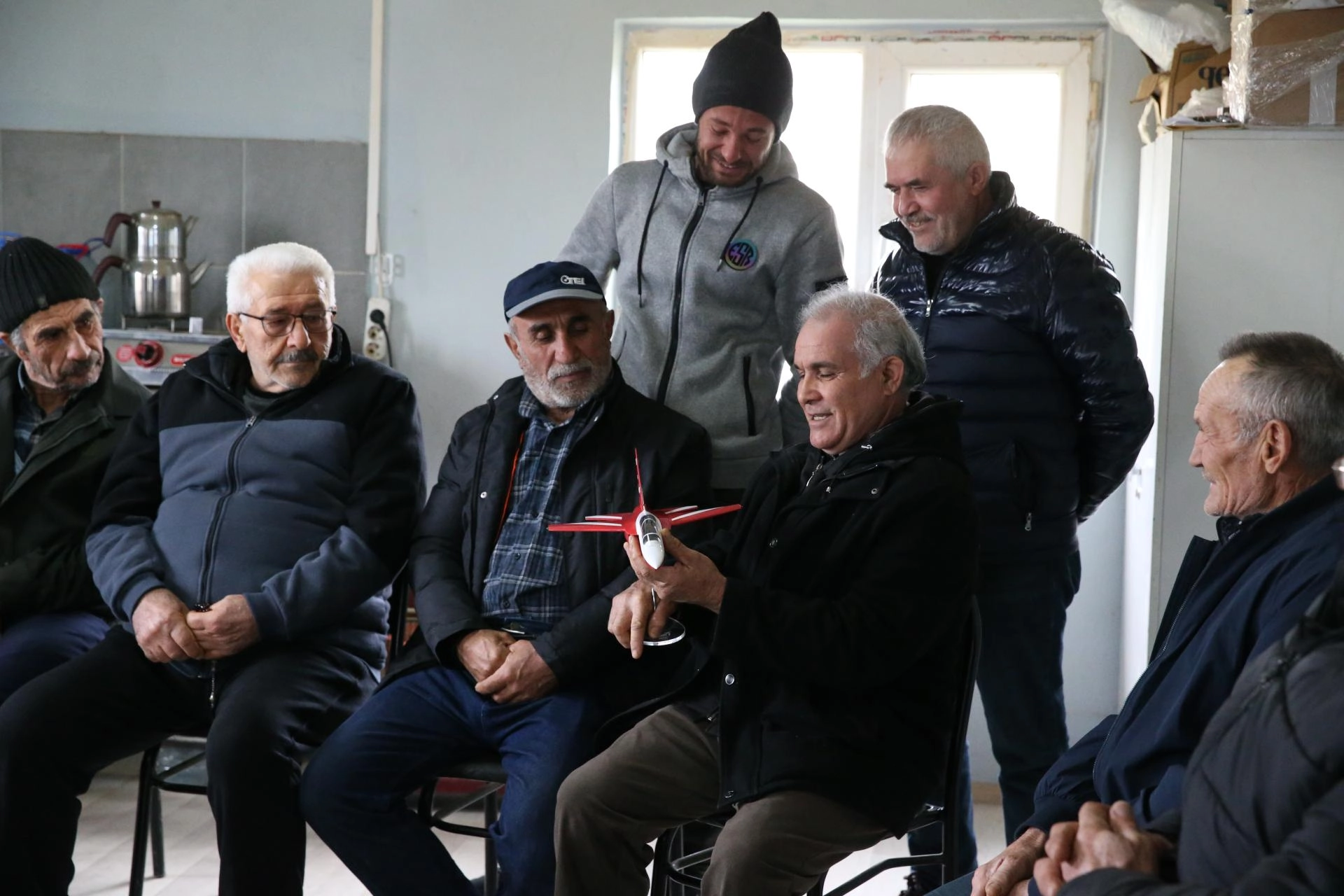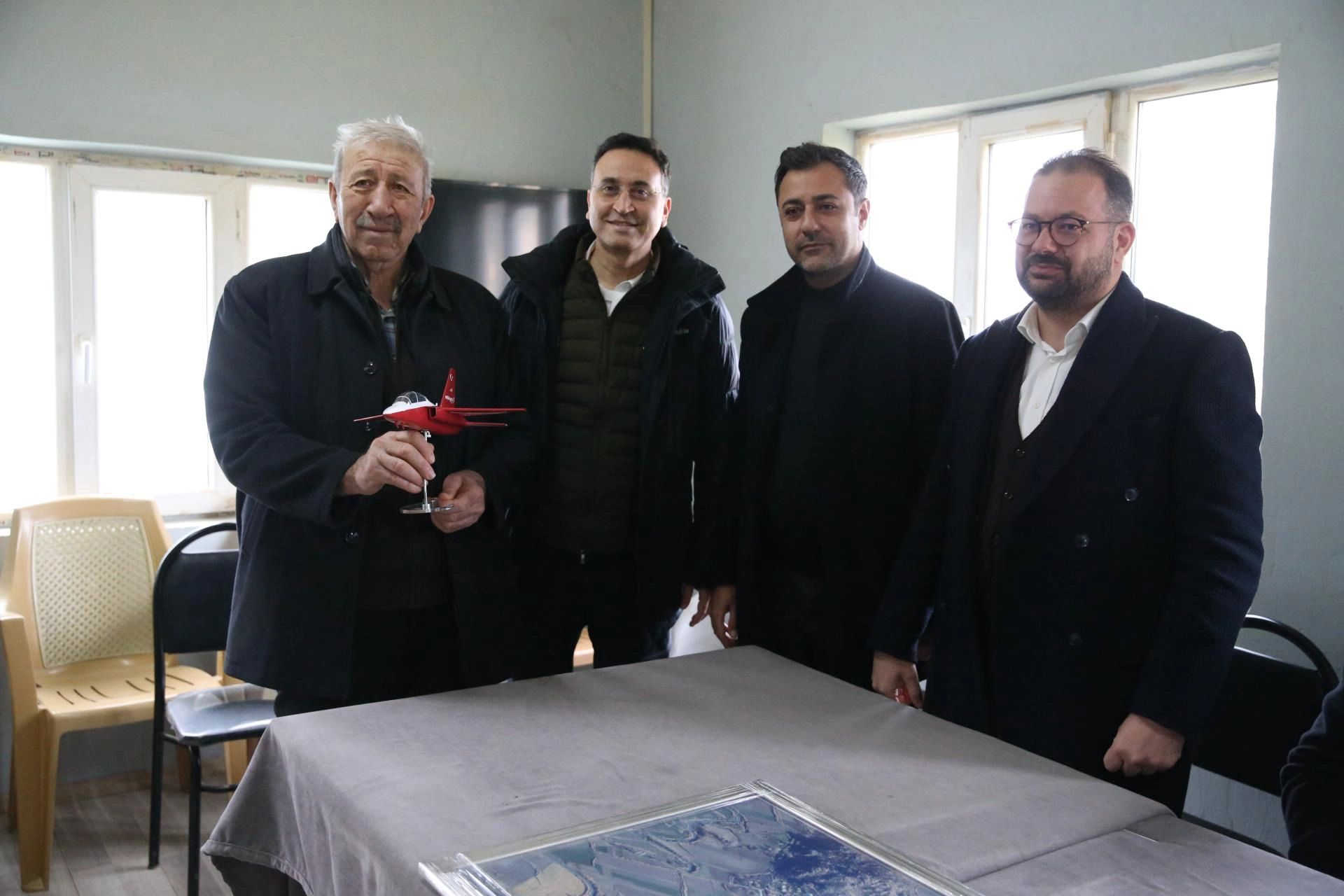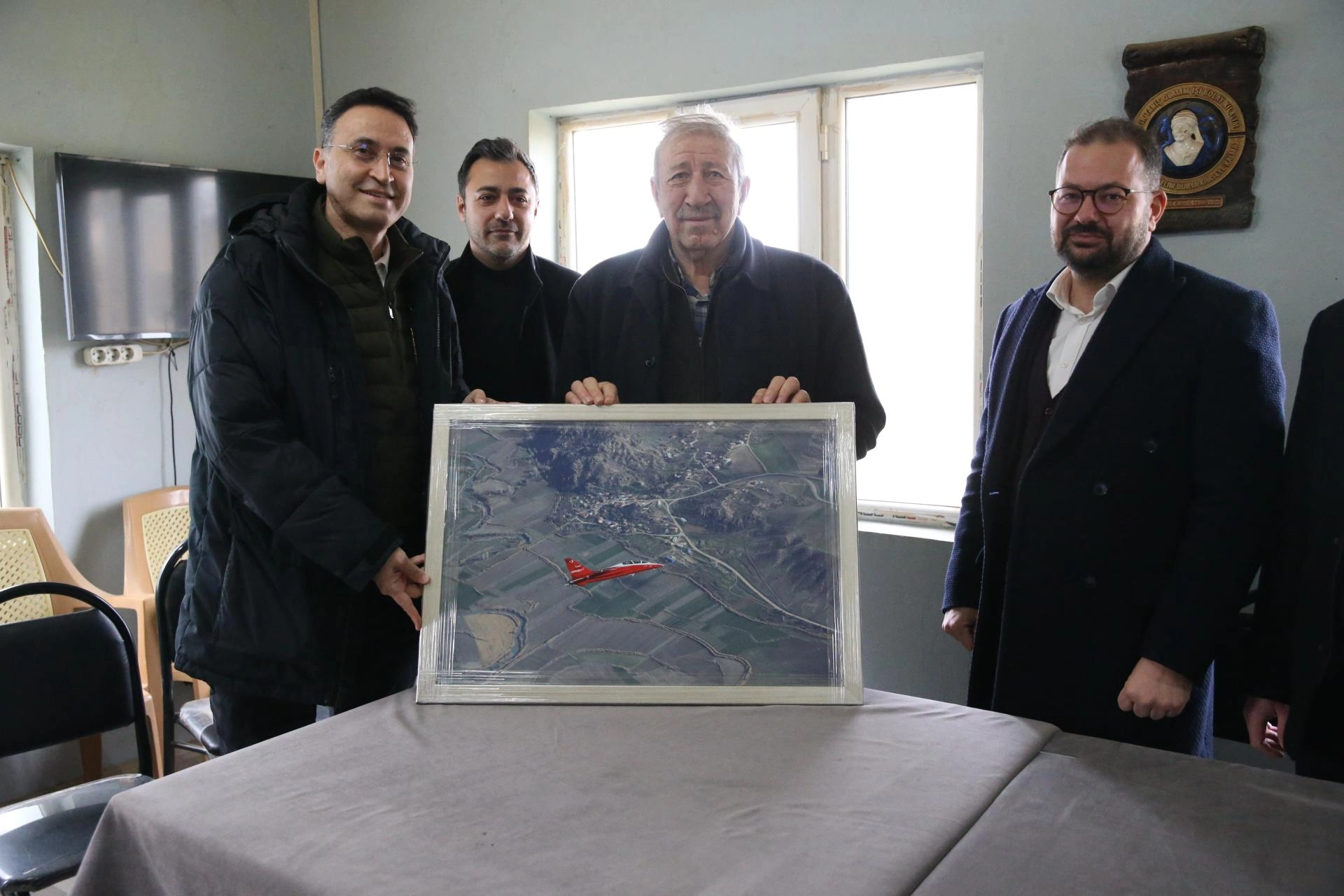 Mahalleye ziyarette bulunan TUSAŞ ekibi, Dümrek Mahallesi Muhtarı İbrahim Erbek ve vatandaşlarla bir araya geldi.